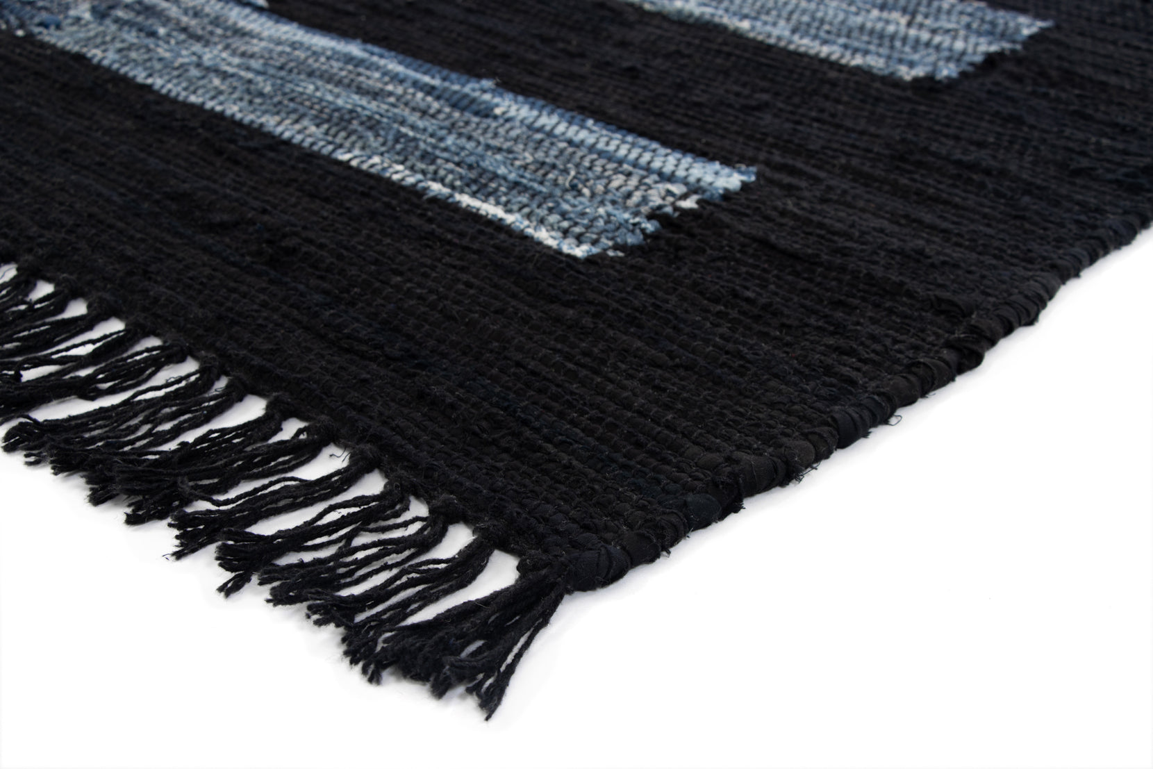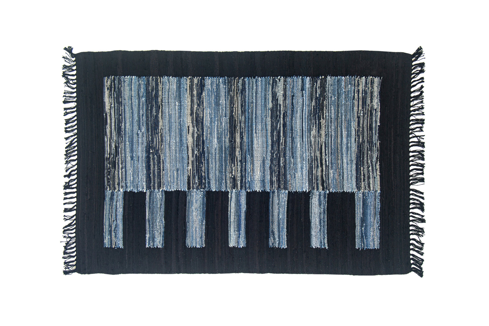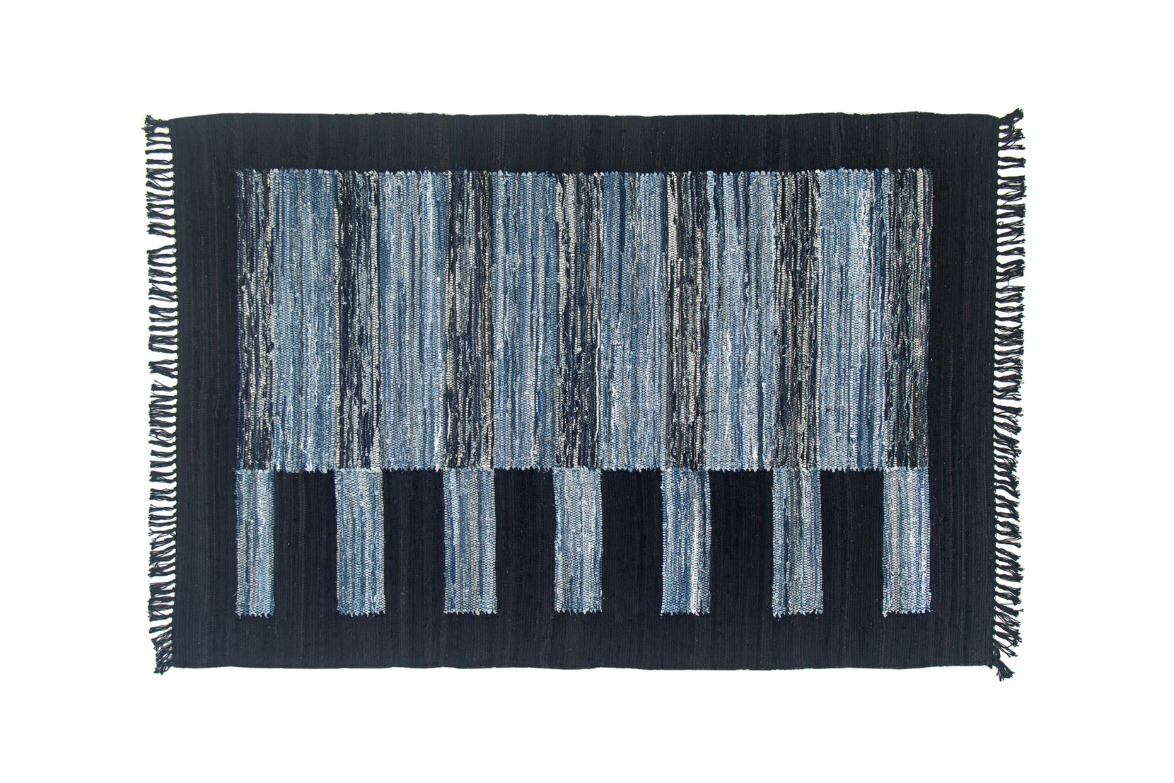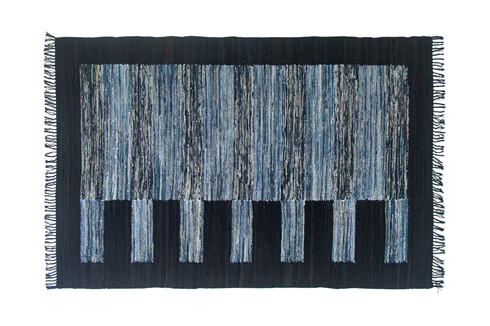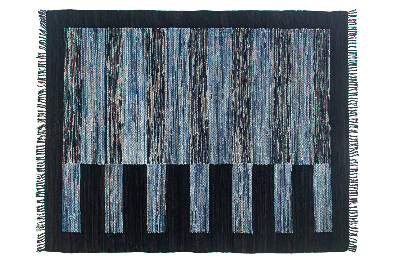 Denim is a sturdy cotton fabric whose twill weave creates a subtle diagonal ribbing, which sets it apart from other strong woven cotton textiles. In this piece, the weft is made of upcycled denim remnants left over from fashion industry production houses, and it's handwoven onto a cotton warp. Cotton is a vegetable fiber widely used across rug traditions because of its strength and longevity-it gets softer and more lovely with every wash.