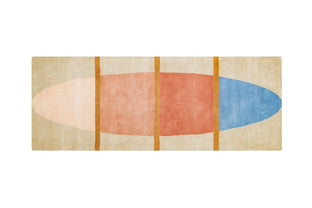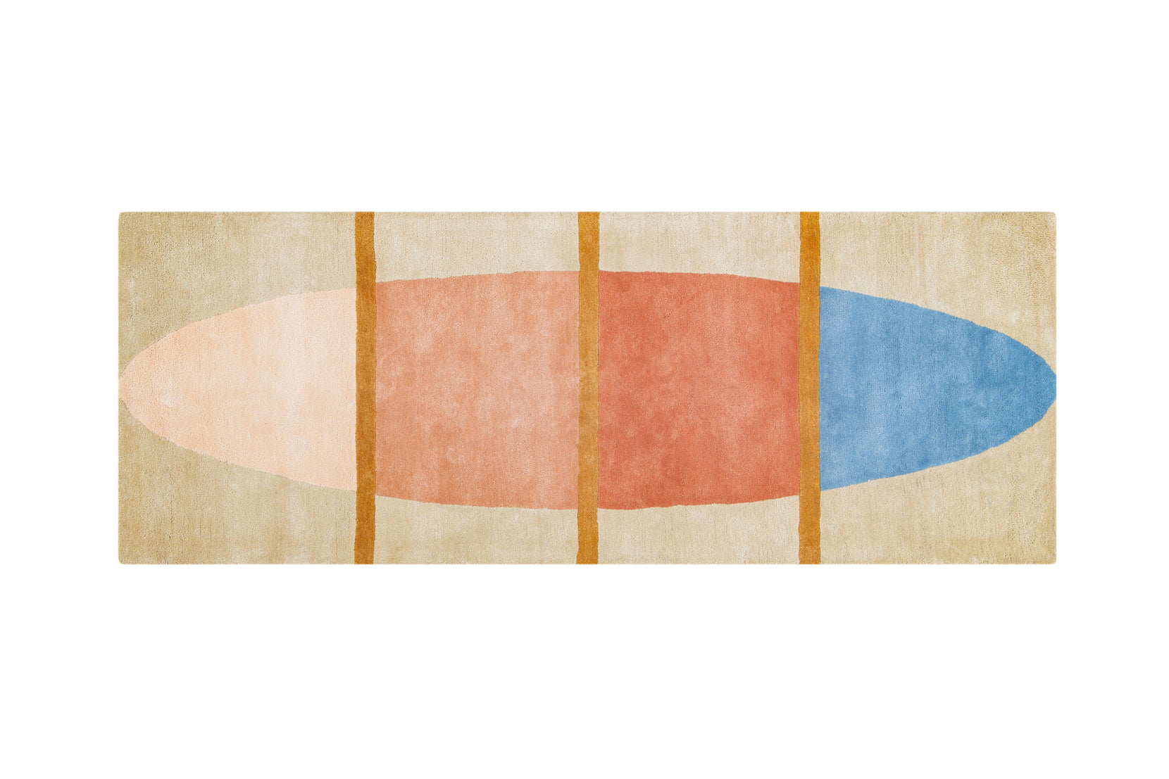 Color development was tricky as we originally started with just natural colors, but they were mucky. So we livened up the palette, ultimately creating designs which work well with our vintage pieces while introducing a playful geometry. Calisson is named for the French almond sweet of a similar shape, but it also looks like a surfboard.
