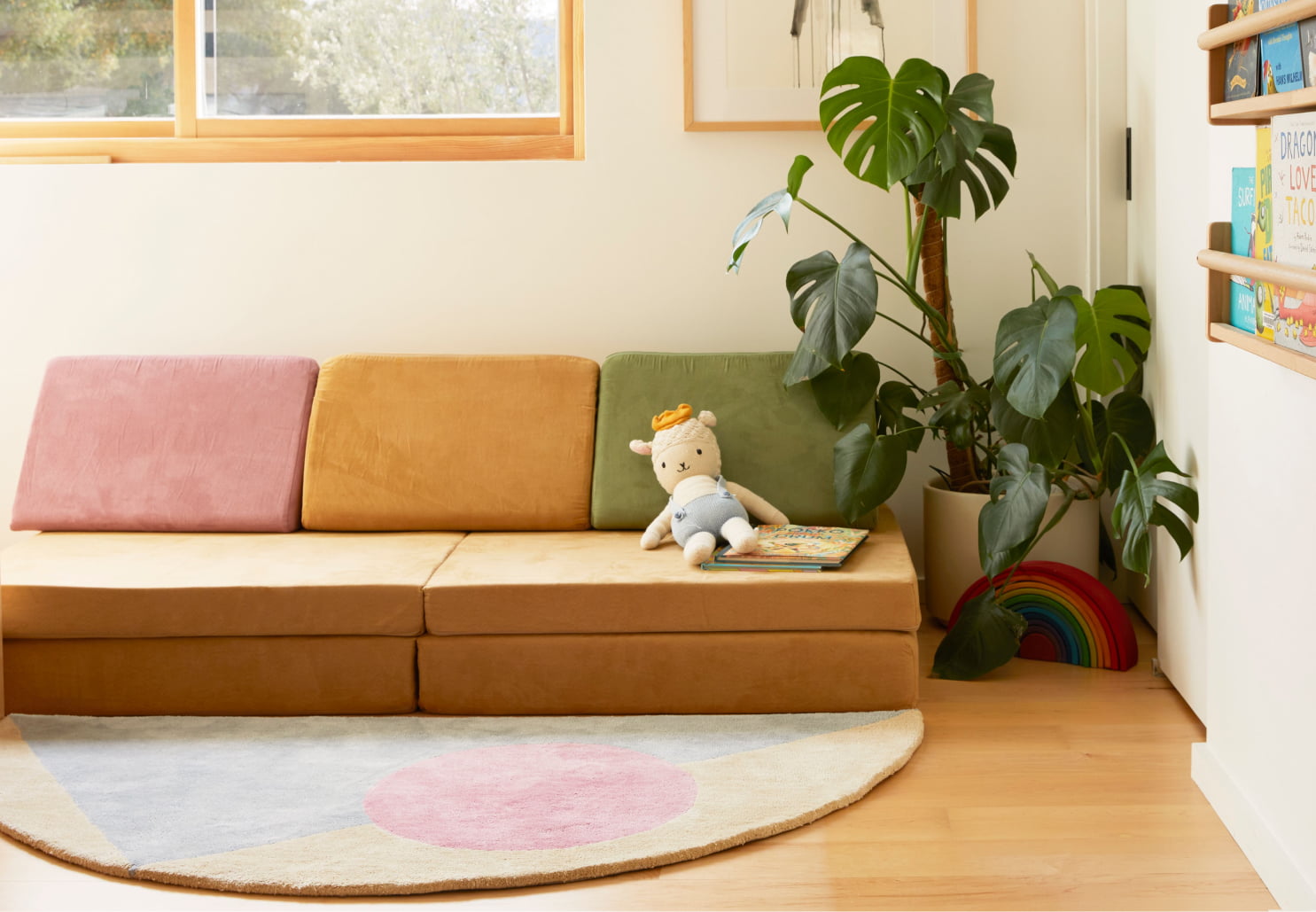 The absurdly soft Bon Bon rugs are hand-tufted, which allowed us to more easily make the kinds of shapes we wanted, and our design team had never seen tufted cotton that felt this lovely. Color palettes are drawn from vintage Southern California scenes-candy pinks and blues harken back to the fifties stucco, a combination of muted-fluorescent orange with sandy tan feels both bright and sun-faded. The prompt was, let's create fun, playful rugs for kids that grown-ups might steal for themselves. Everyone wants a nice treat.
