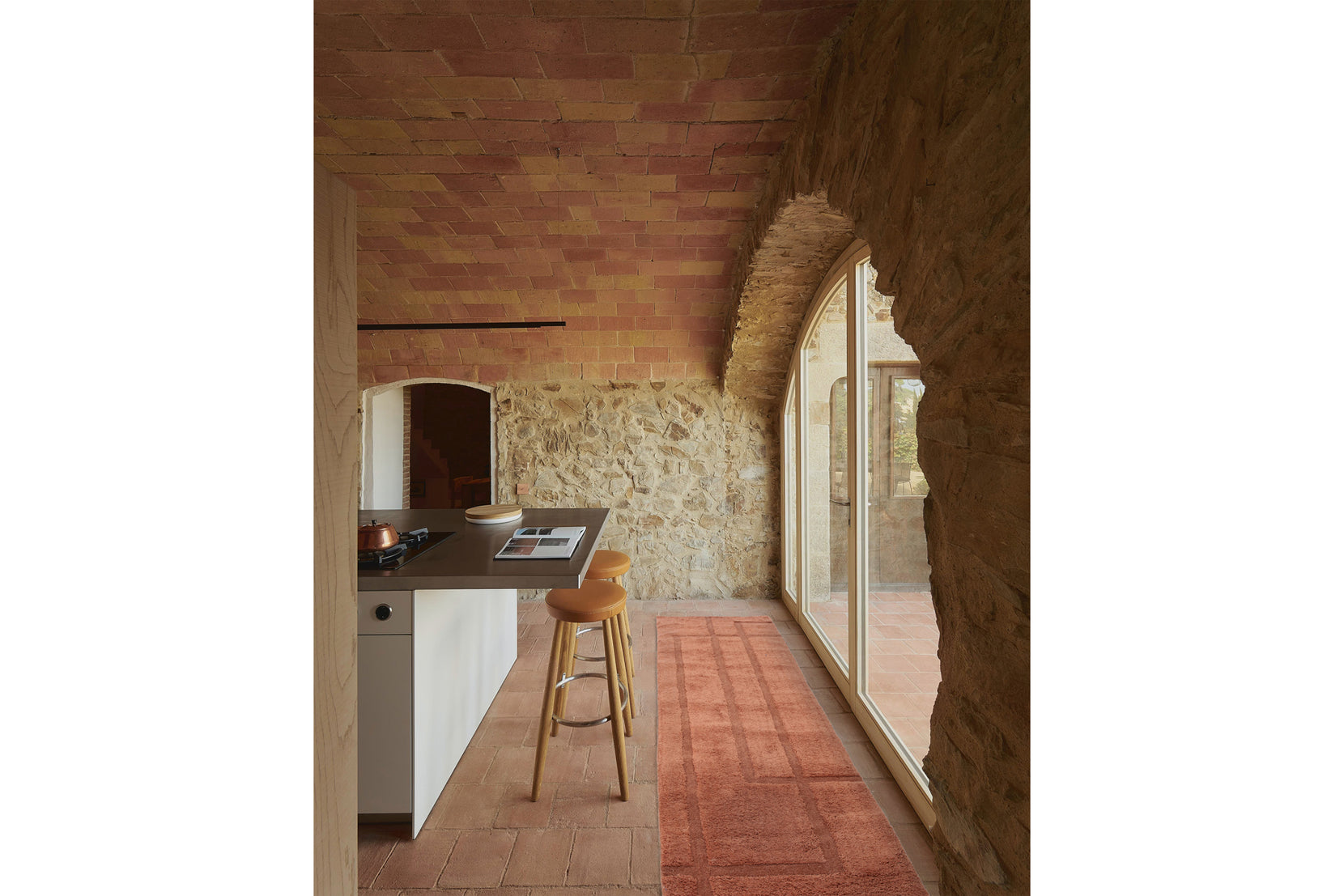 • Color palette: faded brick, rust red