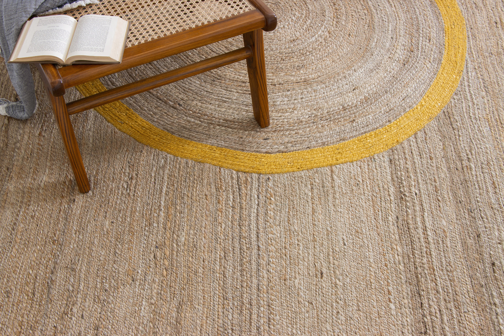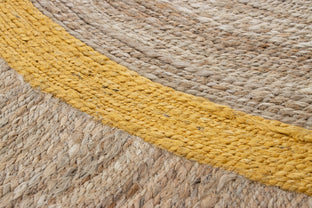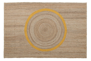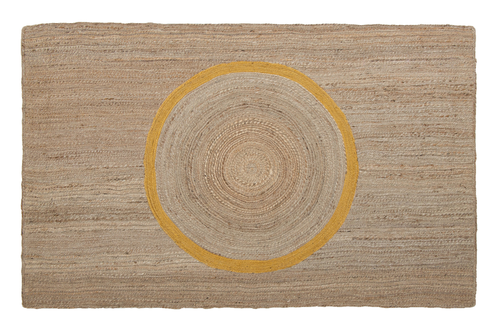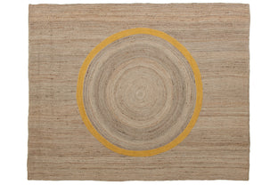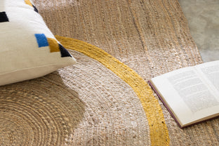 Sun's got a circular design at its core, made of spiraled natural jute and ringed in a lemon yellow border. It's a smart way to add circular movement to your room while still covering more of your floor.