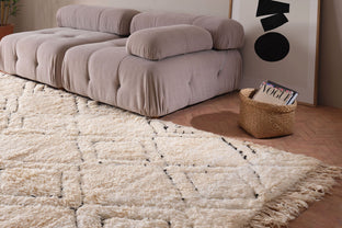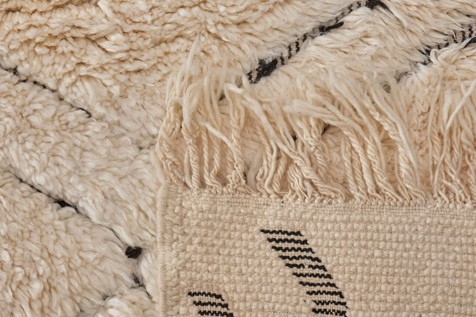 Material DetailsWool, a staple in Moroccan rug design, was considered almost sacred to the Amazigh (Berber) people, whose nomadic lifestyle included sheep and goat herding. In addition to being available, wool is durable, long-lasting, and soft—so it’s super comfy to walk and relax on. In this piece, the wool pile is knotted onto a wool foundation, adding body and helping it hug the floor.