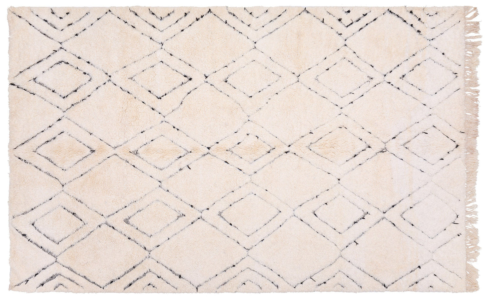 Moroccan wool is locally sourced and produces a thick, strong pile that feels soft and fluffy underfoot. A small amount of shedding is to be expected from this natural fiber, but it’s worth it: its high pile is beloved for its wild, tousled texture. You may find traces of dried hay, grass, or straw in your rug as grazing sheep often collect plant matter in their coats. Remove gently by hand or with tweezers. Please note that when wool gets damp, it will smell like a wet sheep. This is the scent of lanolin, which acts as a waxy barrier against dirt and moisture.