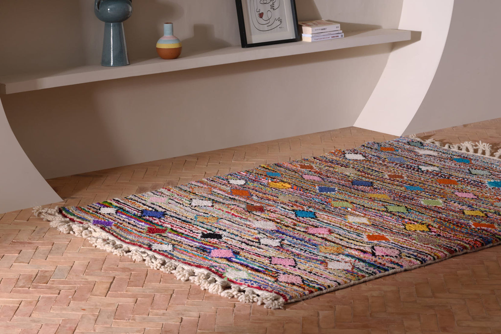 Moroccan wool is locally sourced and produces a thick, strong pile that feels soft and fluffy underfoot. A small amount of shedding is to be expected from this natural fiber, but it’s worth it: its high pile is beloved for its wild, tousled texture. You may find traces of dried hay, grass, or straw in your rug as grazing sheep often collect plant matter in their coats. Remove gently by hand or with tweezers. Please note that when wool gets damp, it will smell like a wet sheep. This is the scent of lanolin, which acts as a waxy barrier against dirt and moisture.