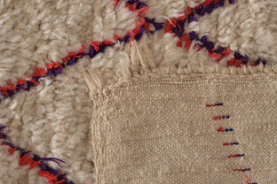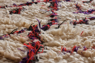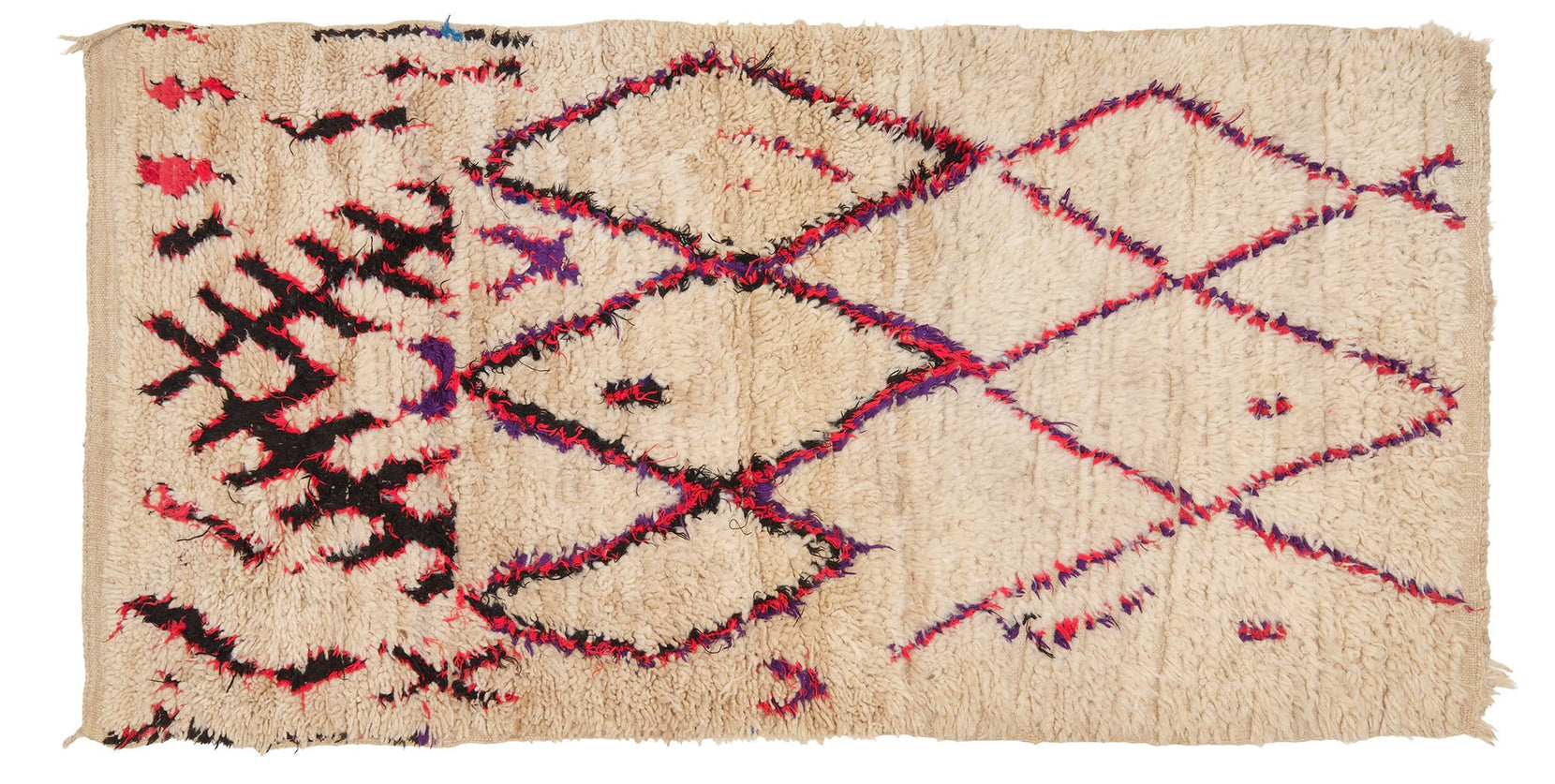 Azilal rugs typically have abstract, painterly designs, and are similar to rugs from Ourika. These pieces can be distinguished by their bright colors, facilitated by the use of cotton in addition to wool.