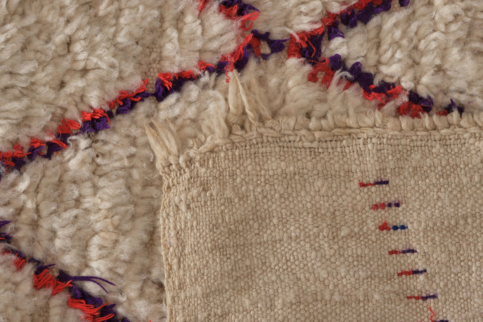 Material DetailsWool, a staple in Moroccan rug design, was considered almost sacred to the Amazigh (Berber) people, whose nomadic lifestyle included sheep and goat herding. In addition to being available, wool is durable, long-lasting, and soft—so it’s super comfy to walk and relax on. In this piece, the wool pile is knotted onto a wool foundation, adding body and helping it hug the floor.