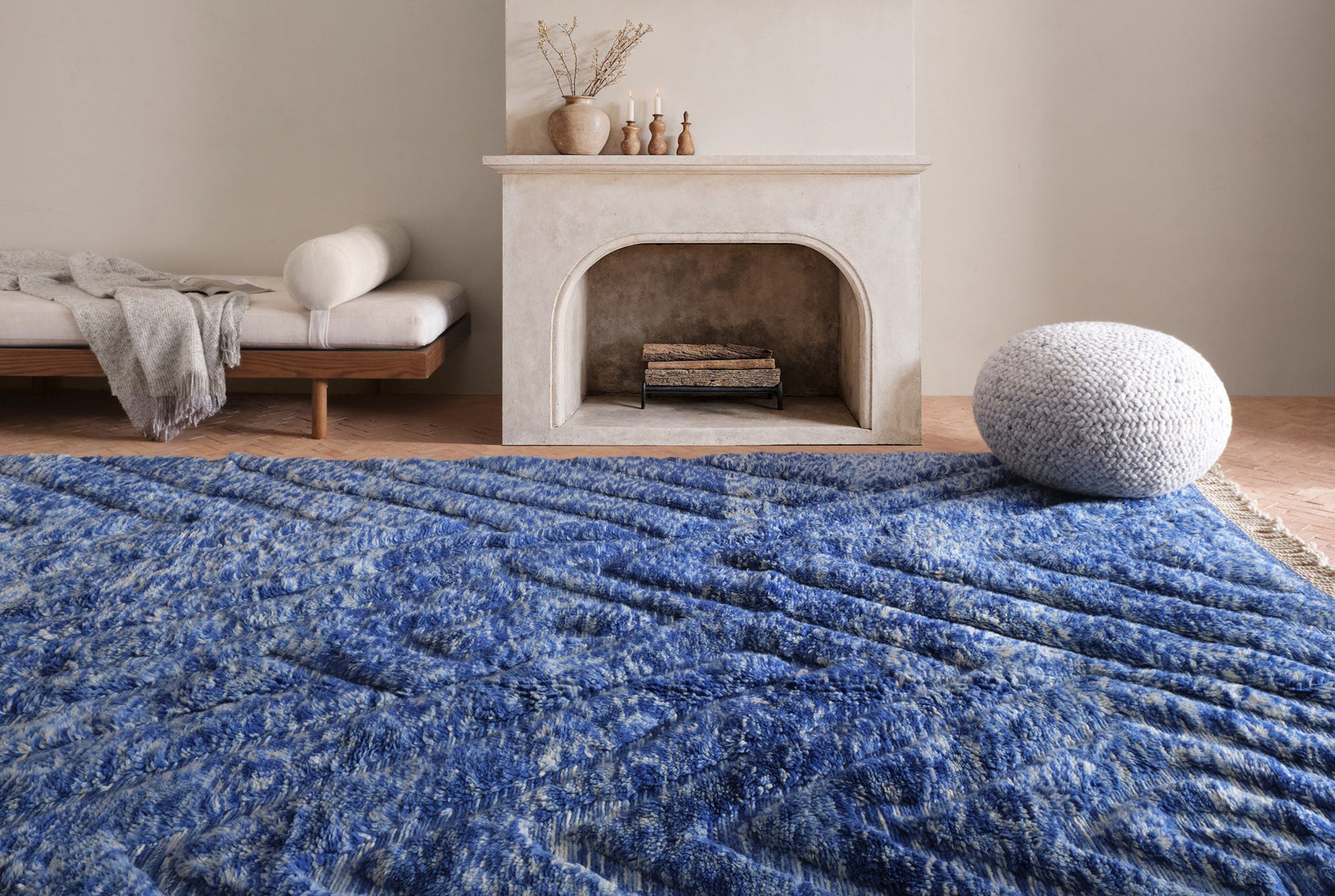 Moroccan wool is locally sourced and produces a thick, strong pile that feels soft and fluffy underfoot. A small amount of shedding is to be expected from this natural fiber, but it’s worth it: its high pile is beloved for its wild, tousled texture. You may find traces of dried hay, grass, or straw in your rug as grazing sheep often collect plant matter in their coats. Remove gently by hand or with tweezers. Please note that when wool gets damp, it will smell like a wet sheep. This is the scent of lanolin, which acts as a waxy barrier against dirt and moisture.
