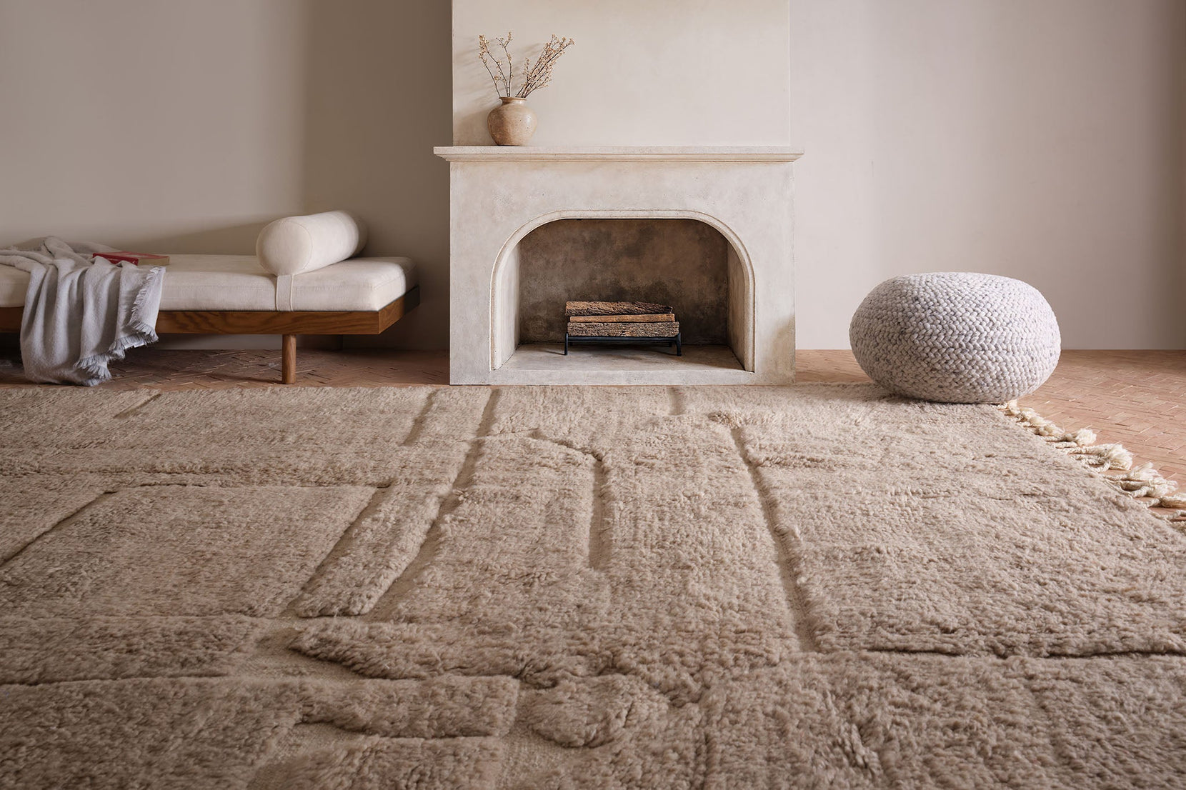 Moroccan wool is locally sourced and produces a thick, strong pile that feels soft and fluffy underfoot. A small amount of shedding is to be expected from this natural fiber, but it’s worth it: its high pile is beloved for its wild, tousled texture. You may find traces of dried hay, grass, or straw in your rug as grazing sheep often collect plant matter in their coats. Remove gently by hand or with tweezers. Please note that when wool gets damp, it will smell like a wet sheep. This is the scent of lanolin, which acts as a waxy barrier against dirt and moisture.