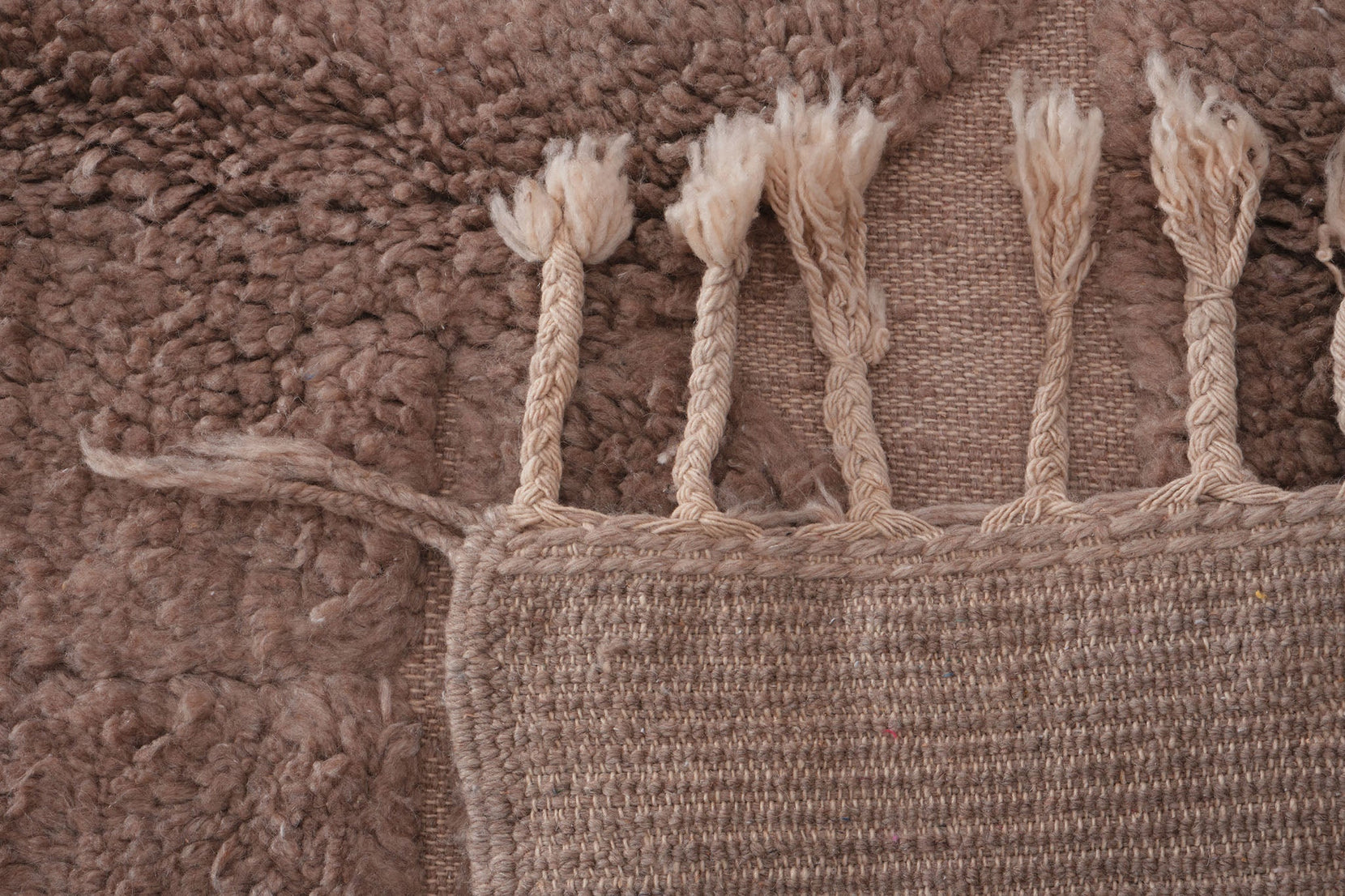 Wool, a staple in Moroccan rug design, was considered almost sacred to the Amazigh (Berber) people, whose nomadic lifestyle included sheep and goat herding. In addition to being available, wool is durable, long-lasting, and soft—so it’s super comfy to walk and relax on. In this piece, the wool pile is knotted onto a wool foundation, adding body and helping it hug the floor.