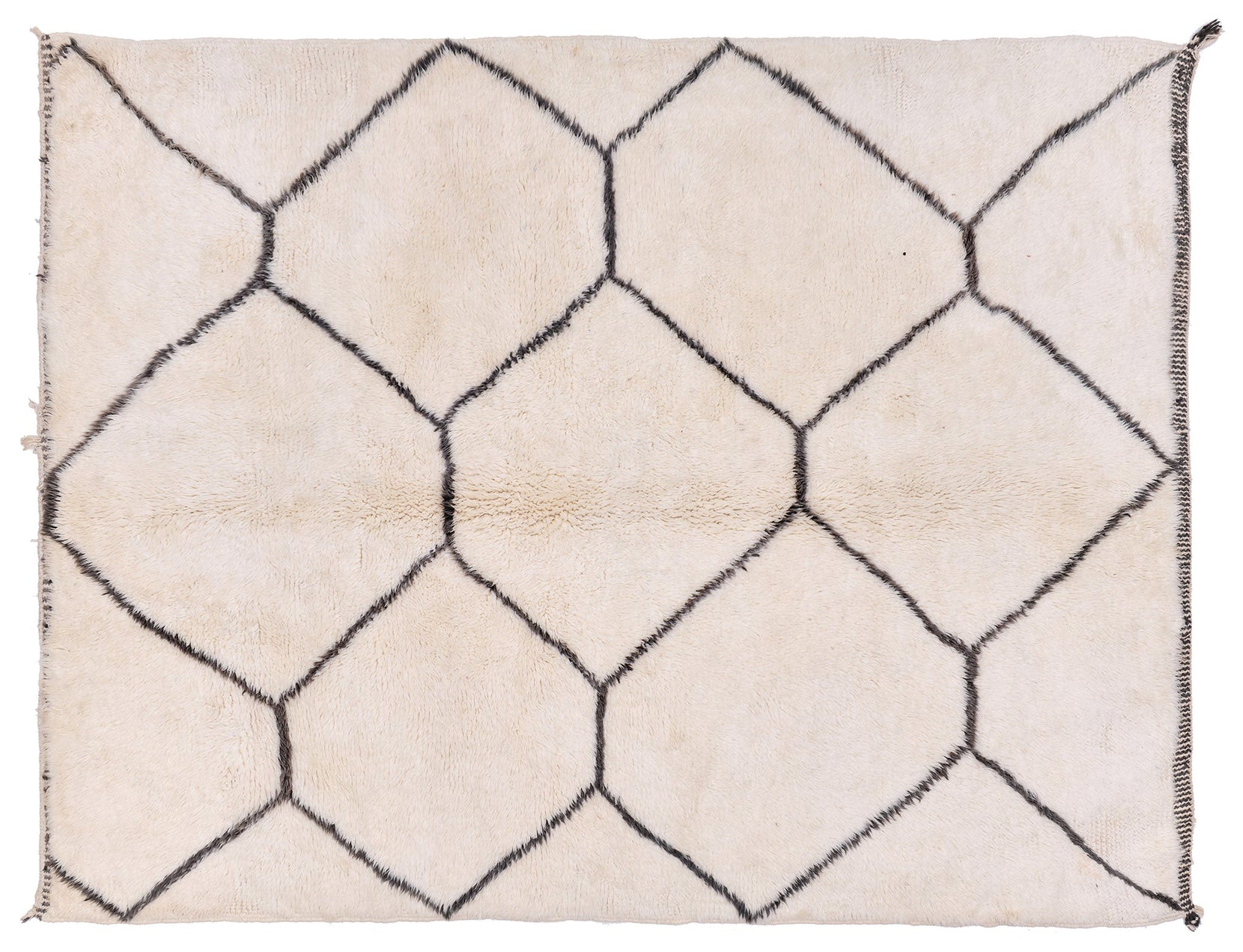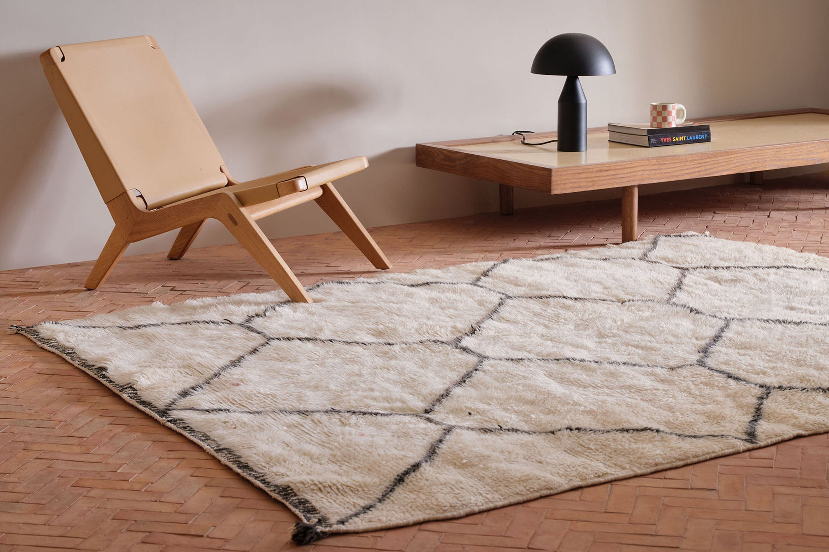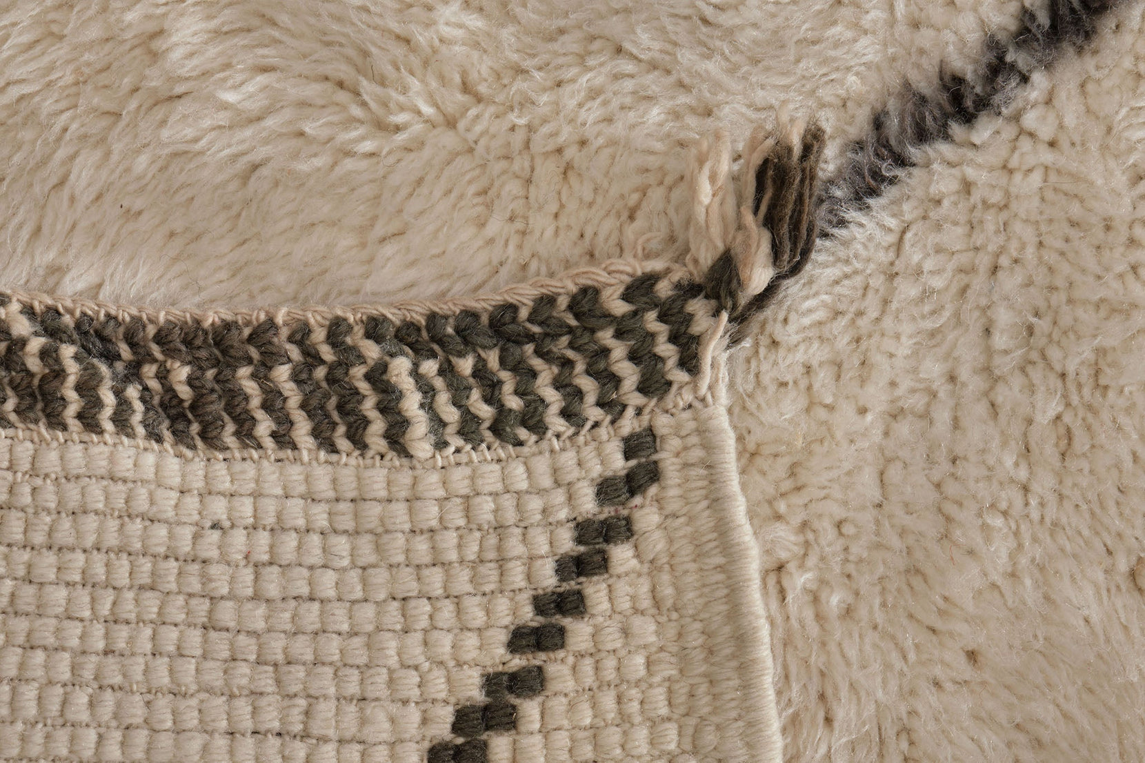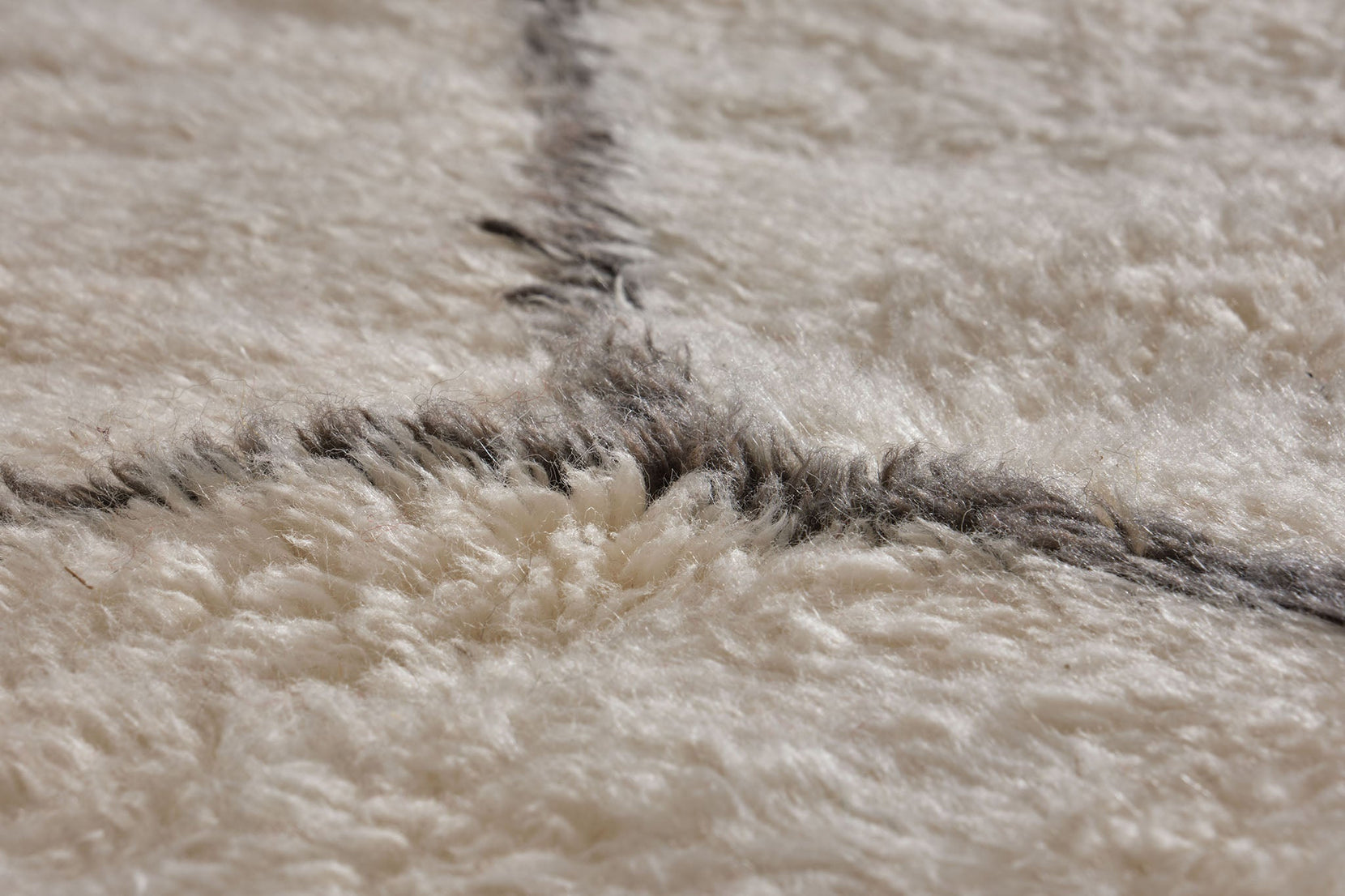 Wool, a staple in Moroccan rug design, was considered almost sacred to the Amazigh (Berber) people, whose nomadic lifestyle included sheep and goat herding. In addition to being available, wool is durable, long-lasting, and soft—so it’s super comfy to walk and relax on. In this piece, the wool pile is knotted onto a wool foundation, adding body and helping it hug the floor.