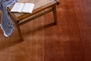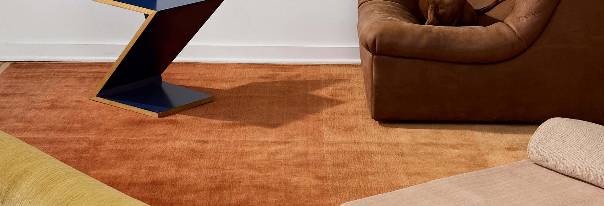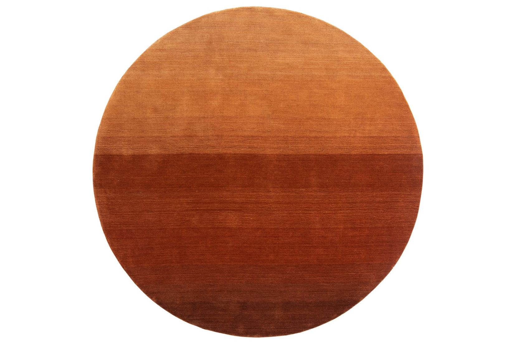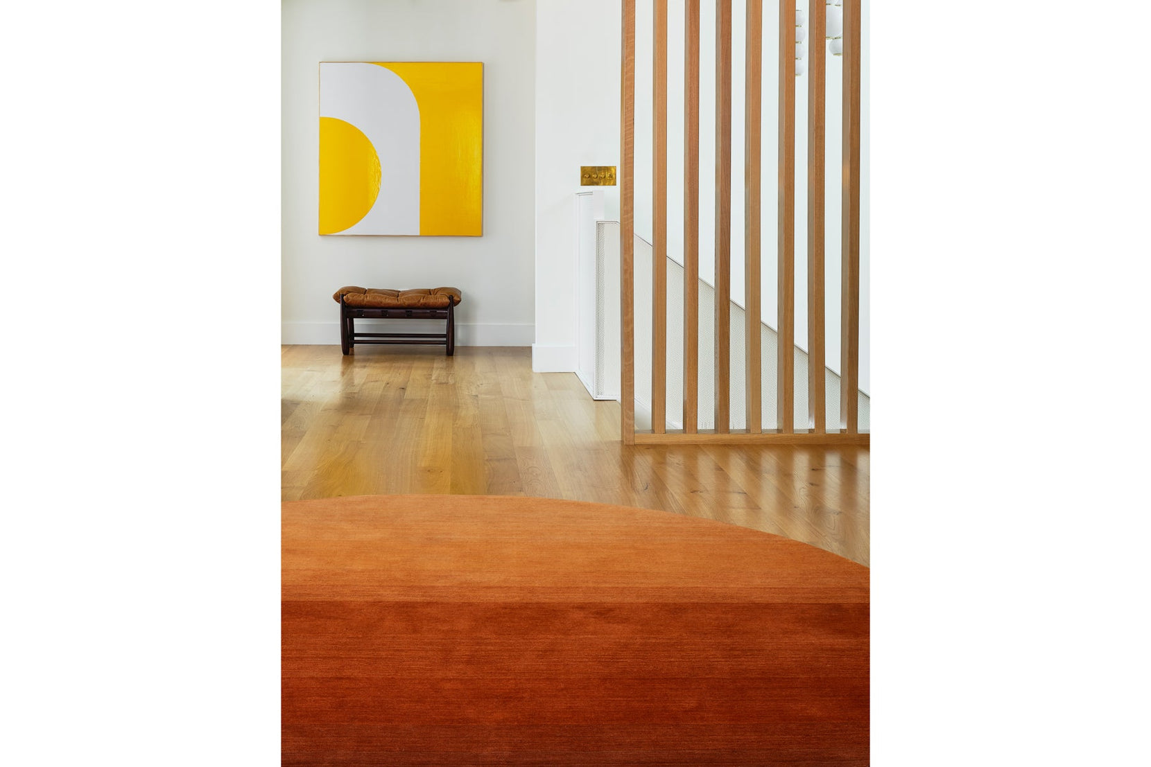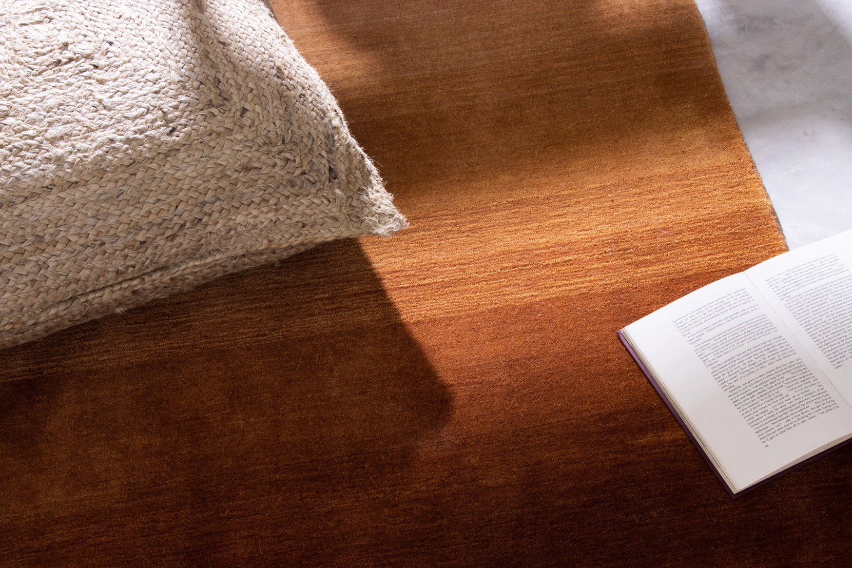 These rugs feature a subtle, striking fade from pale to deeper hues. Noon is a deep, fiery piece, beginning in an almost rust red and transforming into shades of soft tangerine.