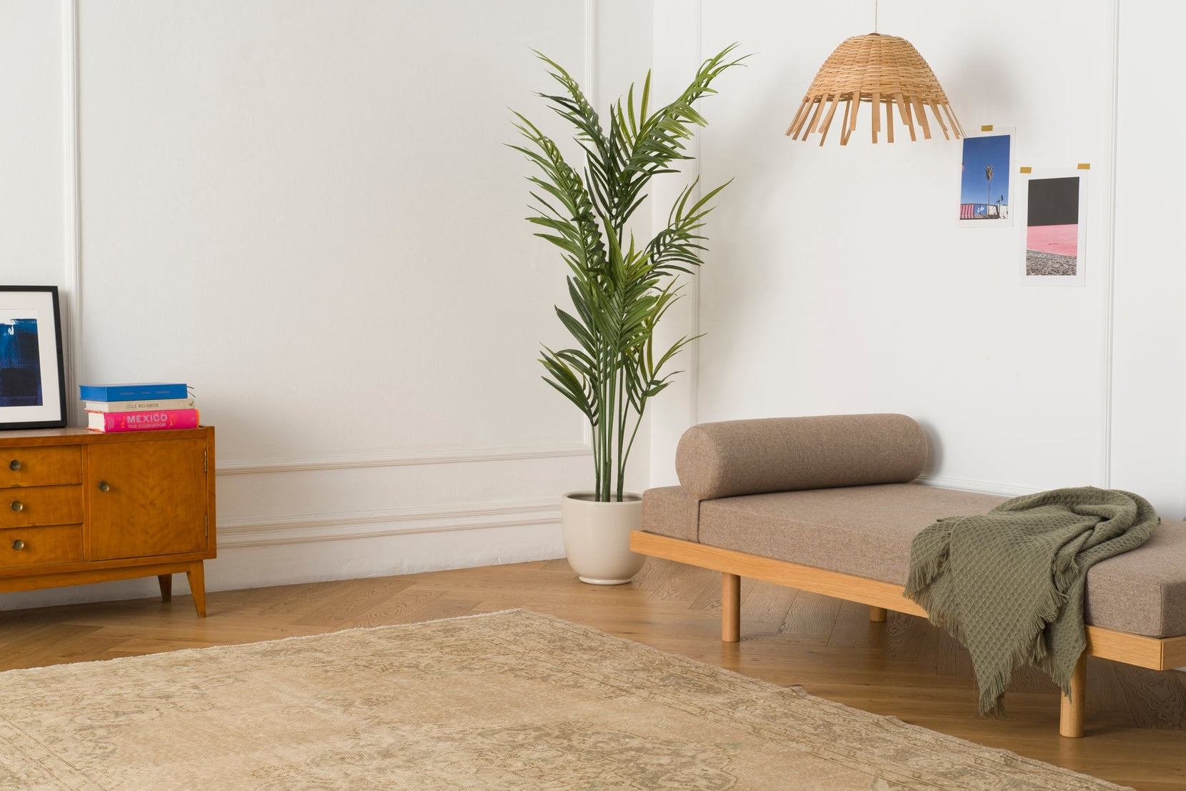 - Color palette: warm vanilla beige, pale sage gray, taupe