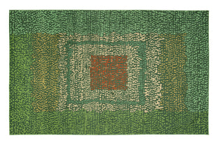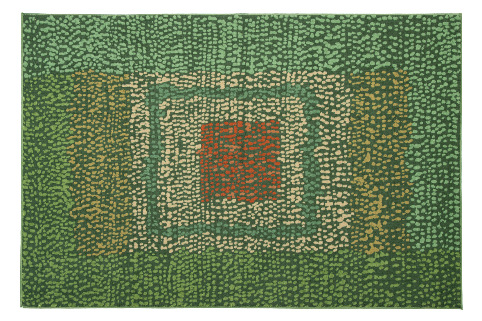 This collection is all about the dot! Our team was inspired by the imperfect nature of the circle and its presence throughout history and culture. Contrasting colors are used to delineate lines, angles, and shapes, creating patterns within each dotted piece. Concentric squares in varying shades of green surround Mizzle’s orange center.
