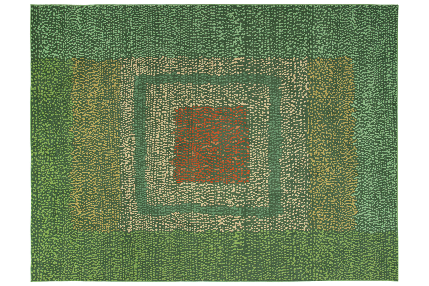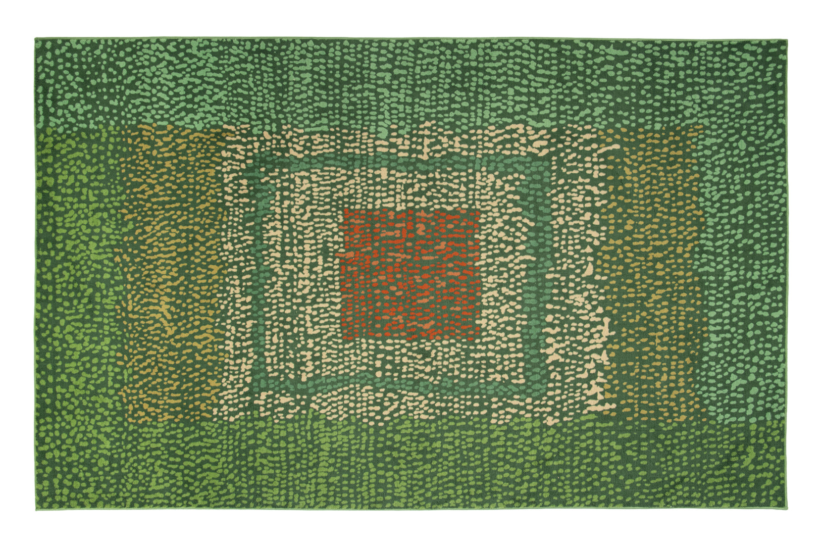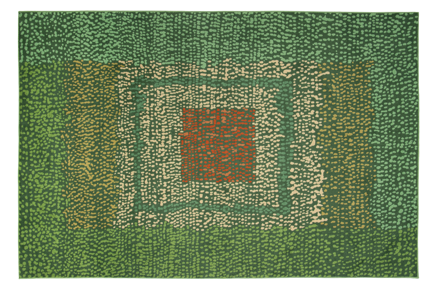 This collection is all about the dot! Our team was inspired by the imperfect nature of the circle and its presence throughout history and culture. Contrasting colors are used to delineate lines, angles, and shapes, creating patterns within each dotted piece. Concentric squares in varying shades of green surround Mizzle’s orange center.