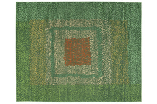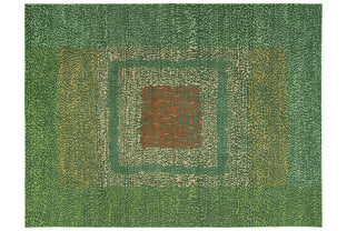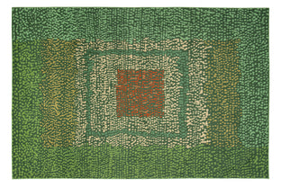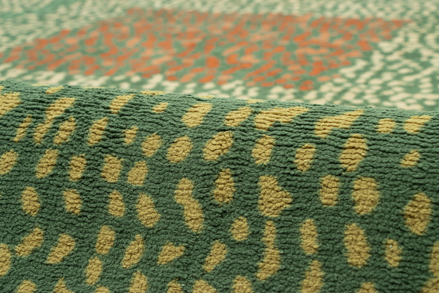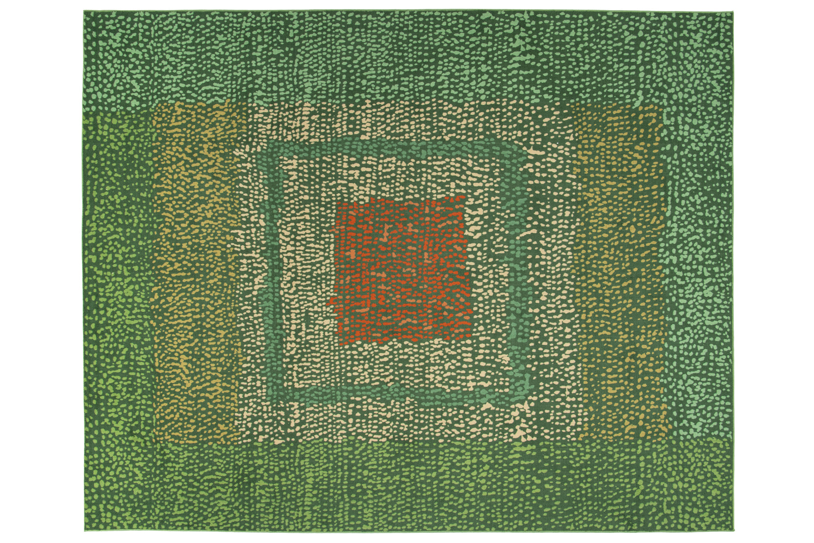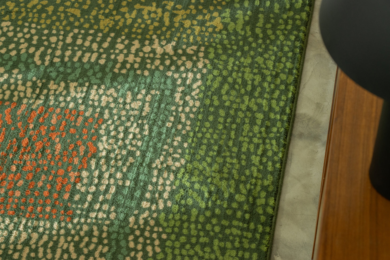 This collection is all about the dot! Our team was inspired by the imperfect nature of the circle and its presence throughout history and culture. Contrasting colors are used to delineate lines, angles, and shapes, creating patterns within each dotted piece. Concentric squares in varying shades of green surround Mizzle’s orange center.