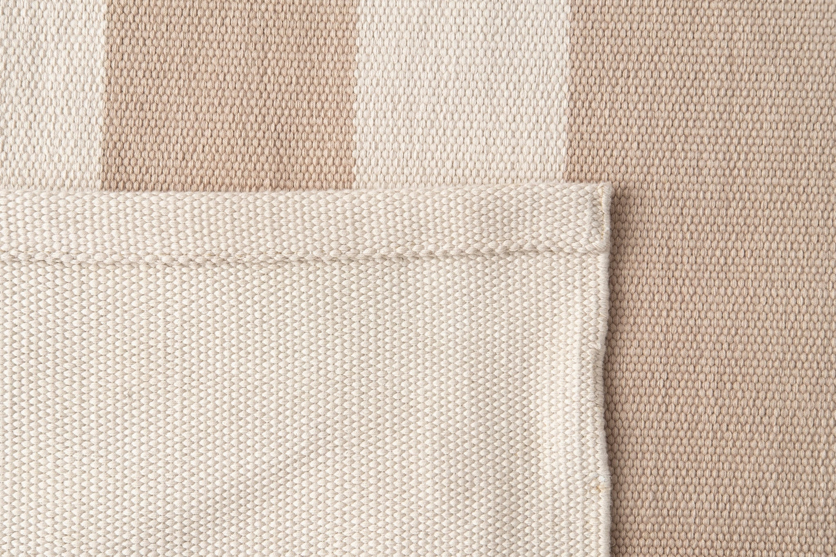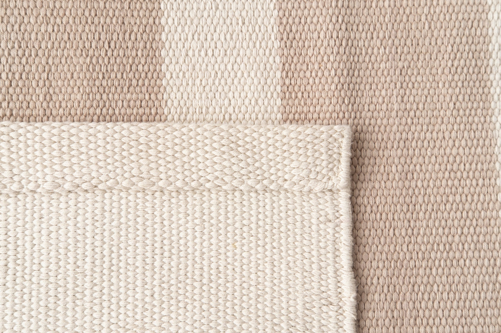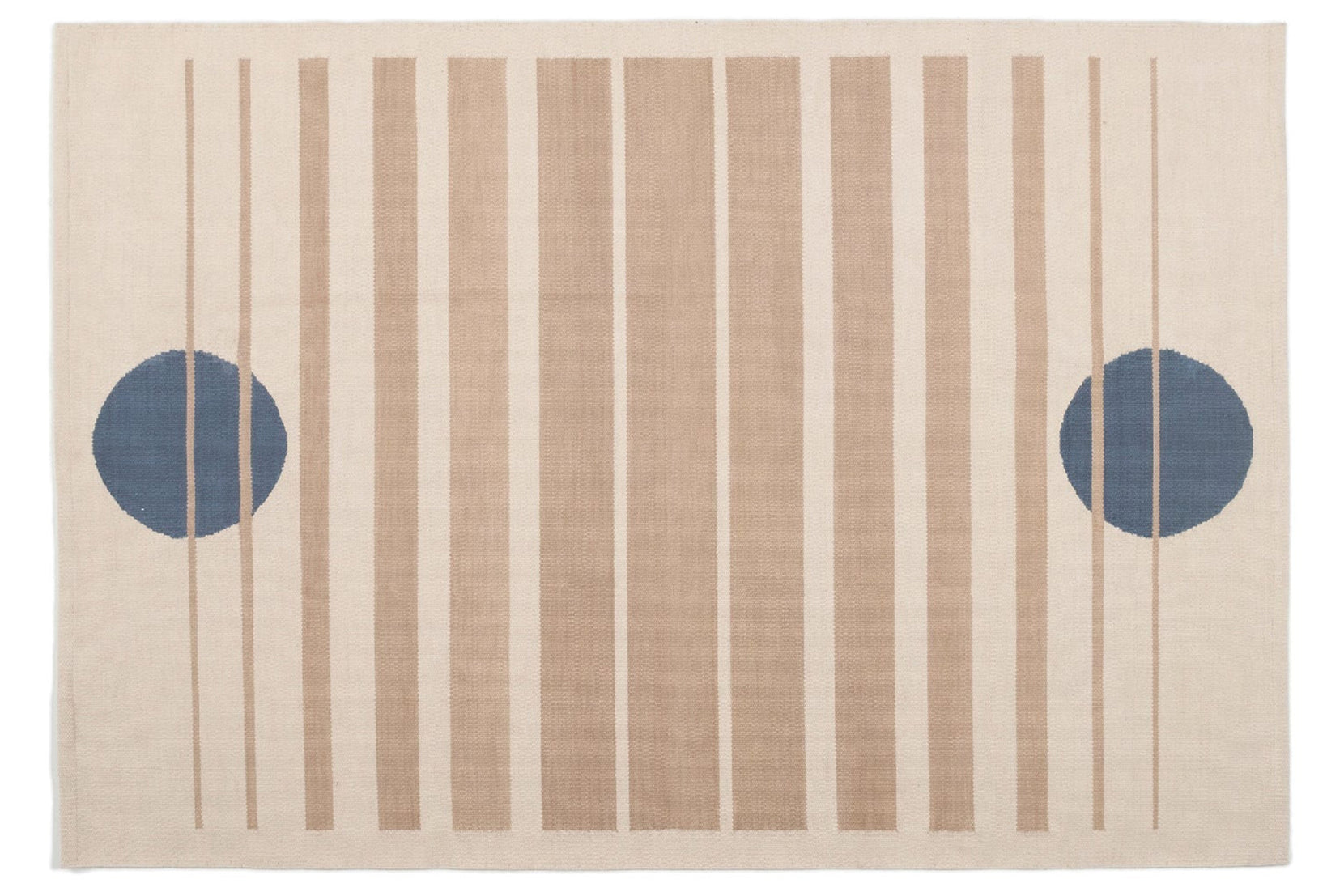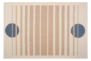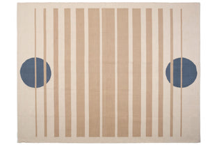 Cotton dhurries are classic Indian flatwoven rugs, designed to be lightweight and portable, cold in summer, warm in winter. Stripes are a standard dhurrie design, and ours are no exception. Leaping features a balanced circle at either end, like two moons, overlaid by stripes of varying width.