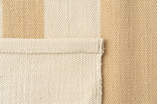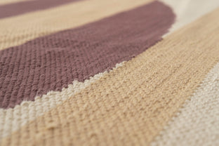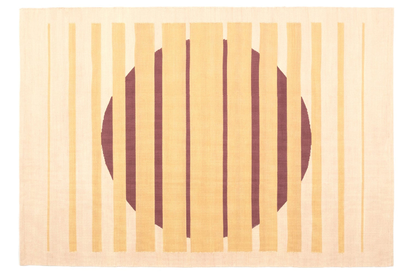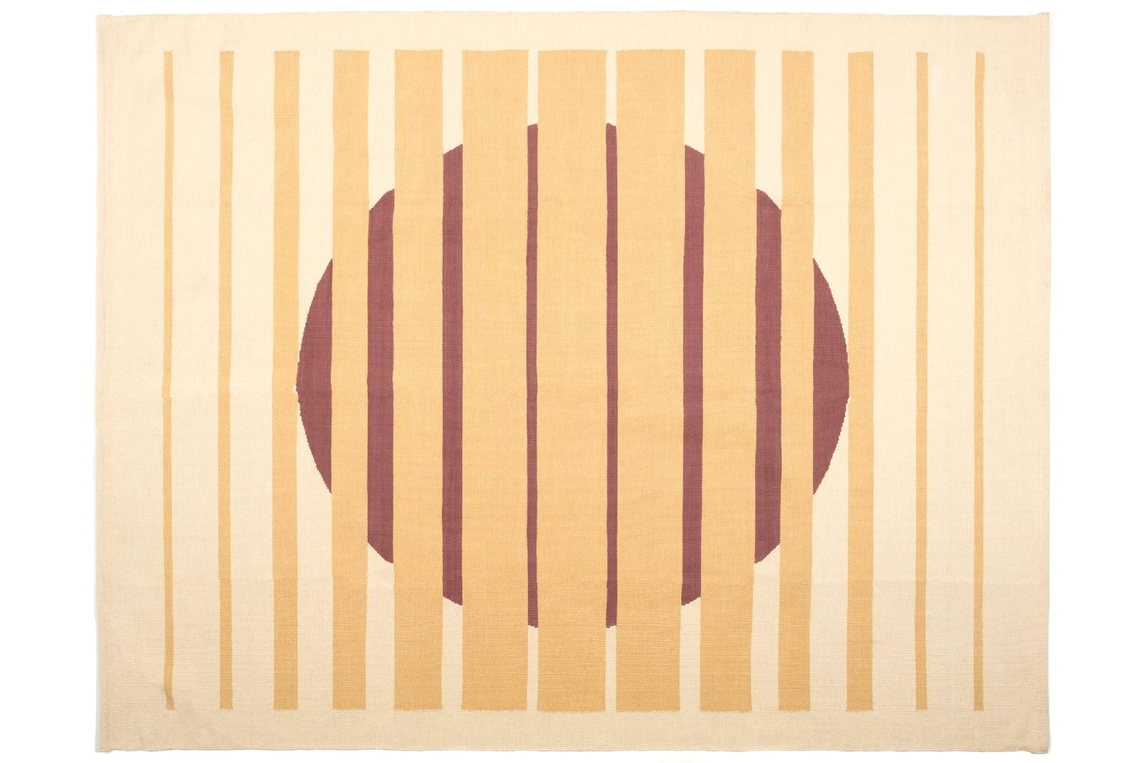 Cotton dhurries are classic Indian flatwoven rugs, designed to be lightweight and portable, cold in summer, warm in winter. Stripes are a standard dhurrie design, and ours are no exception. Peeking has a large reddish-brown sun-like circle, shining through stripes.
