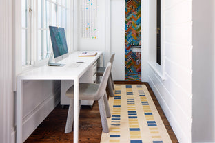 Cotton dhurries are classic Indian flatwoven rugs, designed to be lightweight and portable, cold in summer, warm in winter. Stripes are a standard dhurrie design, and ours are no exception. Tapping is a runner with varied sized rectangles, reminiscent of morse code or dance steps.