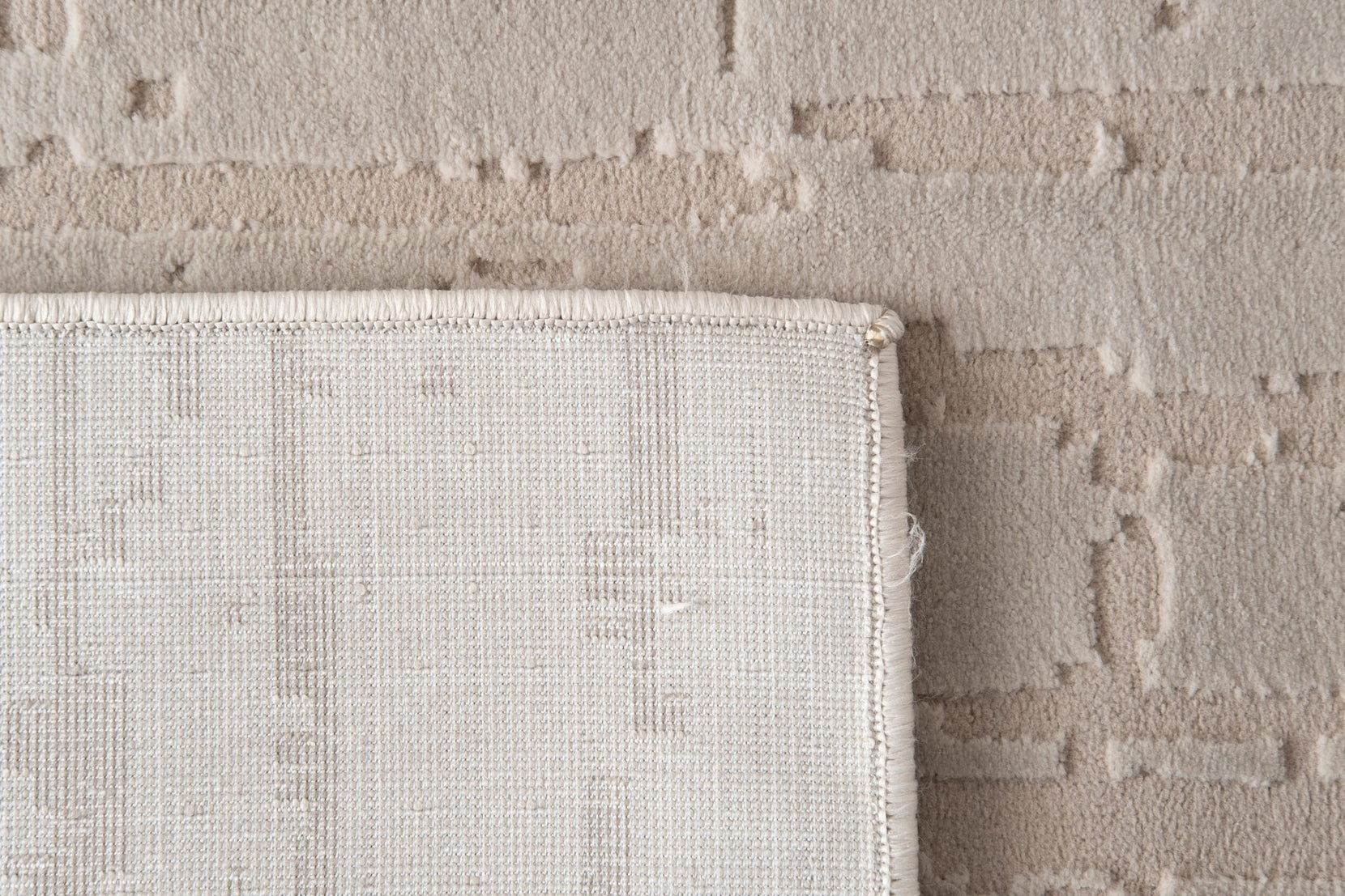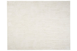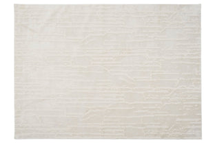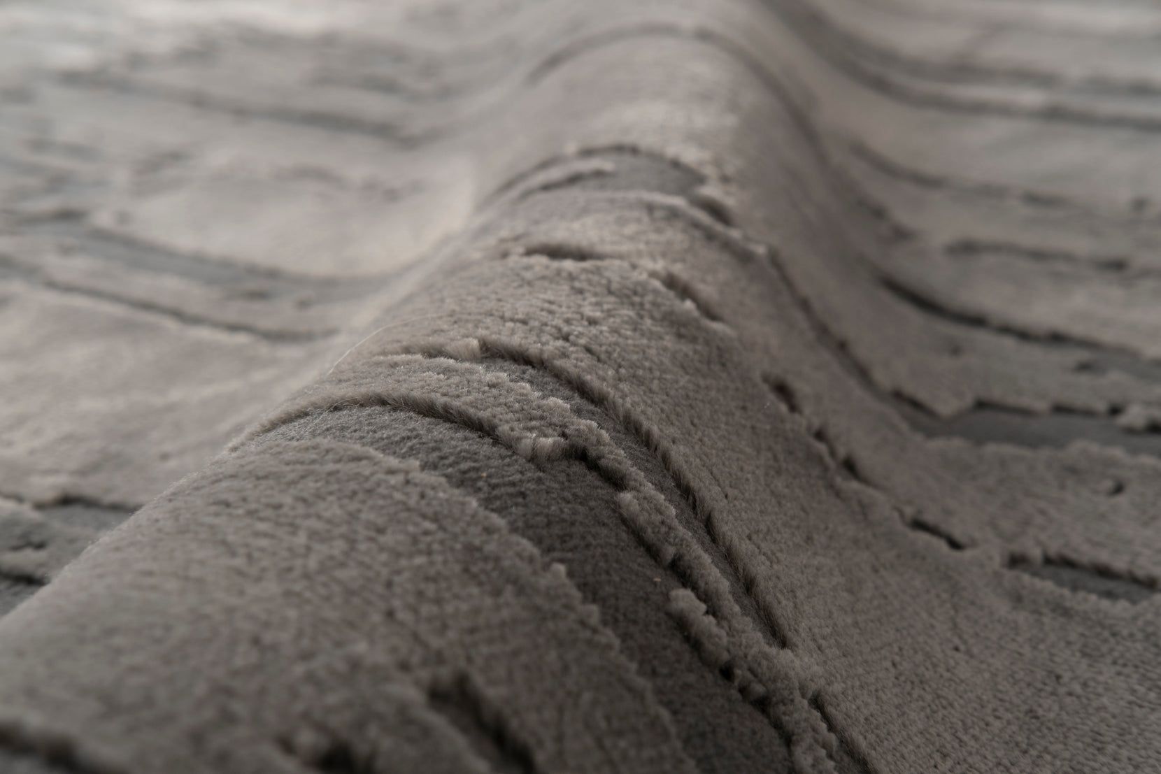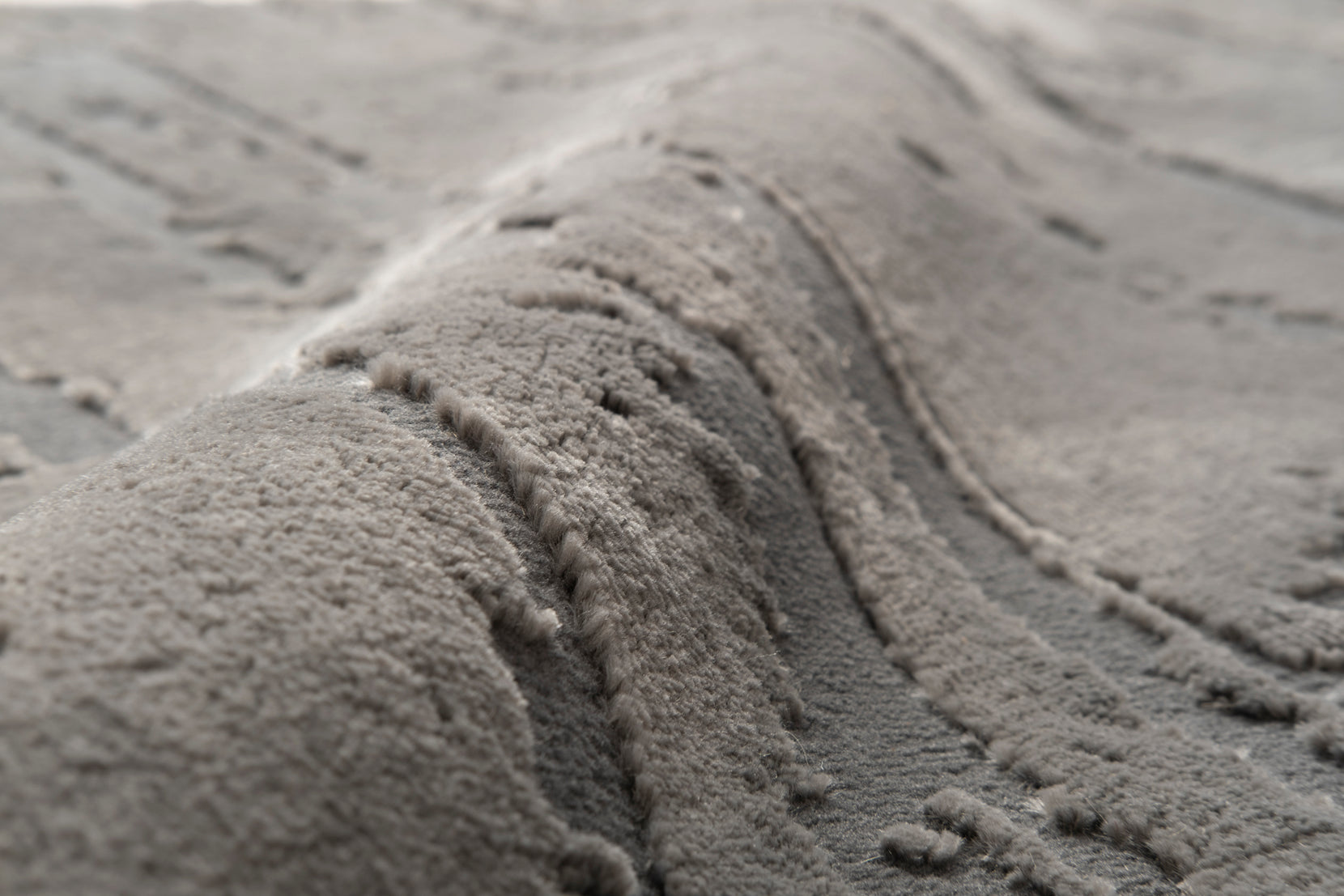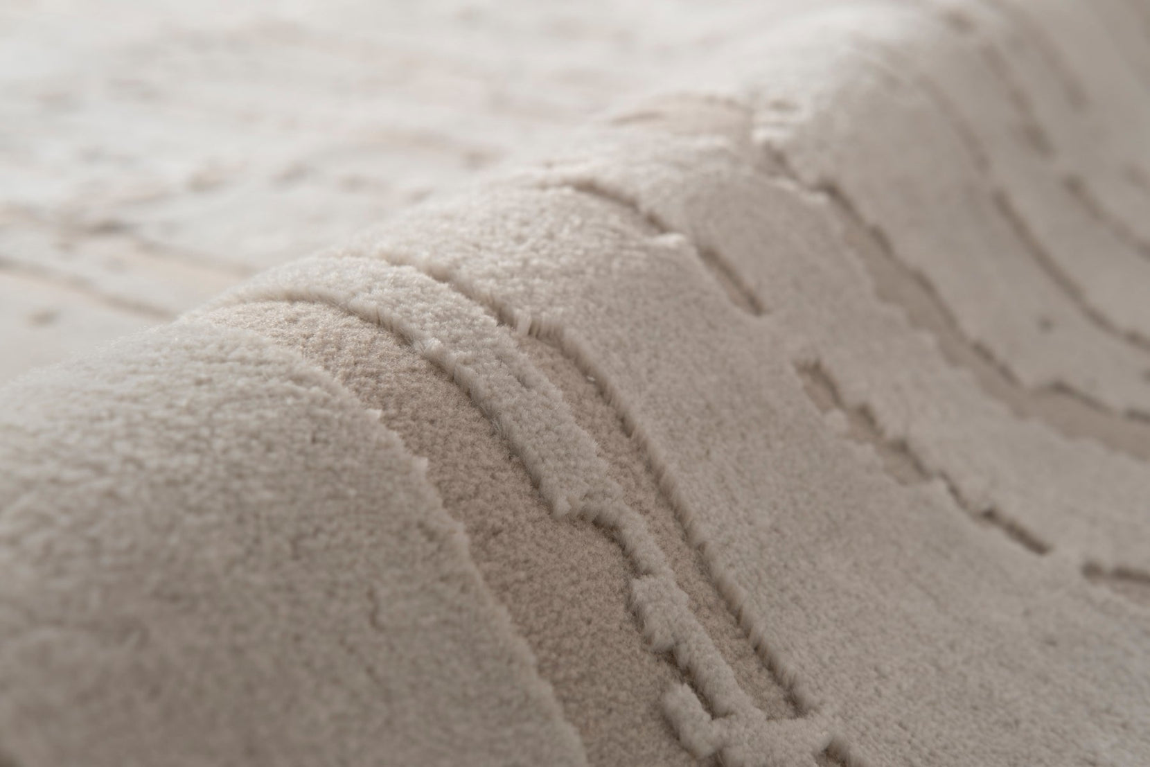 The DesignEbb is a solid-color rug with an all-over abstract, meandering stripe in relief, like lightning or rivulets. Its tone-on-tone effect is inspired by the accidental designs of beach tides: the smoothness of seashells eroded over time, imprints left by waves on sand, the organic textures of corals and rocks.