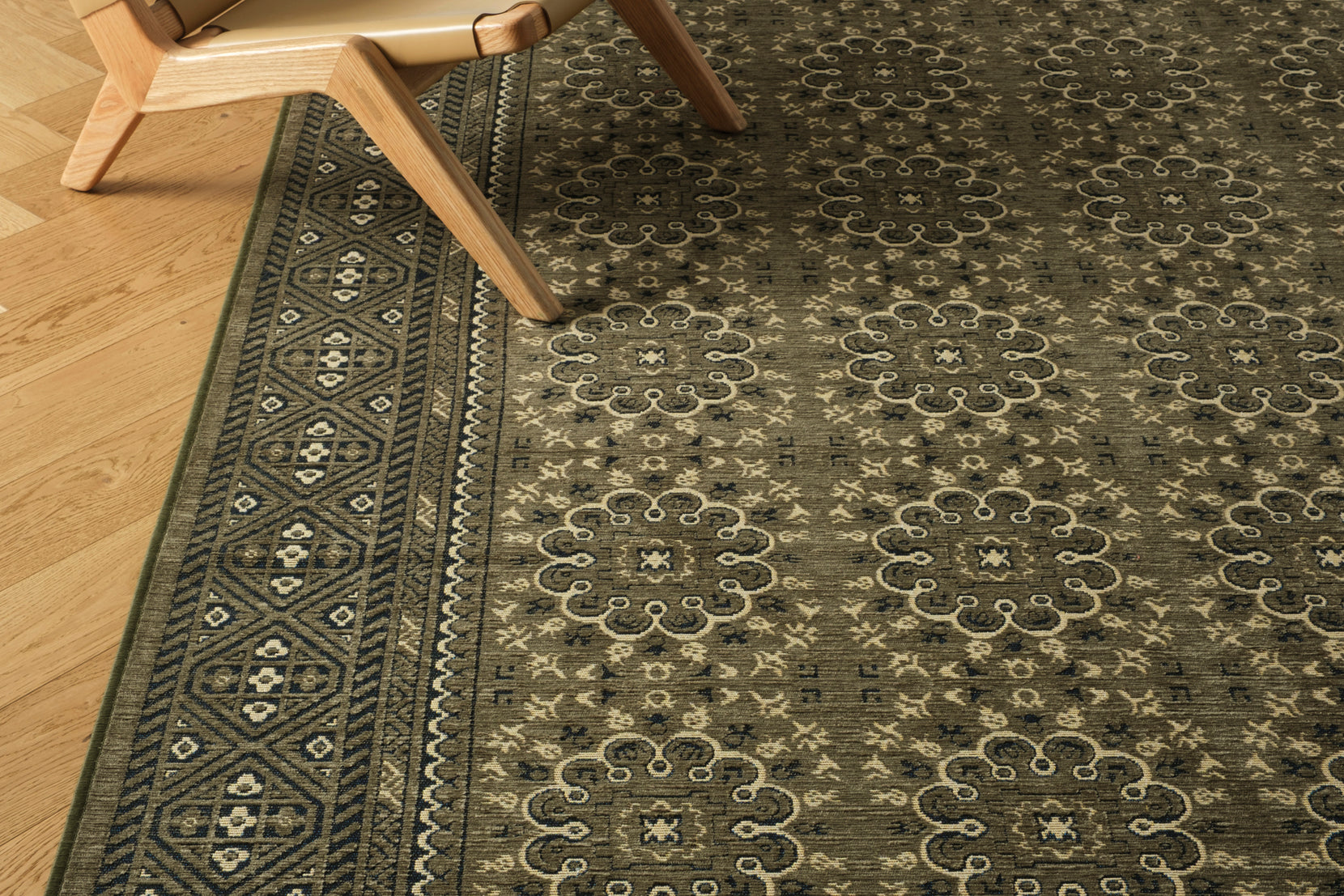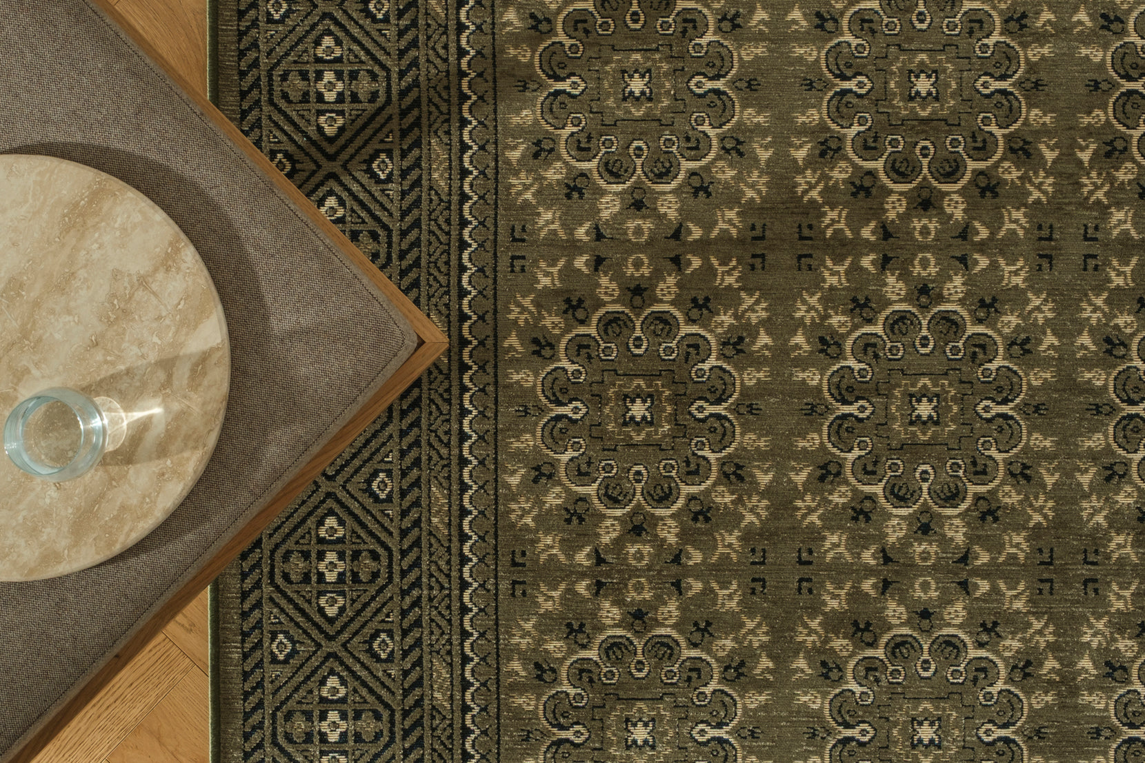 - Color palette: olive green, inky black, bone beige, golden yellow, warm vanilla beige