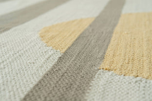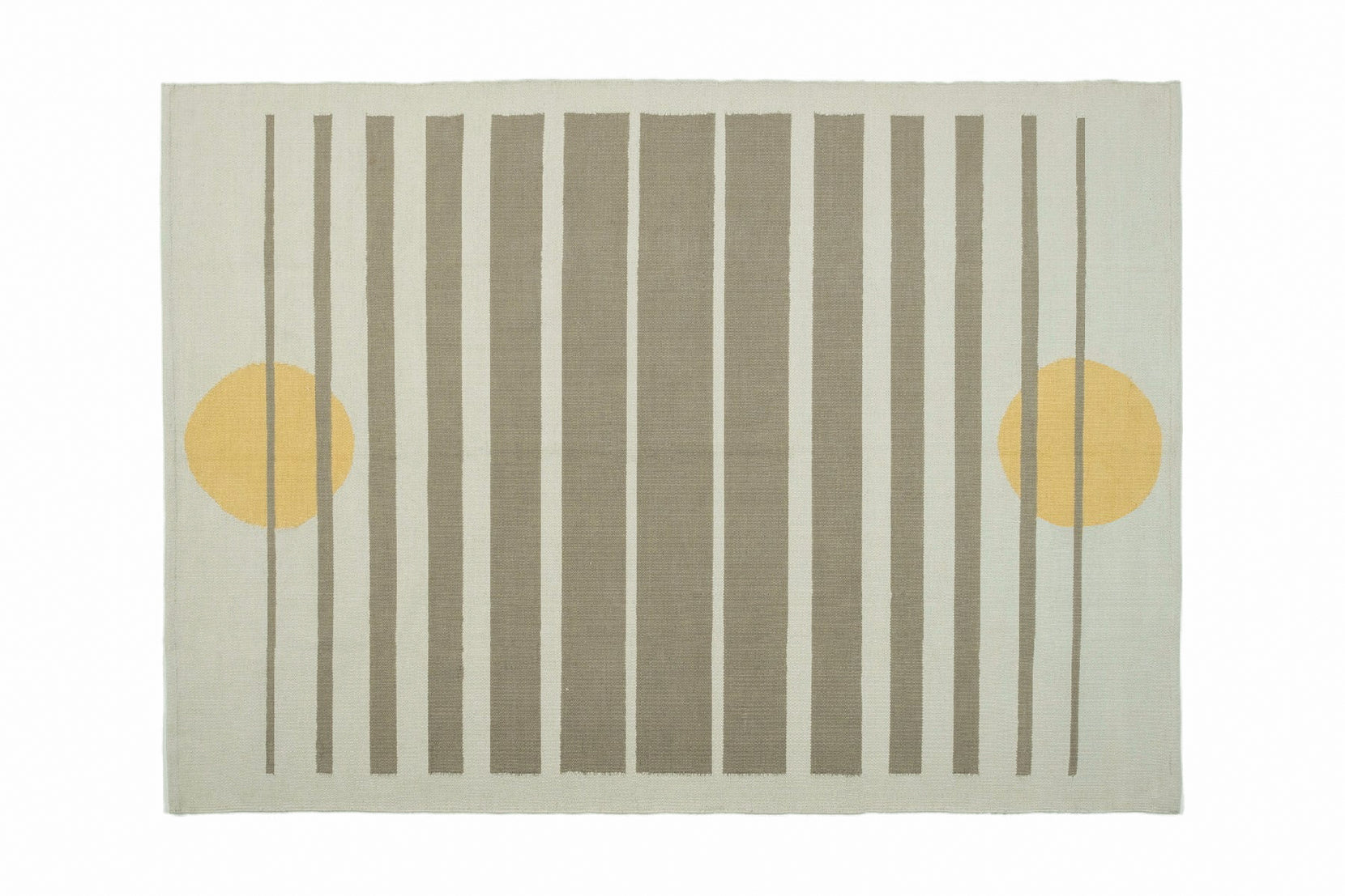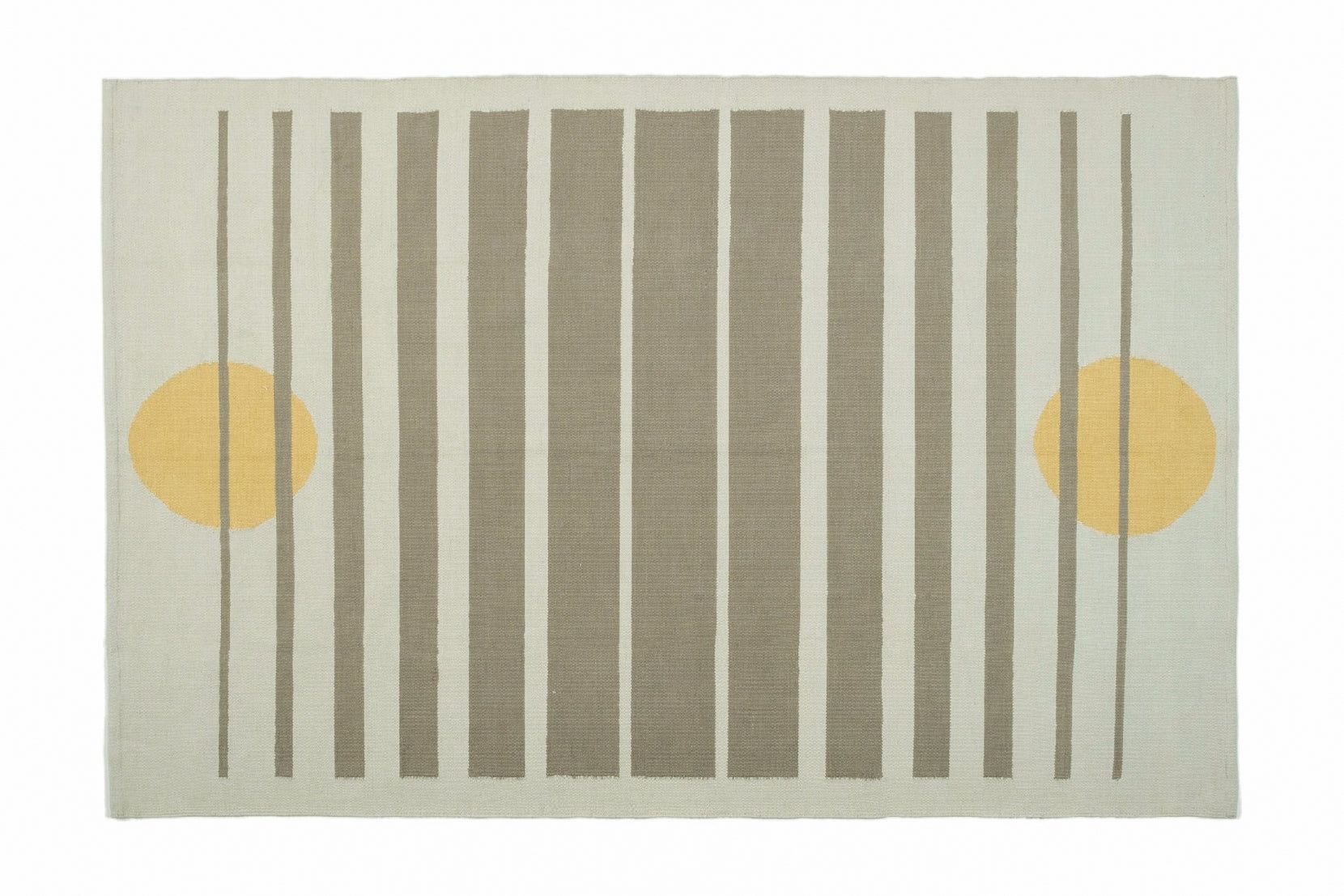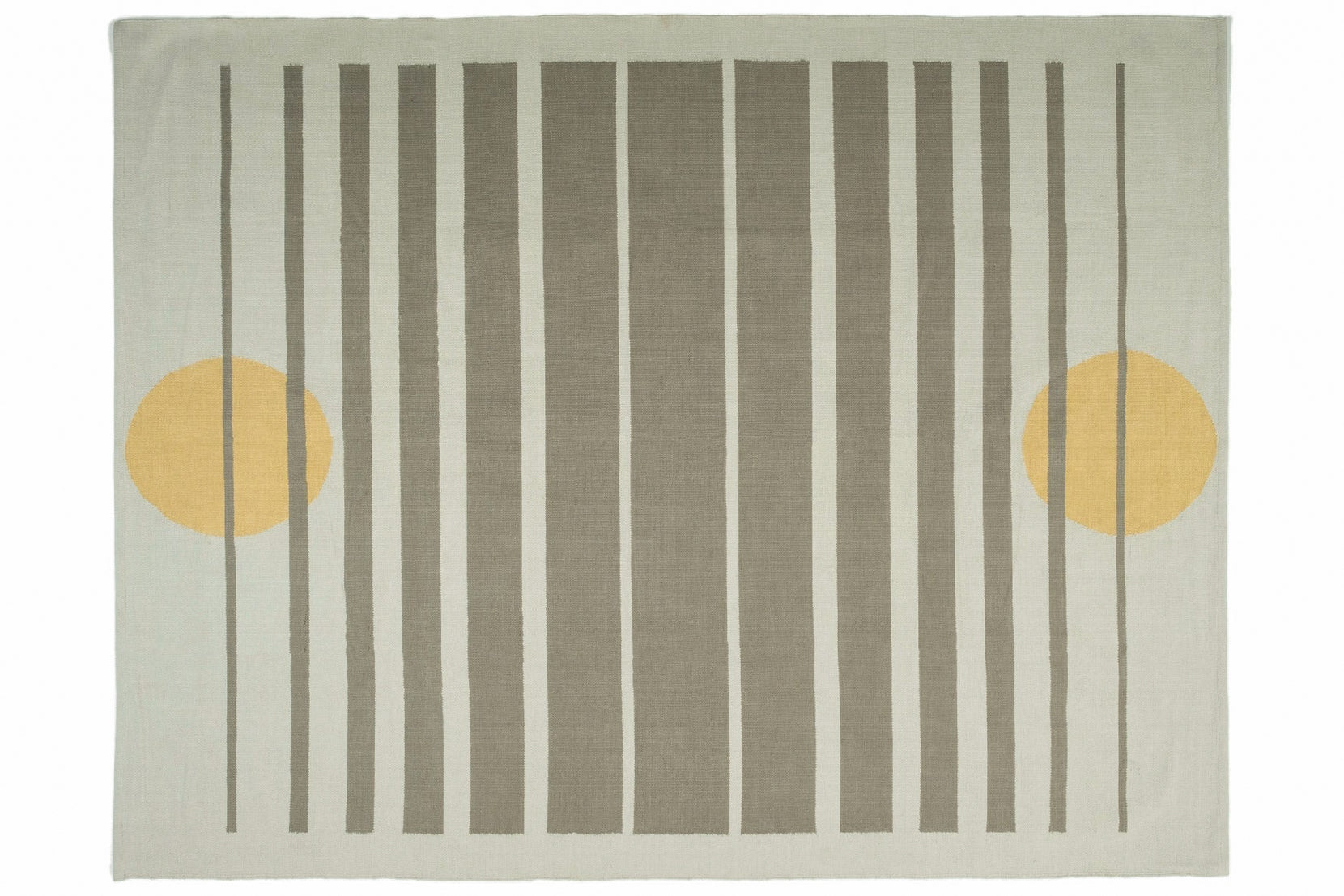 Cotton dhurries are classic Indian flatwoven rugs, designed to be lightweight and portable, cold in summer, warm in winter. Stripes are a standard dhurrie design, and ours are no exception. Leaping features a balanced circle at either end, like egg yolk suns, overlaid by stripes of varying width.