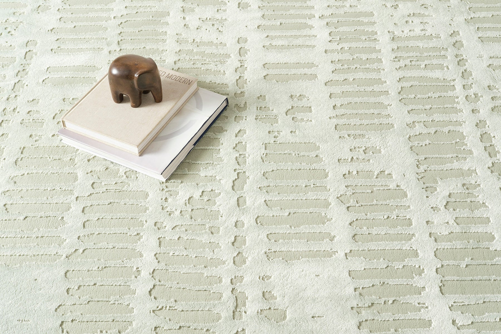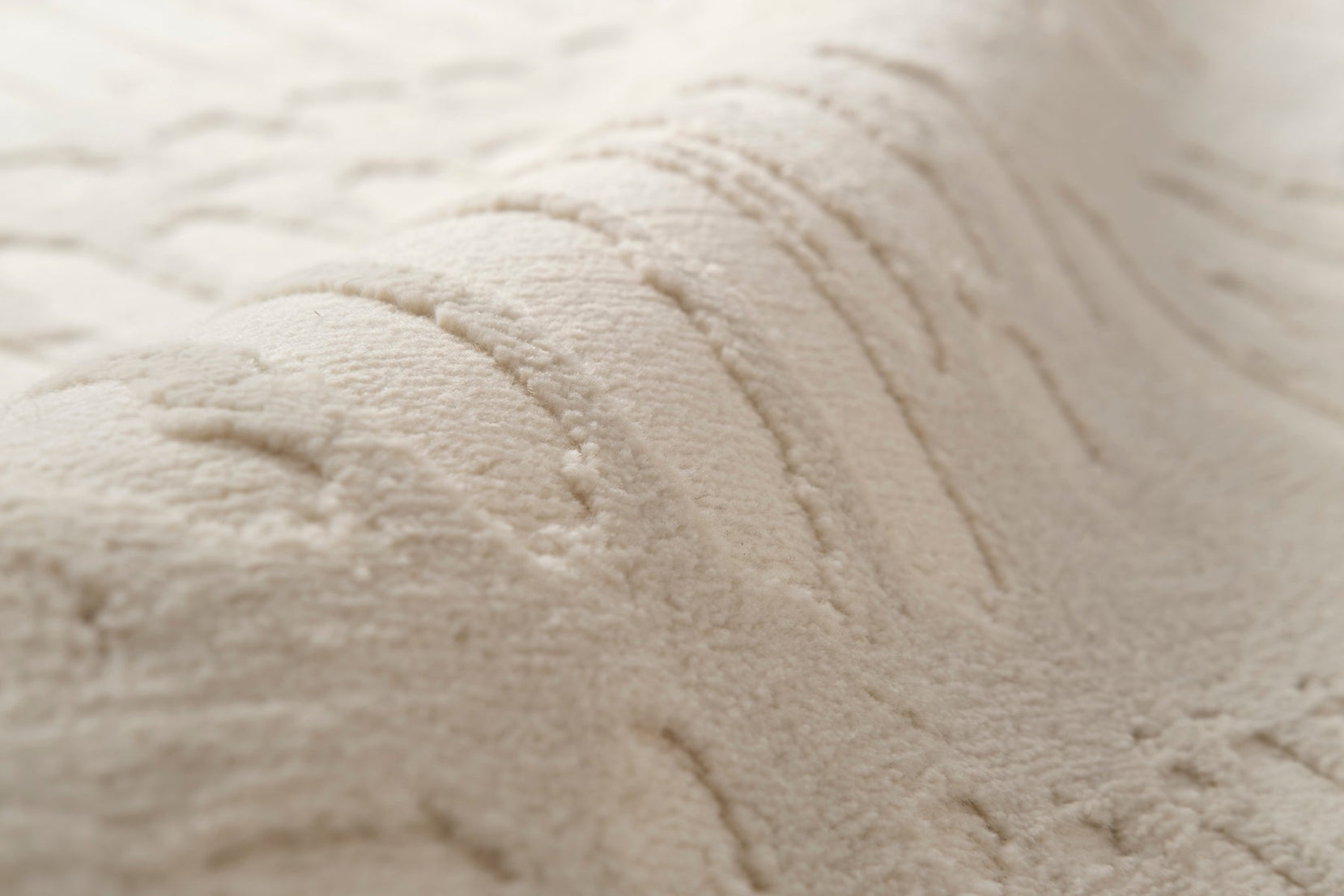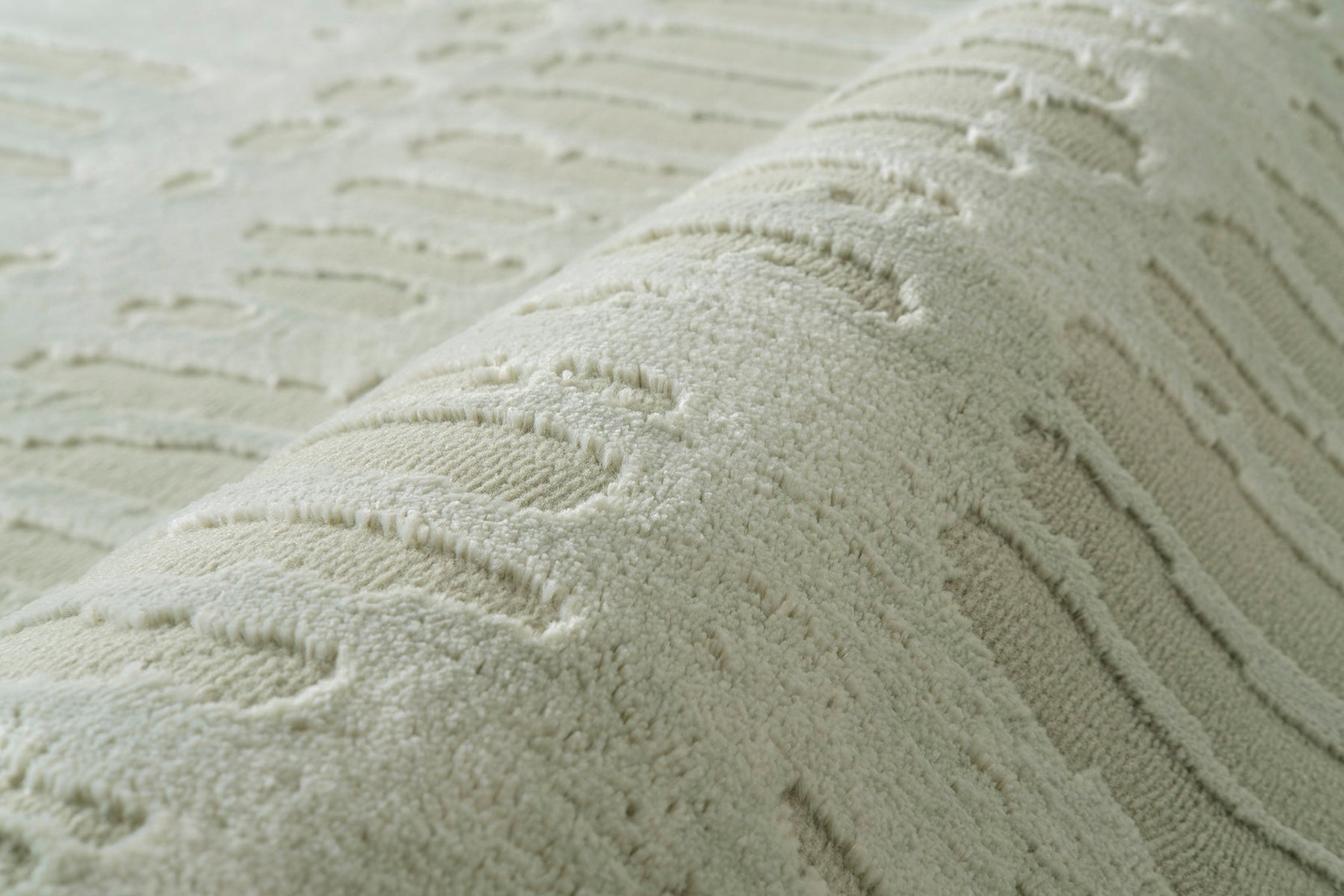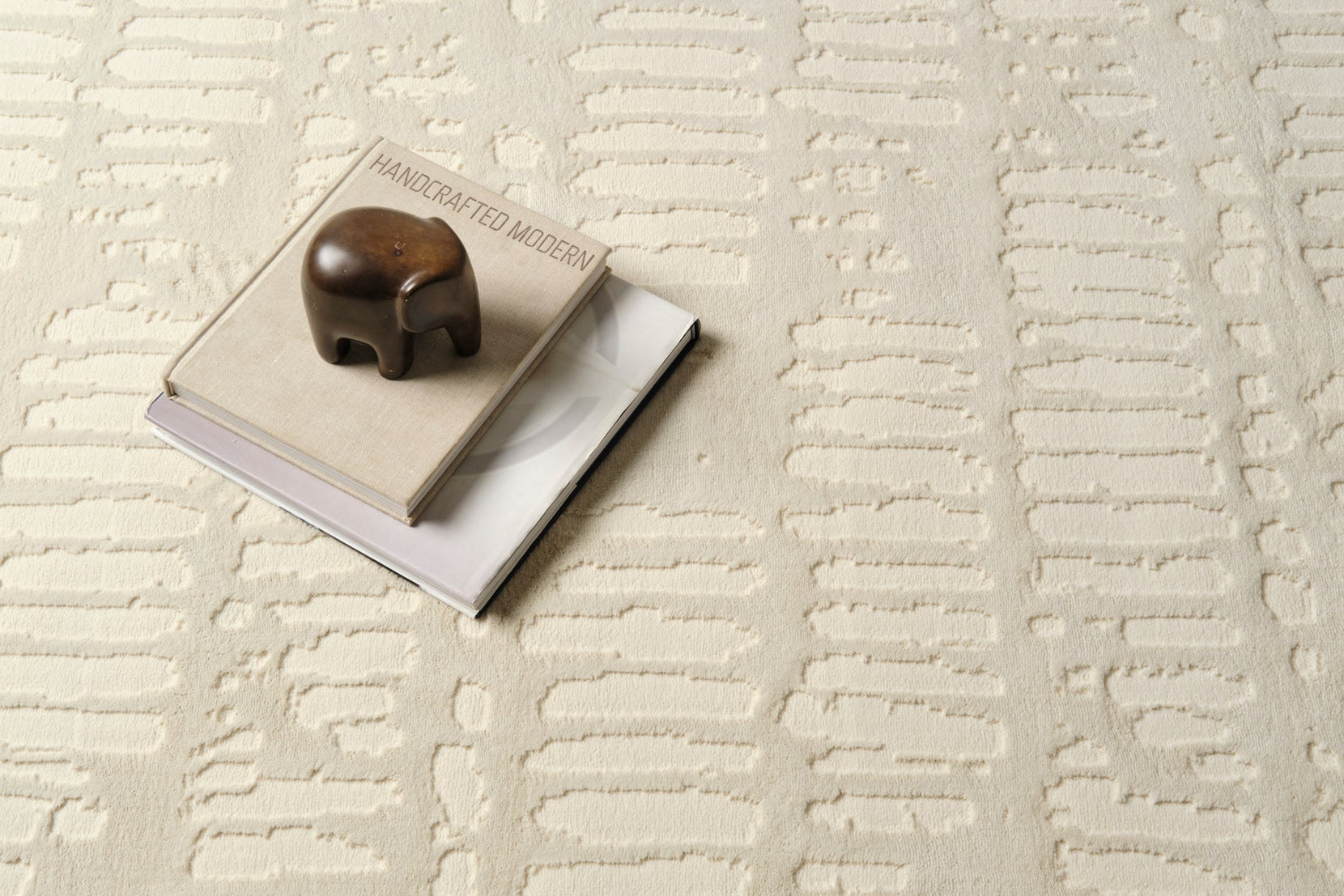 Shell is a solid-color rug with geometric line drawings in relief, like ancient ammonite fossils. Its tone-on-tone effect is inspired by the accidental designs of beach tides: the smoothness of seashells eroded over time, imprints left by waves on sand, the organic textures of corals and rocks.