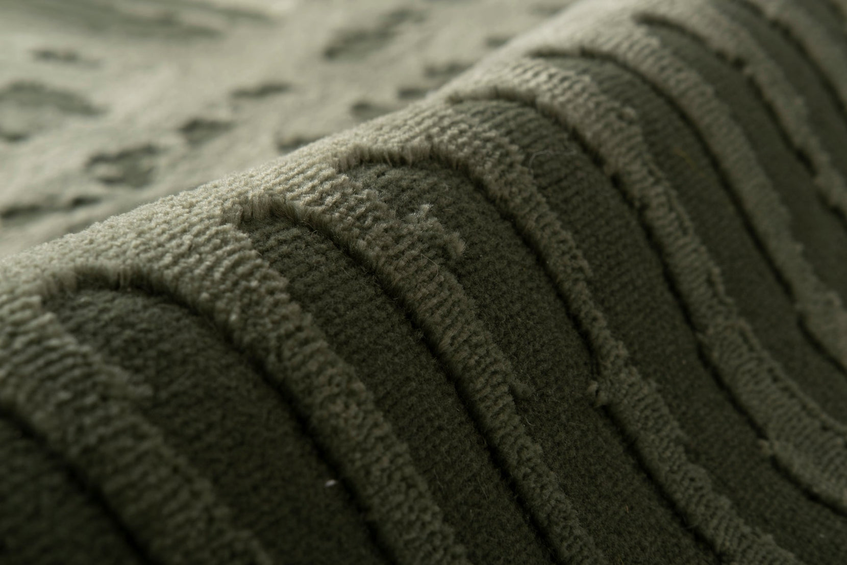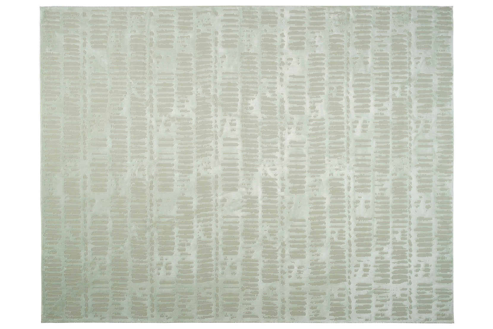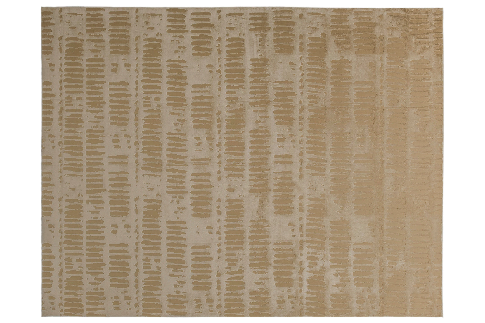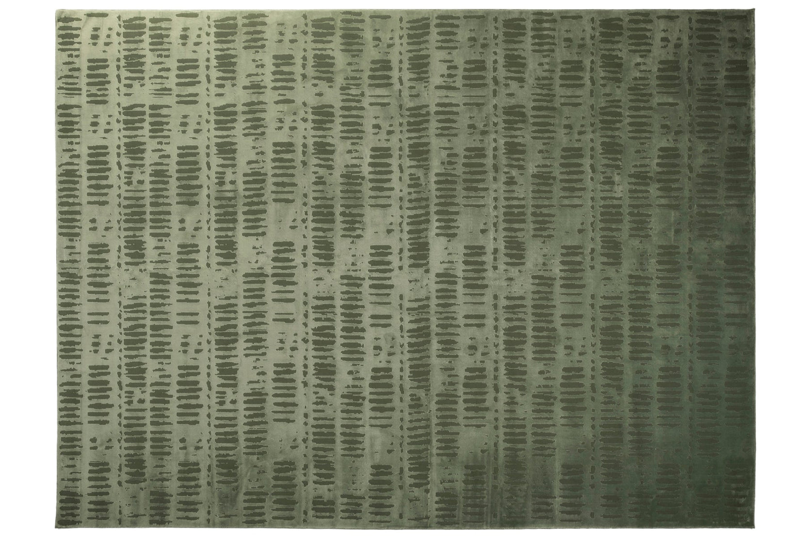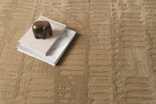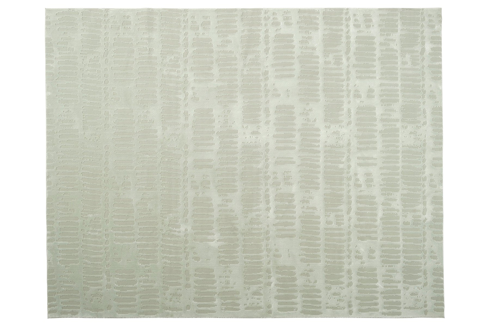 Shell is a solid-color rug with geometric line drawings in relief, like ancient ammonite fossils. Its tone-on-tone effect is inspired by the accidental designs of beach tides: the smoothness of seashells eroded over time, imprints left by waves on sand, the organic textures of corals and rocks.