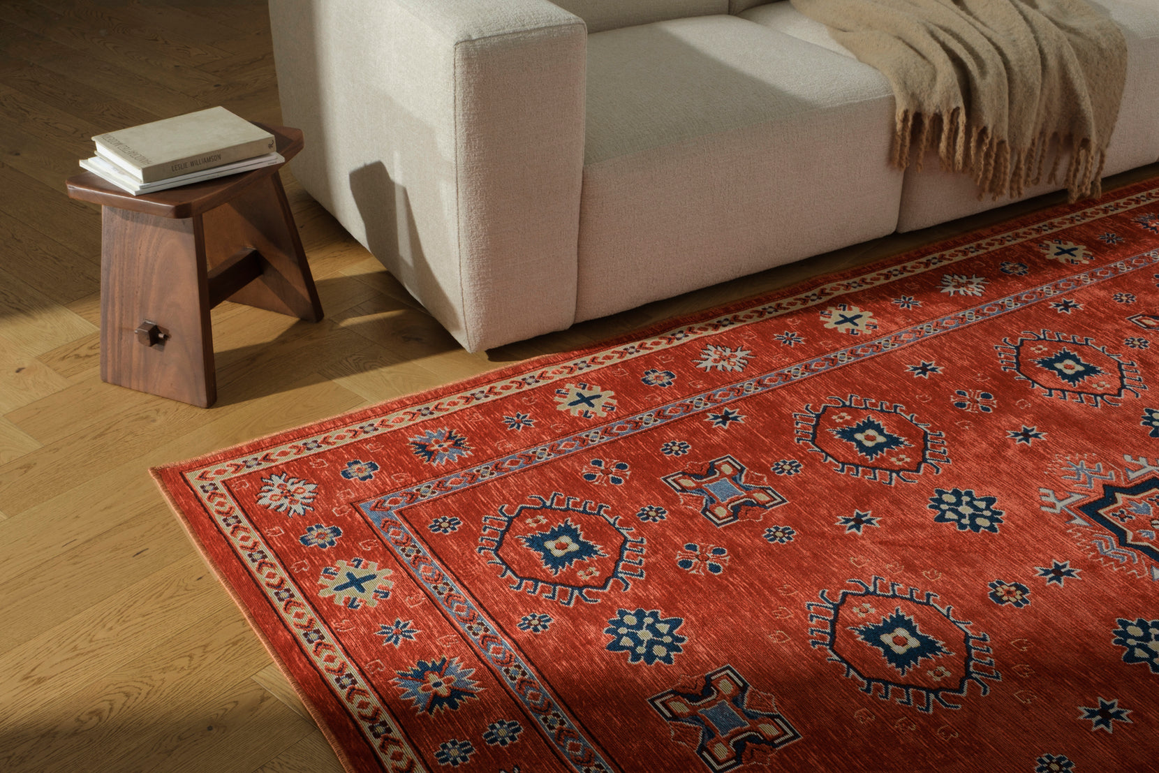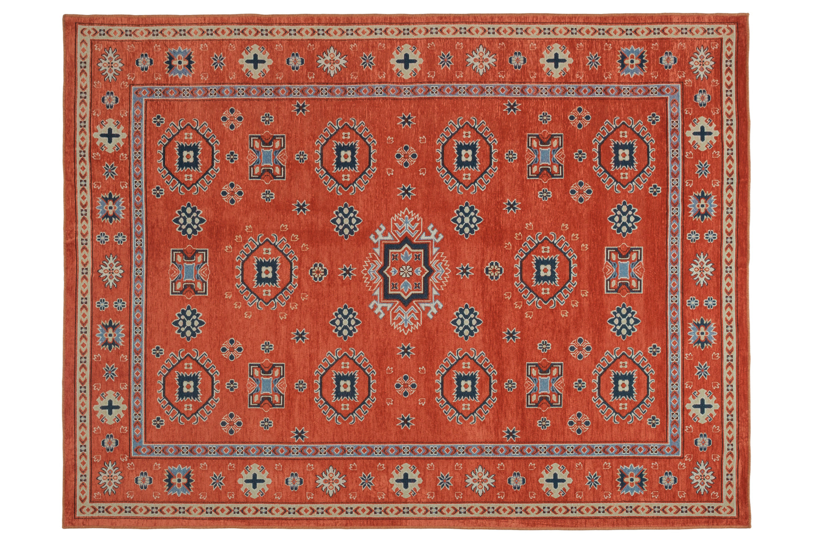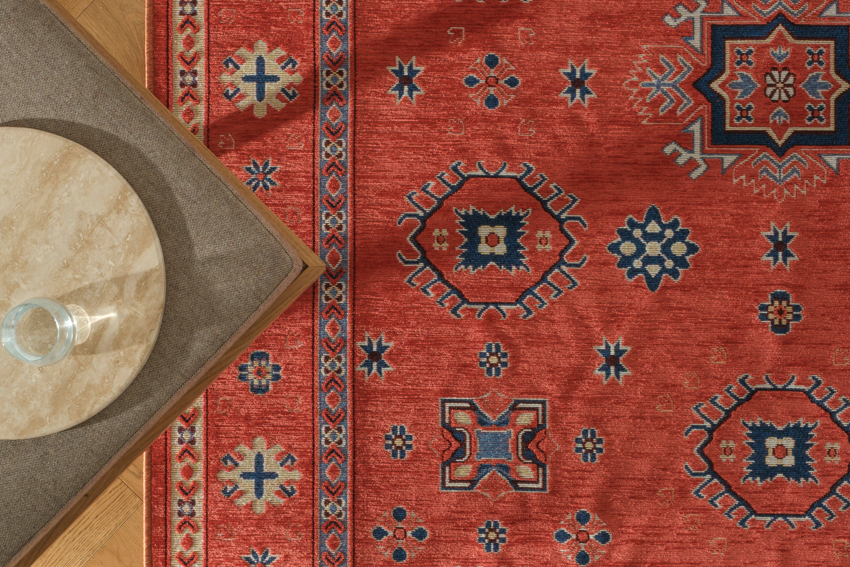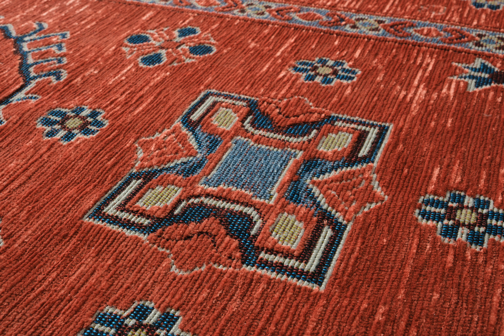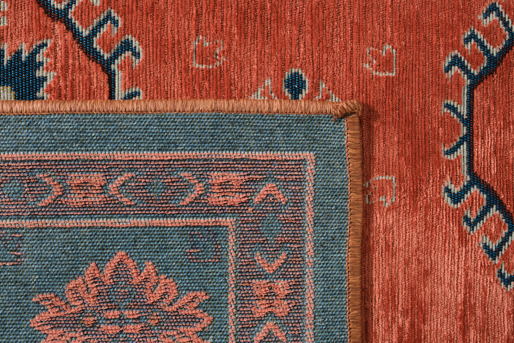 A modern take on antique designs, our washable Folk Collection is inspired by Turkish folk art. Our designers modernized both the construction—making it washable—and the design, by reimagining traditional elements in an abstracted form. These pieces are woven with soft polyester chenille whose signature texture feels fuzzy underfoot and adds movement to the design. Recessed motifs add more texture, creating a visual and tactile contrast between high and low.