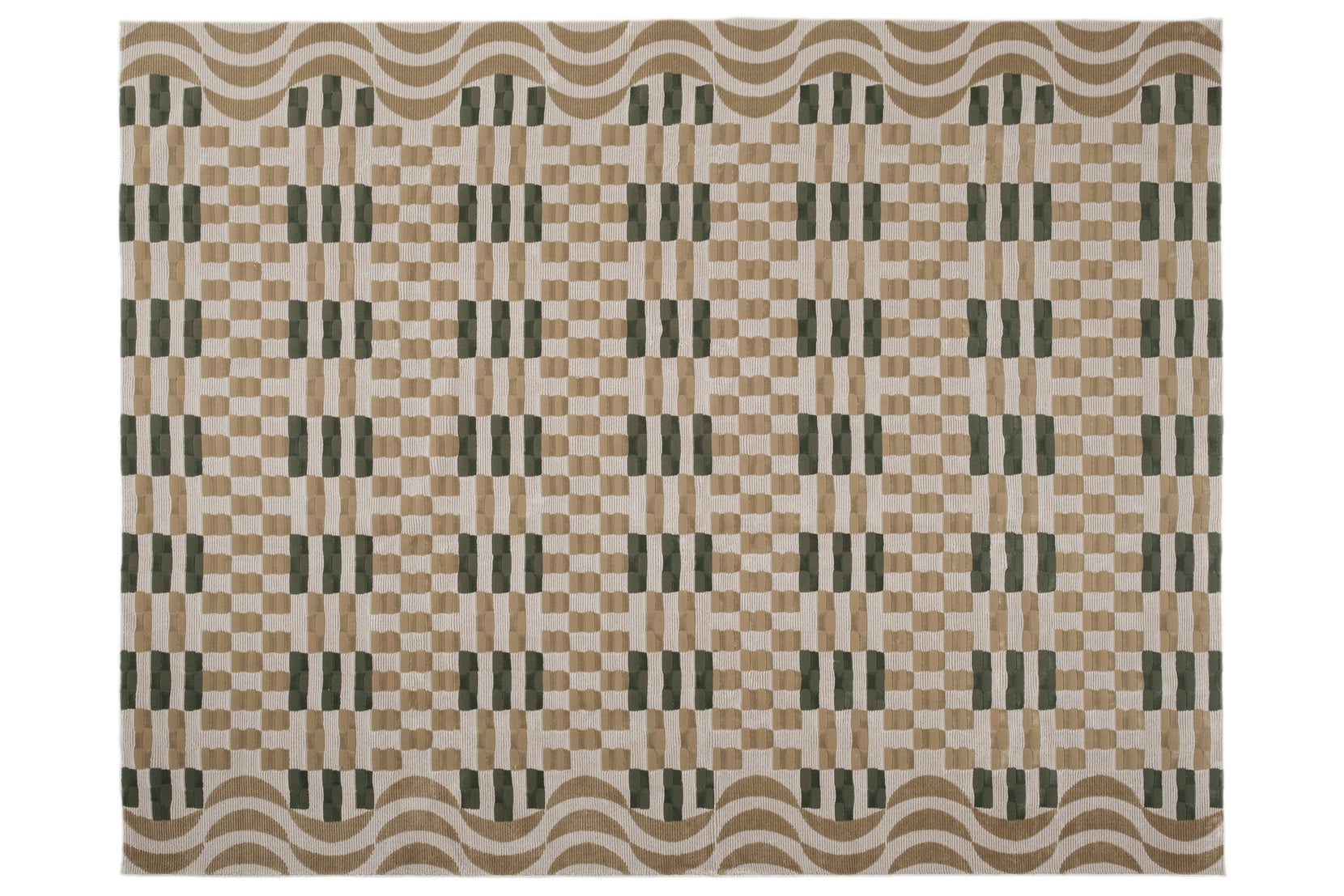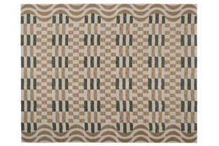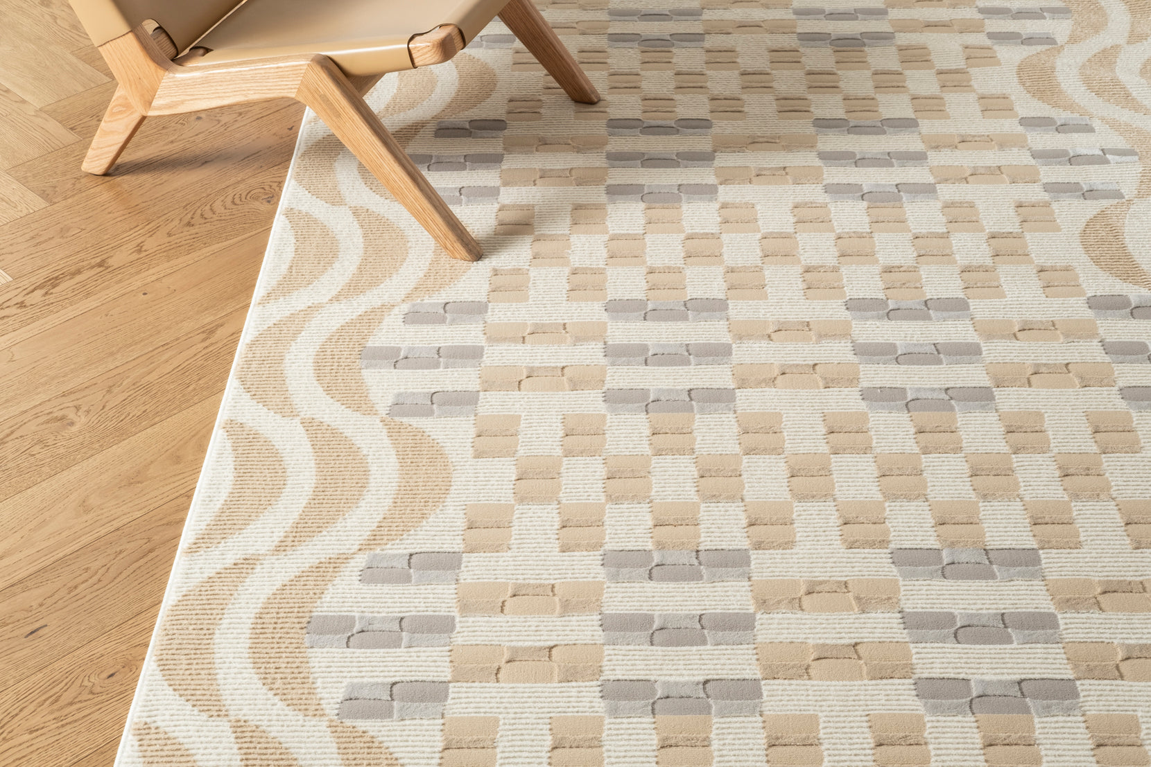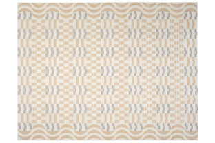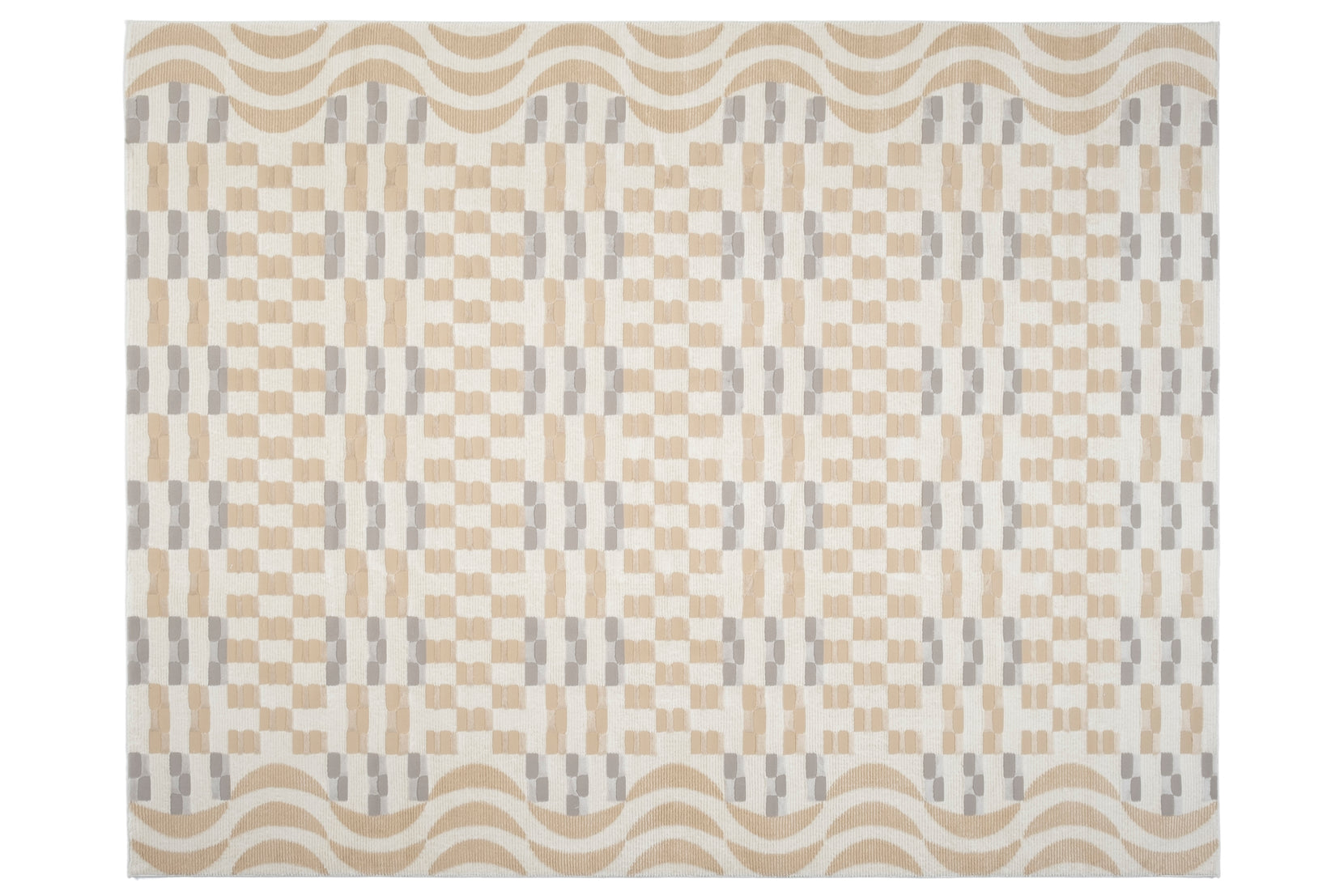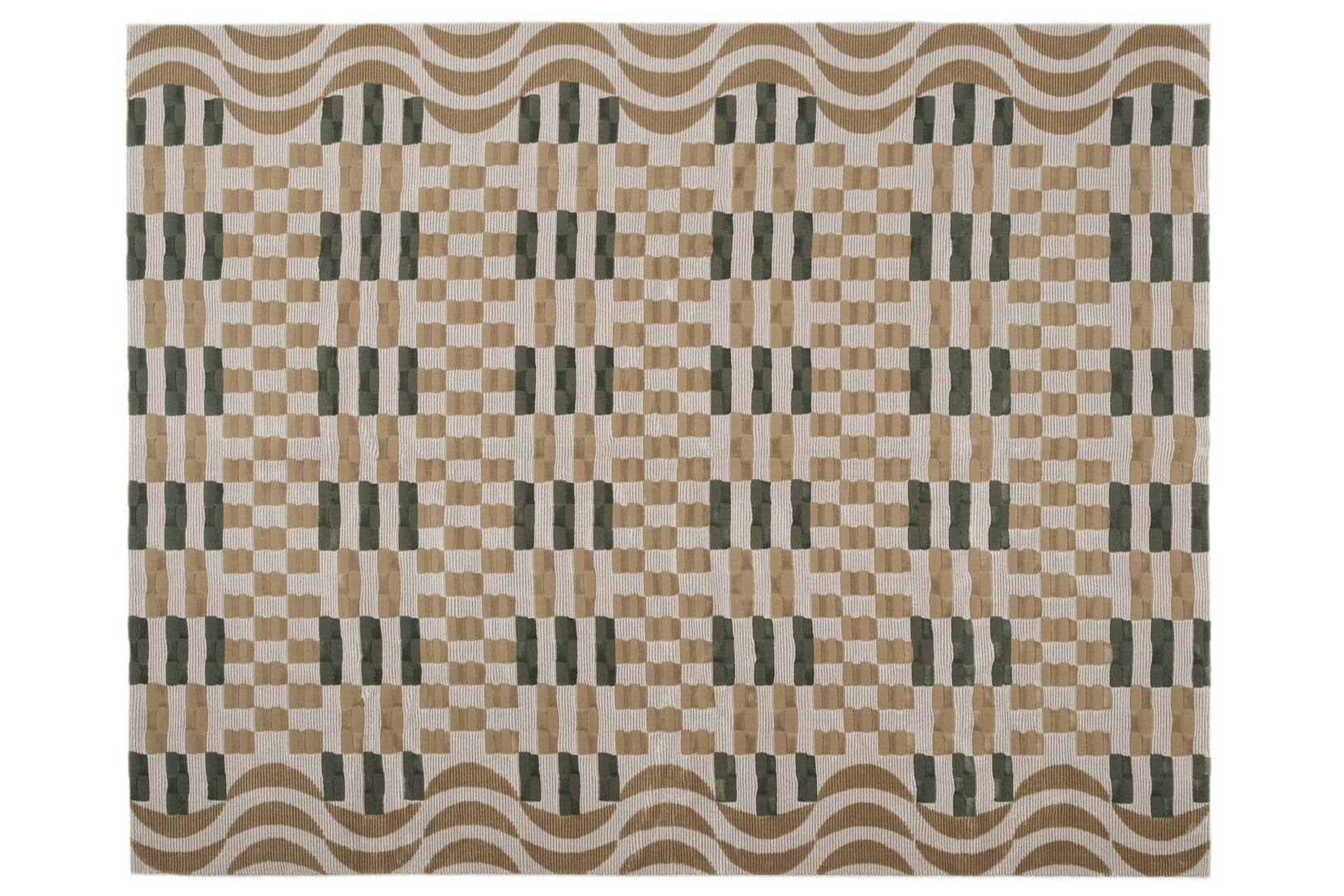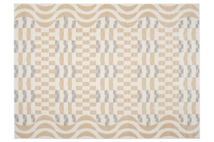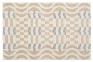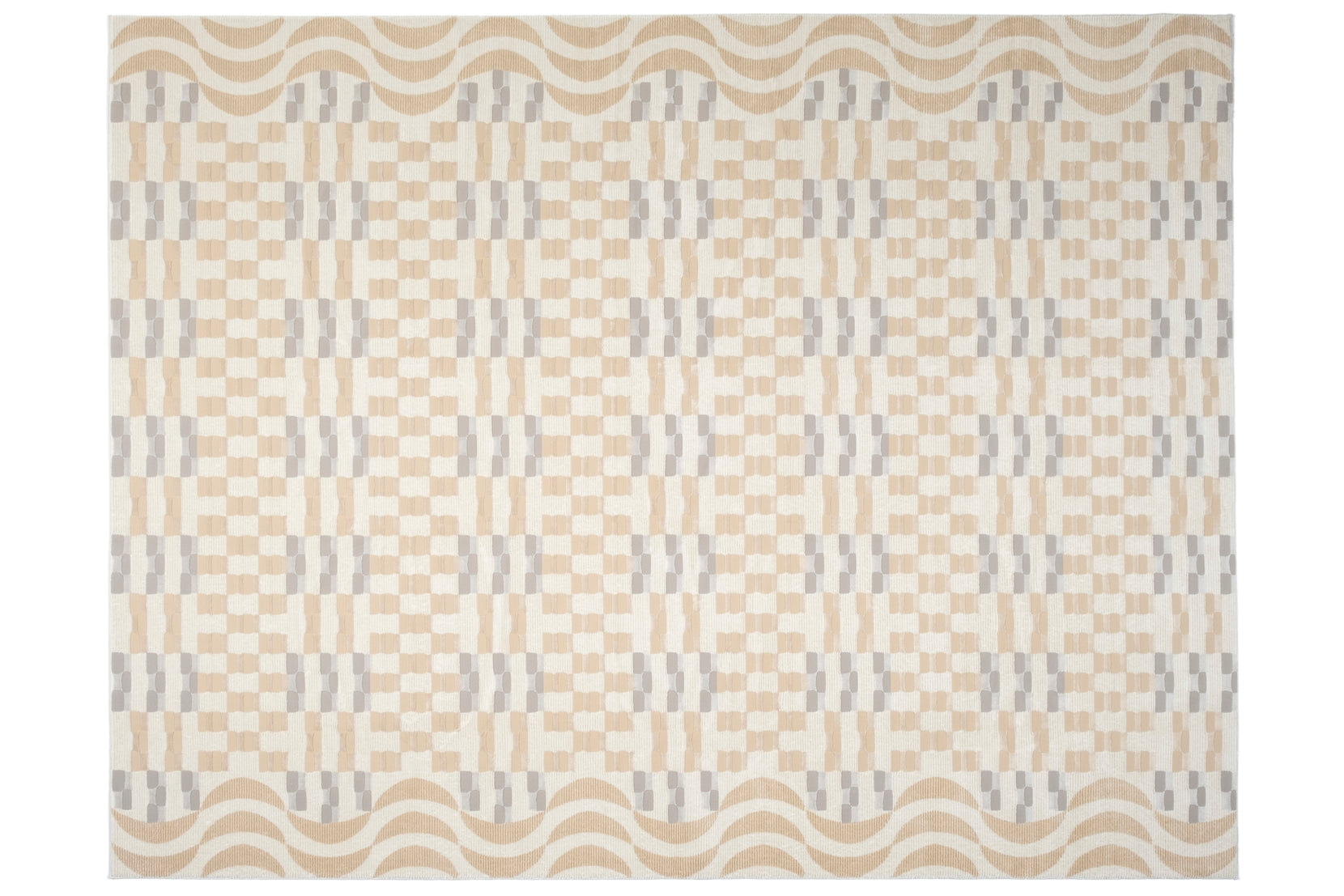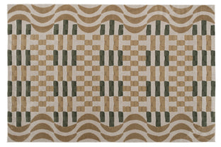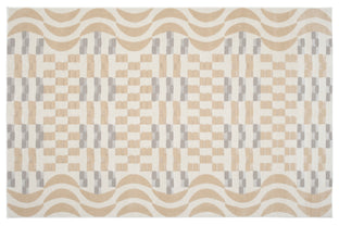 Our washable Damita Collection is inspired by the 1997 music video Got 'til It's Gone, by Janet Jackson, Joni Mitchell, and Q-Tip. Visually, this video references the hot 1960's summer night party scene immortalized by Malian photographer Malick Sidibe. Dynamic geometries swoop and slither in these pieces, all done in earthy neutrals. Twist is a funky checkerboard, made up of smaller checkerboards and alternating stripes. Its vertical borders are lined in wavy, twisting half moons.