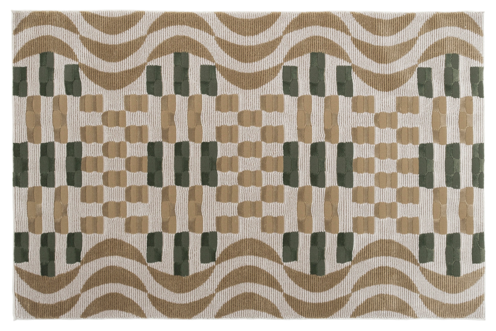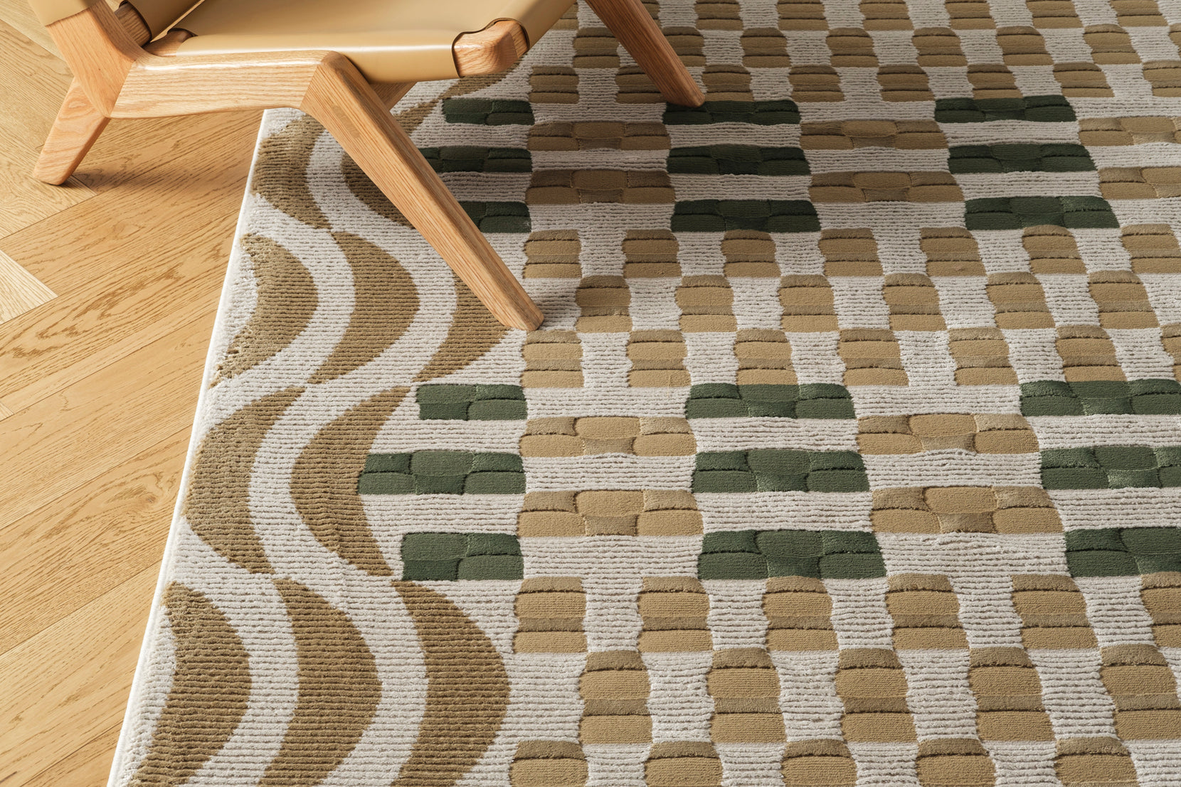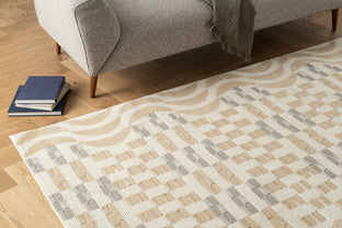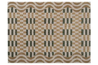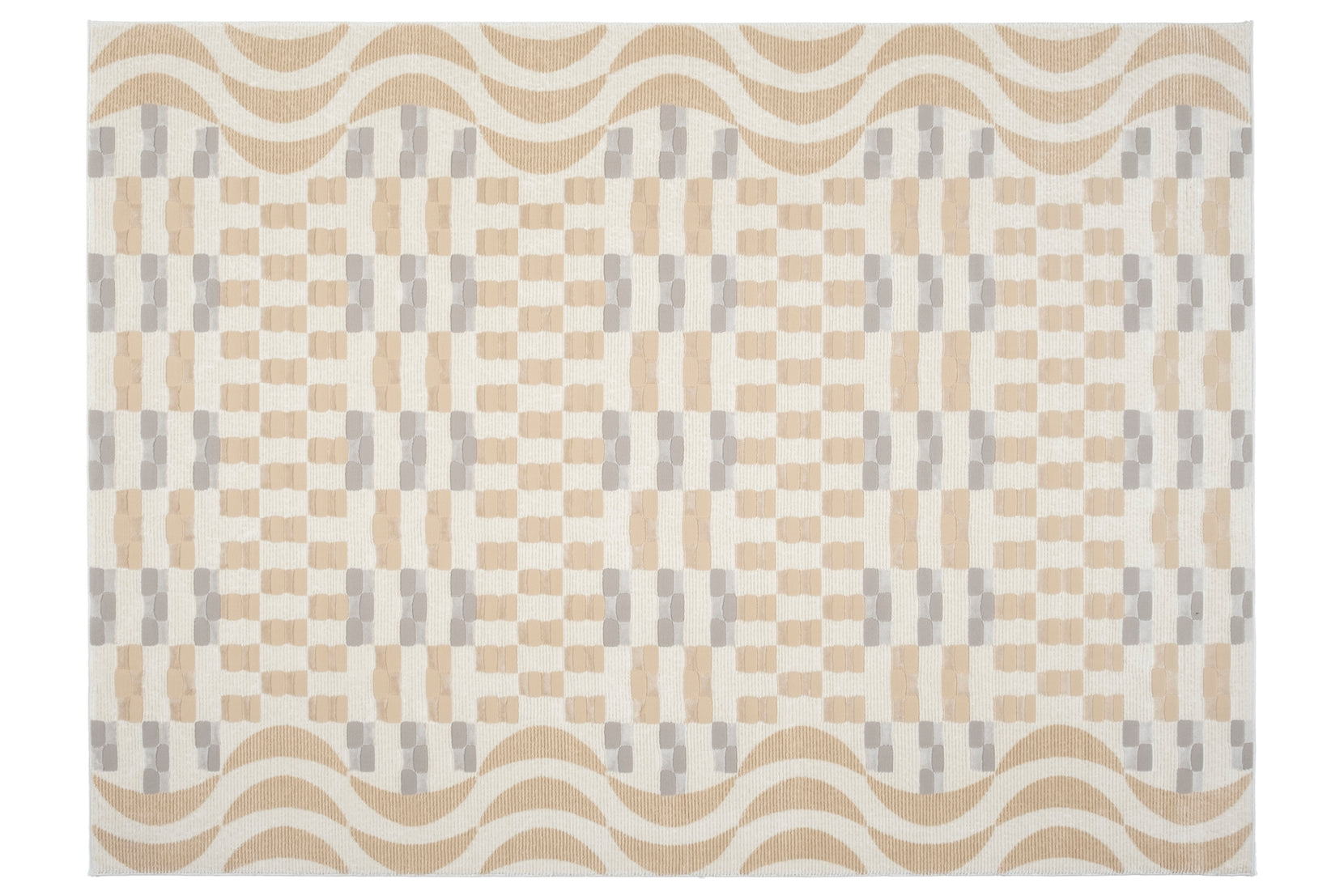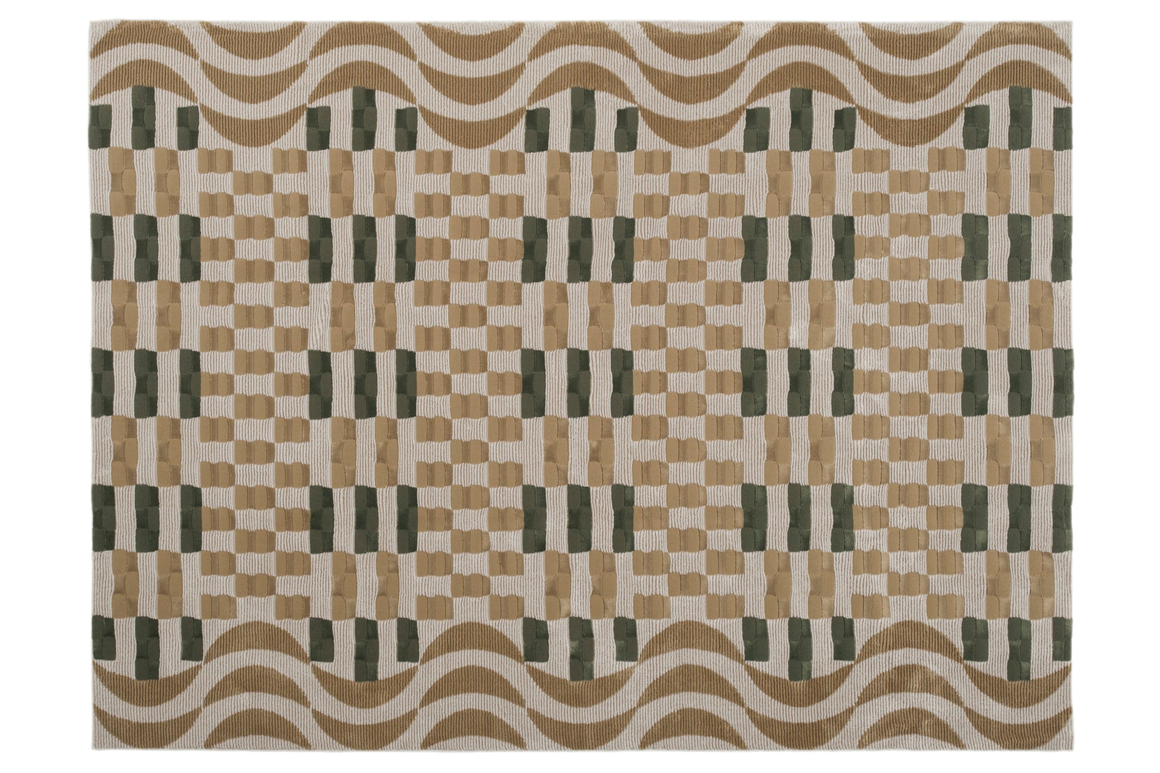 Our washable Damita Collection is inspired by the 1997 music video Got 'til It's Gone, by Janet Jackson, Joni Mitchell, and Q-Tip. Visually, this video references the hot 1960's summer night party scene immortalized by Malian photographer Malick Sidibe. Dynamic geometries swoop and slither in these pieces, all done in earthy neutrals. Twist is a funky checkerboard, made up of smaller checkerboards and alternating stripes. Its vertical borders are lined in wavy, twisting half moons.