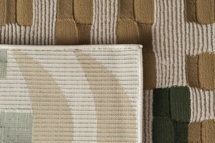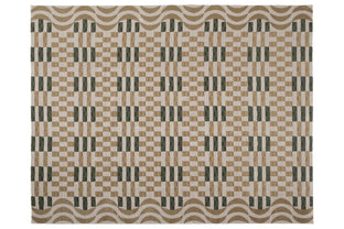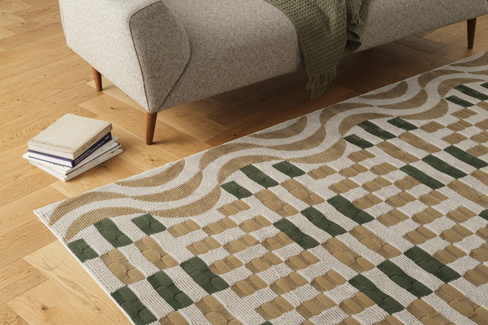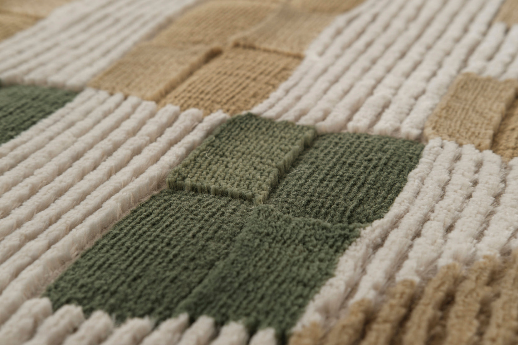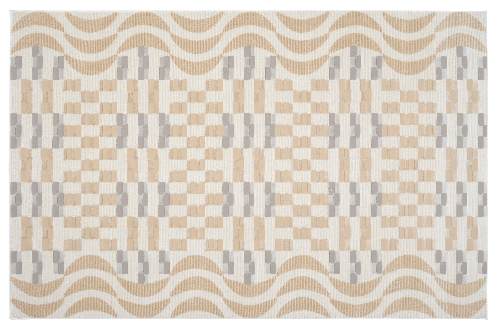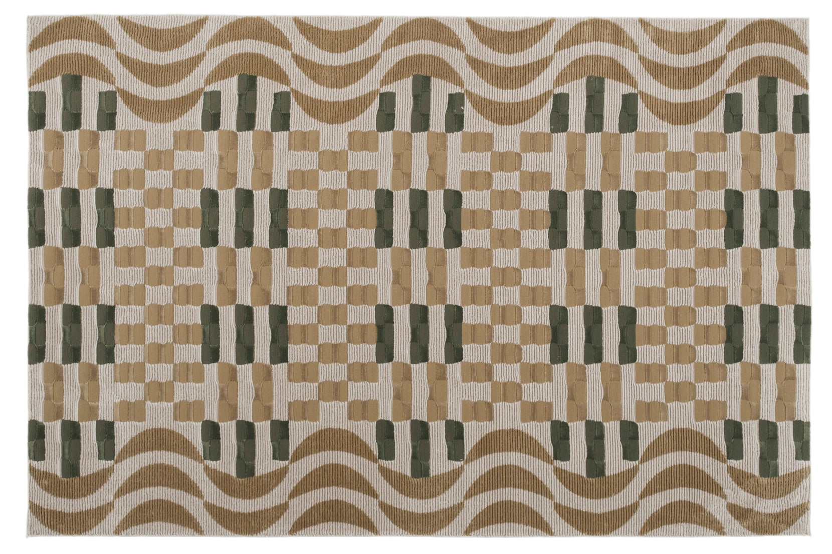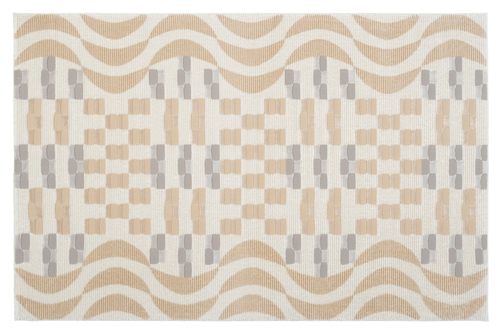 Our washable Damita Collection is inspired by the 1997 music video Got 'til It's Gone, by Janet Jackson, Joni Mitchell, and Q-Tip. Visually, this video references the hot 1960's summer night party scene immortalized by Malian photographer Malick Sidibe. Dynamic geometries swoop and slither in these pieces, all done in earthy neutrals. Twist is a funky checkerboard, made up of smaller checkerboards and alternating stripes. Its vertical borders are lined in wavy, twisting half moons.