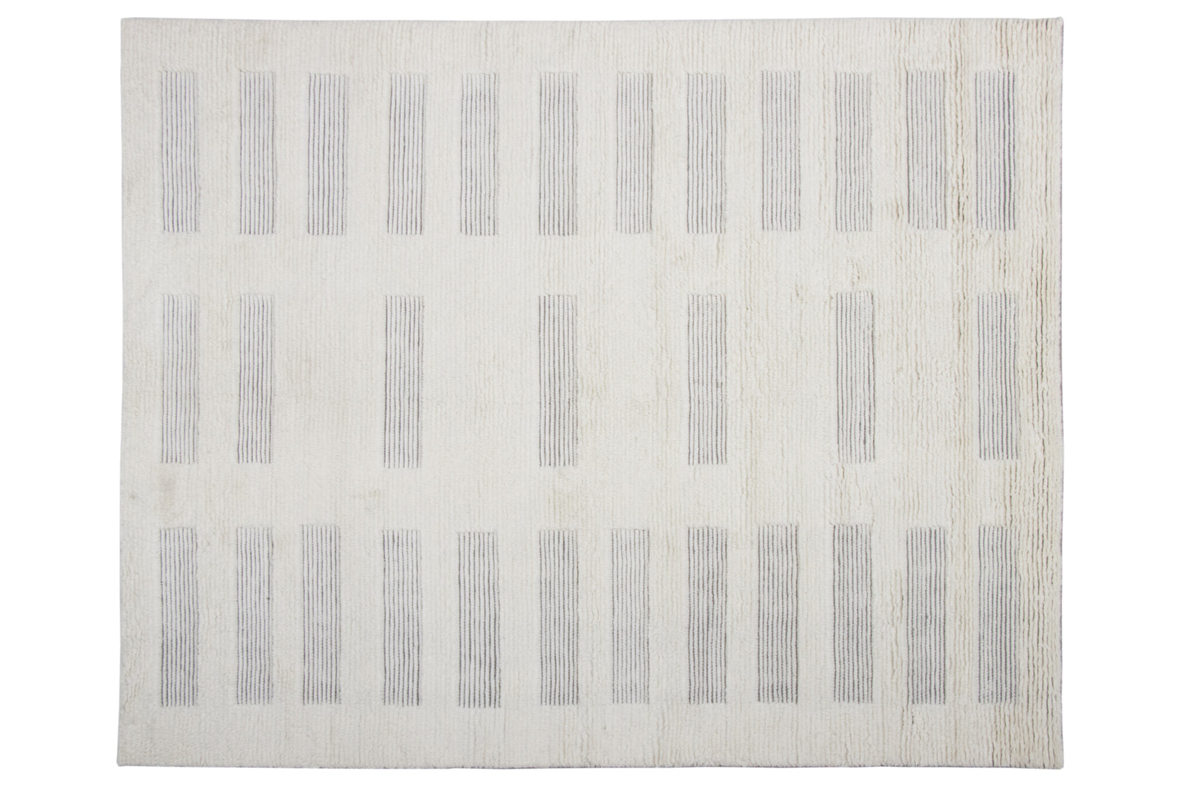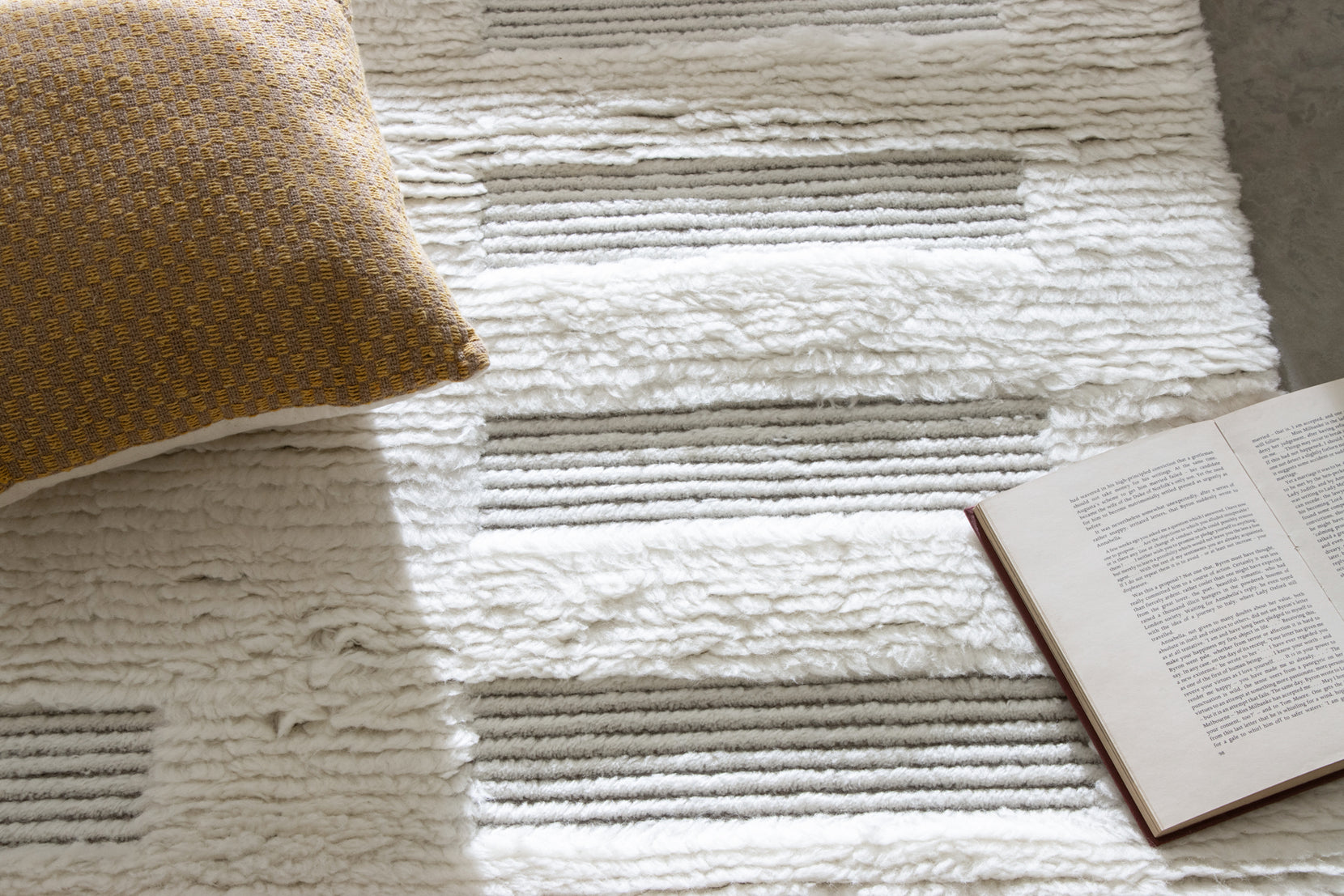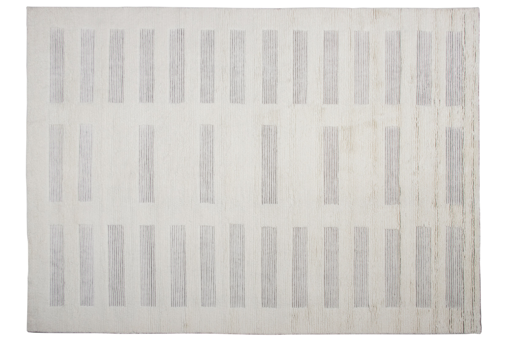 Inspired by the architectural tapestries of weaver James Koehler and the ghost-like paintings of Ed Moses, cut-pile shag shapes are softly carved into its ground, like snow angels. In this piece, the higher pile is 1.5 inches and the lower pile is 1 inch. Rhythm's stacked rectangular motifs resemble a syncopated beat.