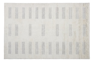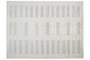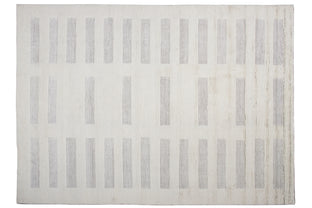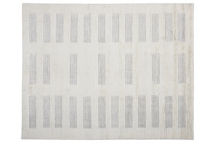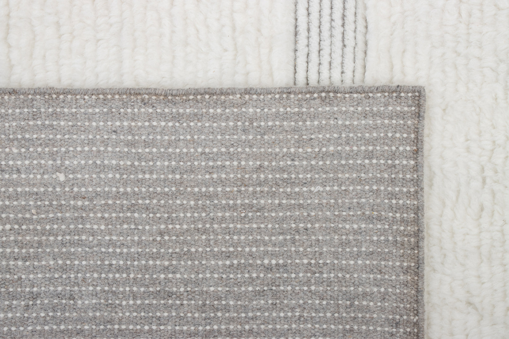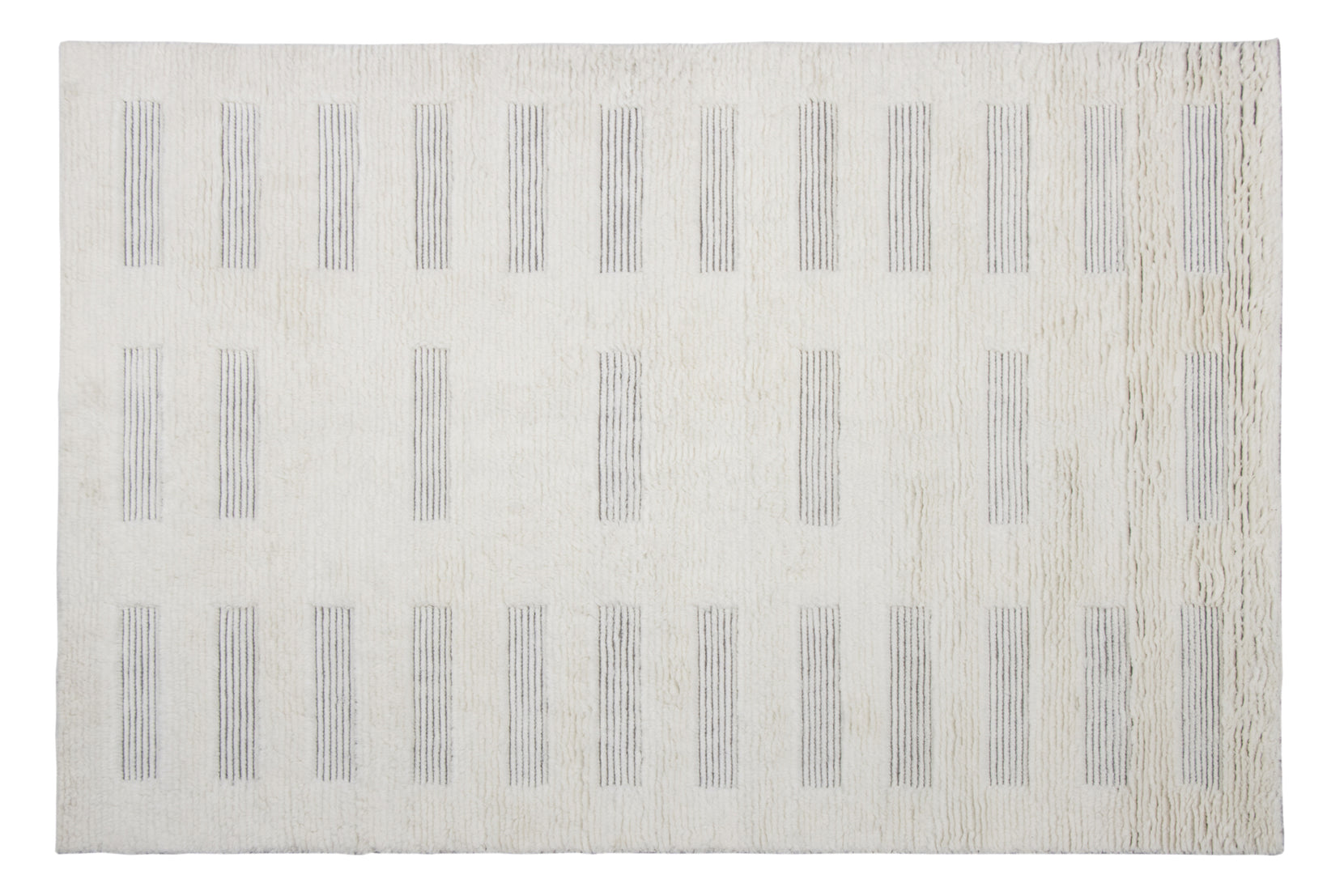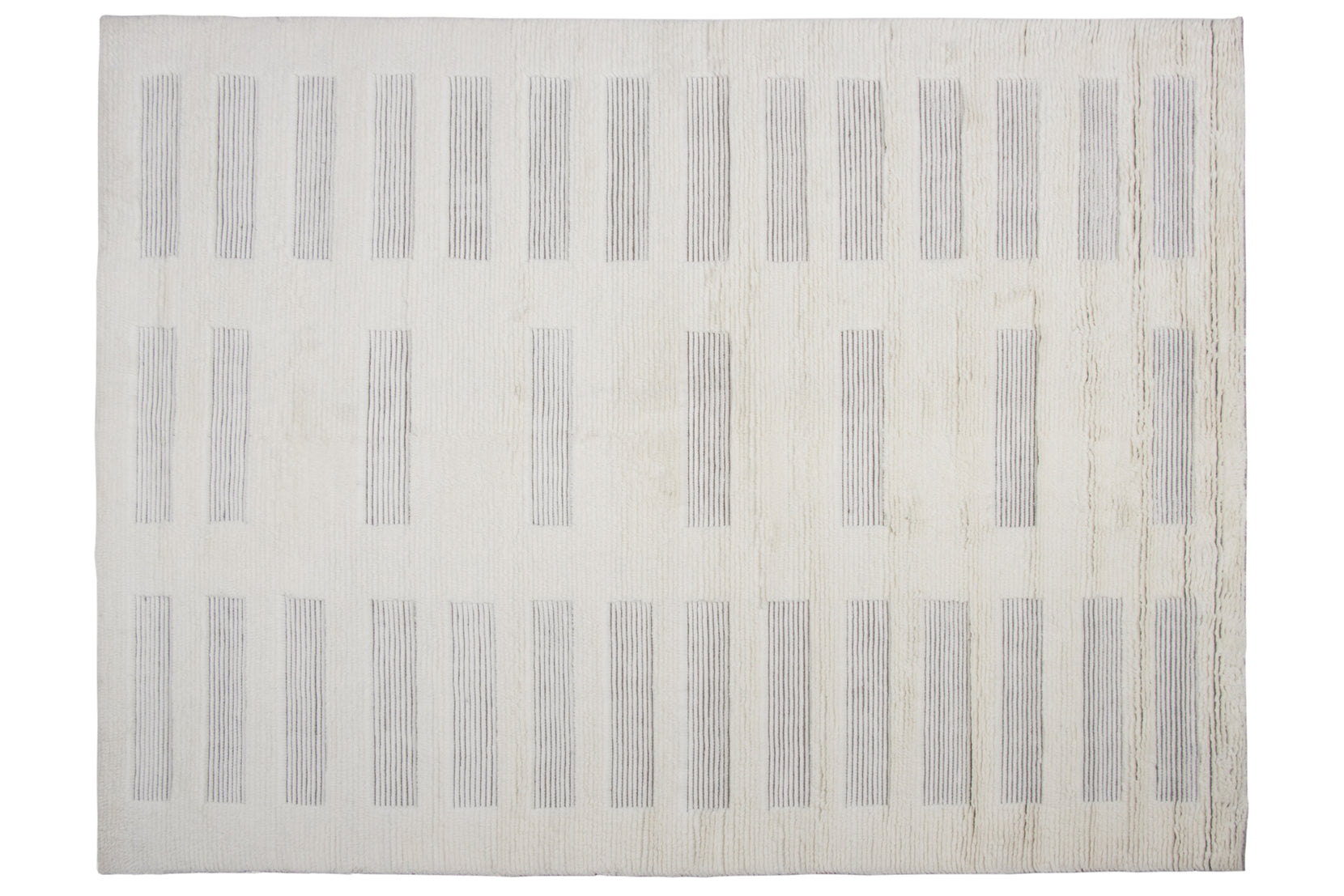 Inspired by the architectural tapestries of weaver James Koehler and the ghost-like paintings of Ed Moses, cut-pile shag shapes are softly carved into its ground, like snow angels. In this piece, the higher pile is 1.5 inches and the lower pile is 1 inch. Rhythm's stacked rectangular motifs resemble a syncopated beat.