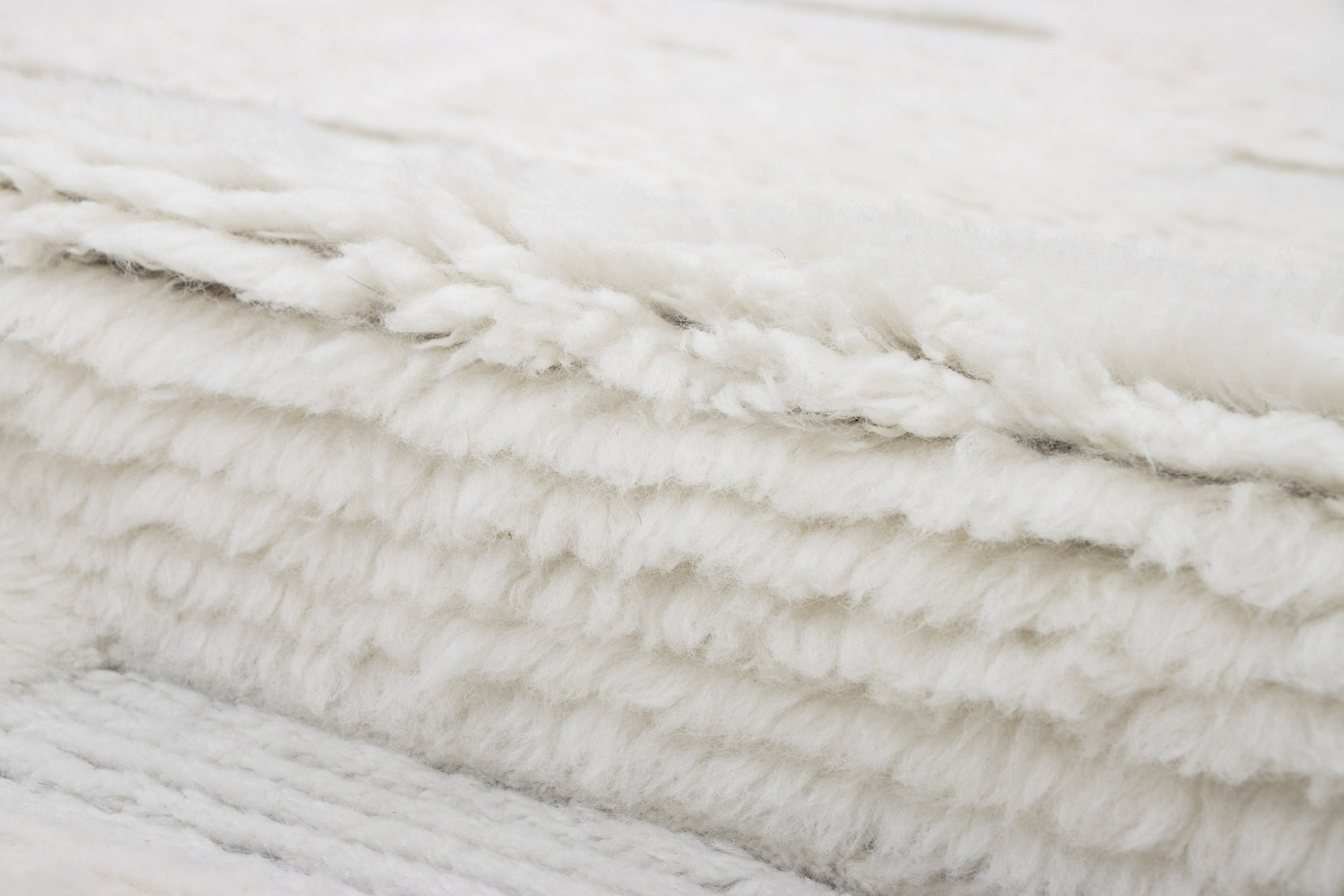 The idea with the Dream Collection was to showcase the weave, its form and feel, without any color. In person, these patterns appear even more subtle. These white shag rugs have a soft hand courtesy of premium New Zealand wool, which we triple-wash to open up the yarn, making the rug remarkably fluffy. Because it's white-on-white, the effect is dreamlike, hallucinatory. Did you imagine that pattern, or is it still there?