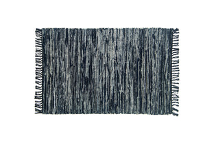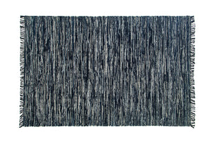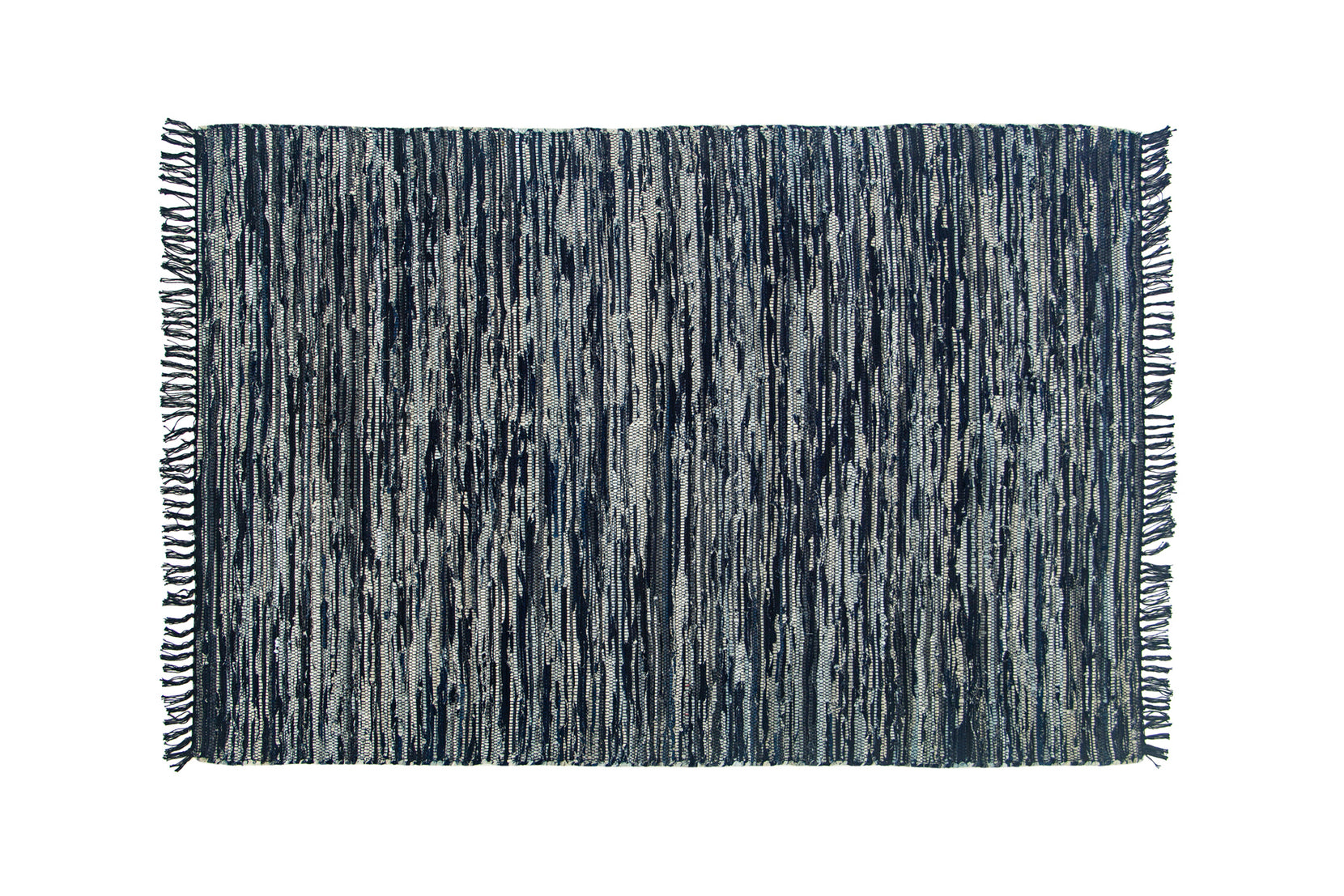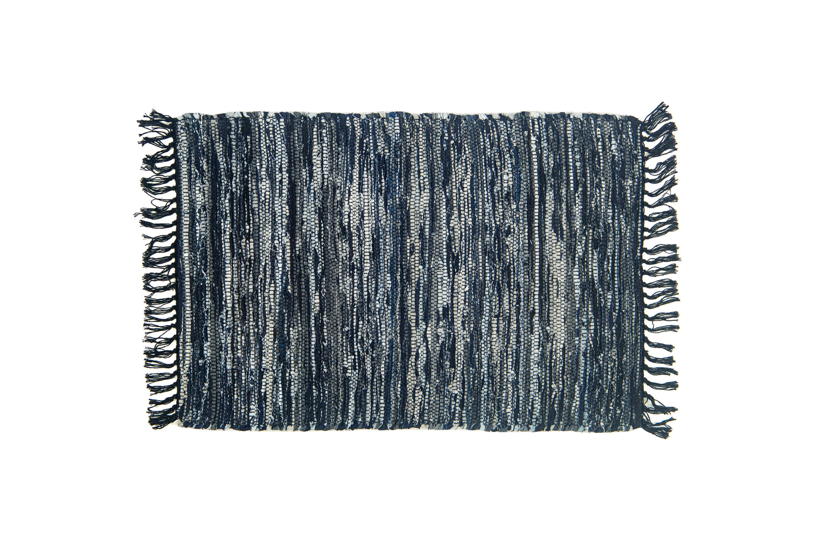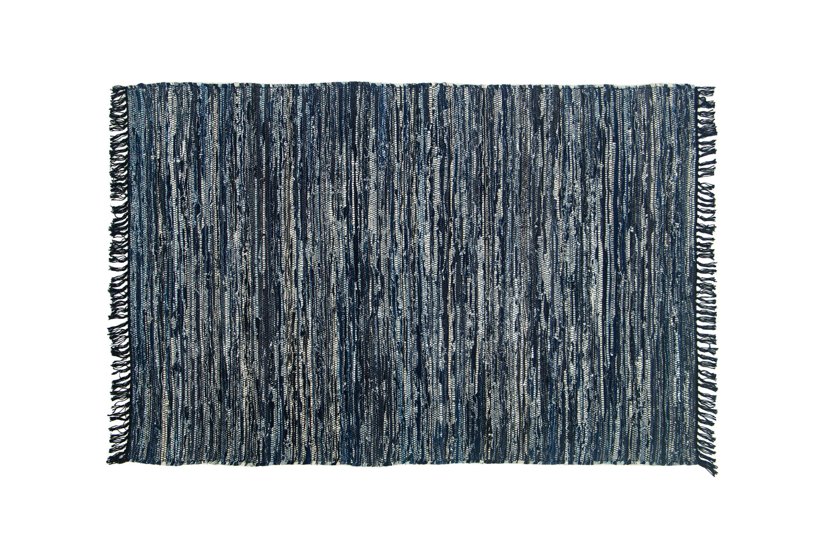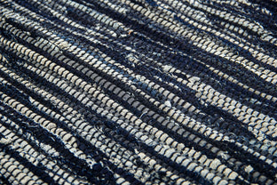 Denim is a sturdy cotton fabric whose twill weave creates a subtle diagonal ribbing, which sets it apart from other strong woven cotton textiles. In this piece, the weft is made of upcycled denim remnants left over from fashion industry production houses, and it's handwoven onto a cotton warp. Cotton is a vegetable fiber widely used across rug traditions because of its strength and longevity-it gets softer and more lovely with every wash.