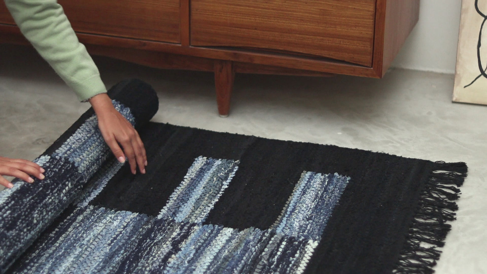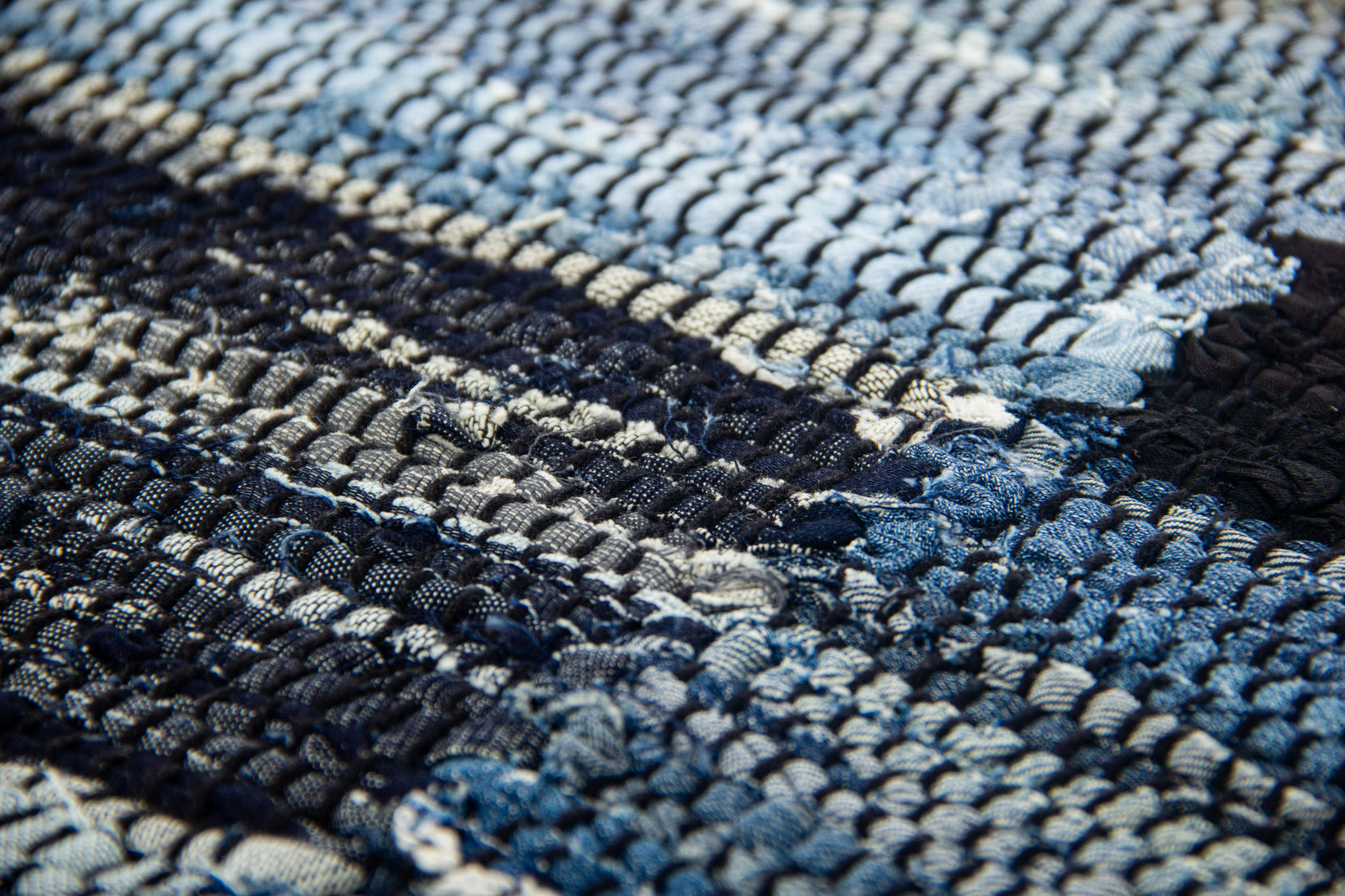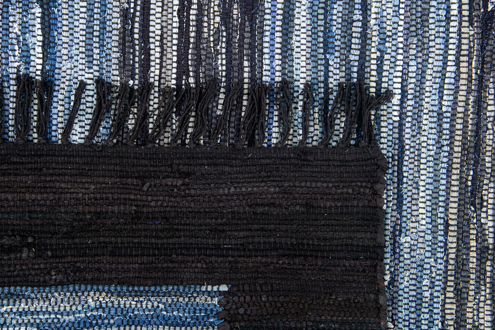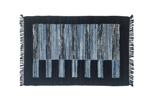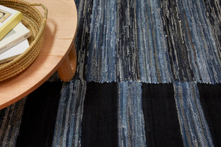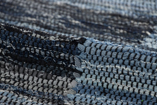 Denim is a sturdy cotton fabric whose twill weave creates a subtle diagonal ribbing, which sets it apart from other strong woven cotton textiles. In this piece, the weft is made of upcycled denim remnants left over from fashion industry production houses, and it's handwoven onto a cotton warp. Cotton is a vegetable fiber widely used across rug traditions because of its strength and longevity-it gets softer and more lovely with every wash.