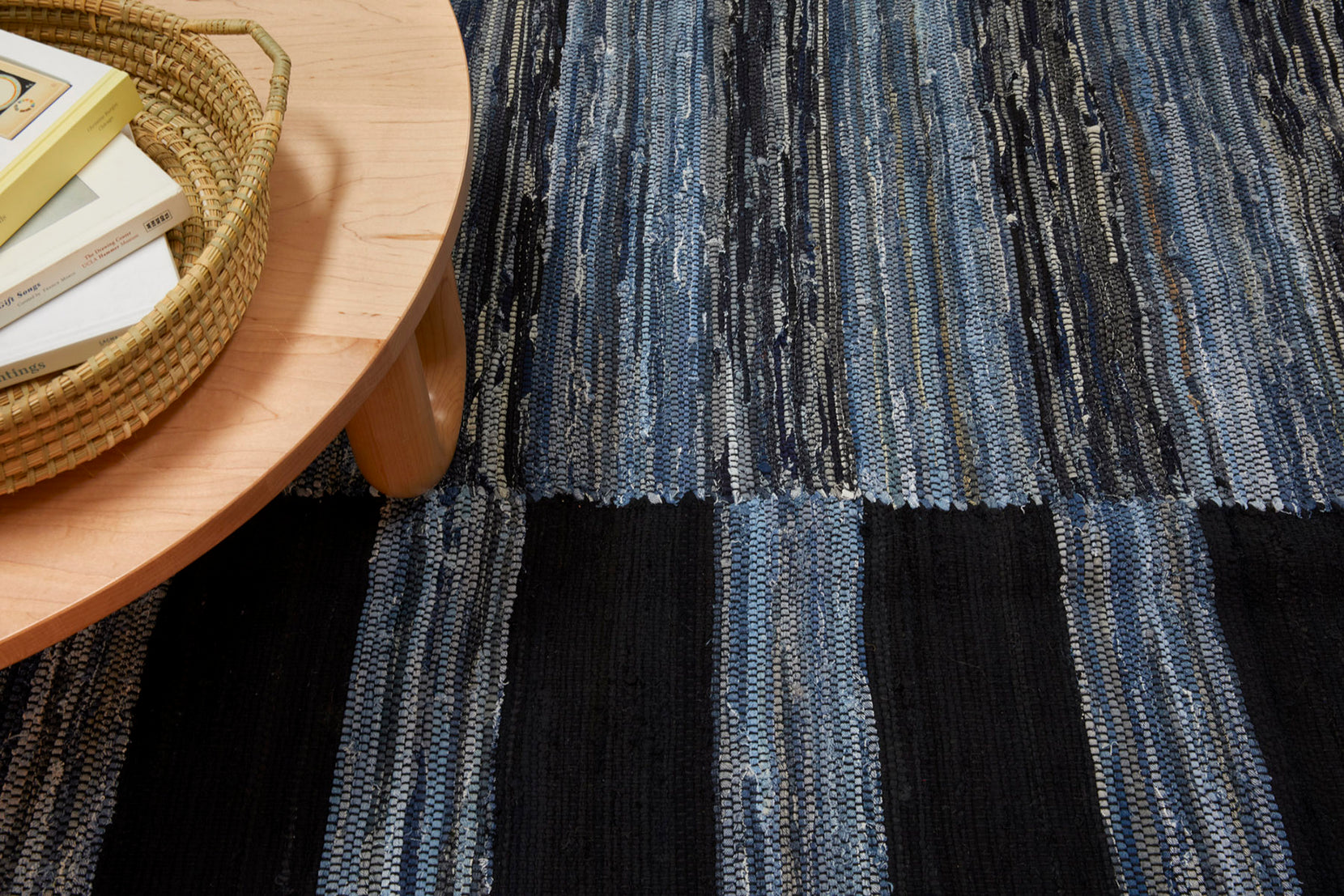 Washable flatweave rug handwoven of recycled denim
