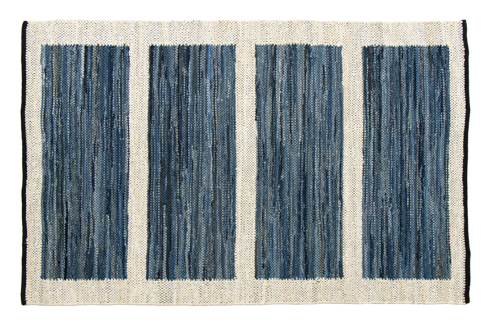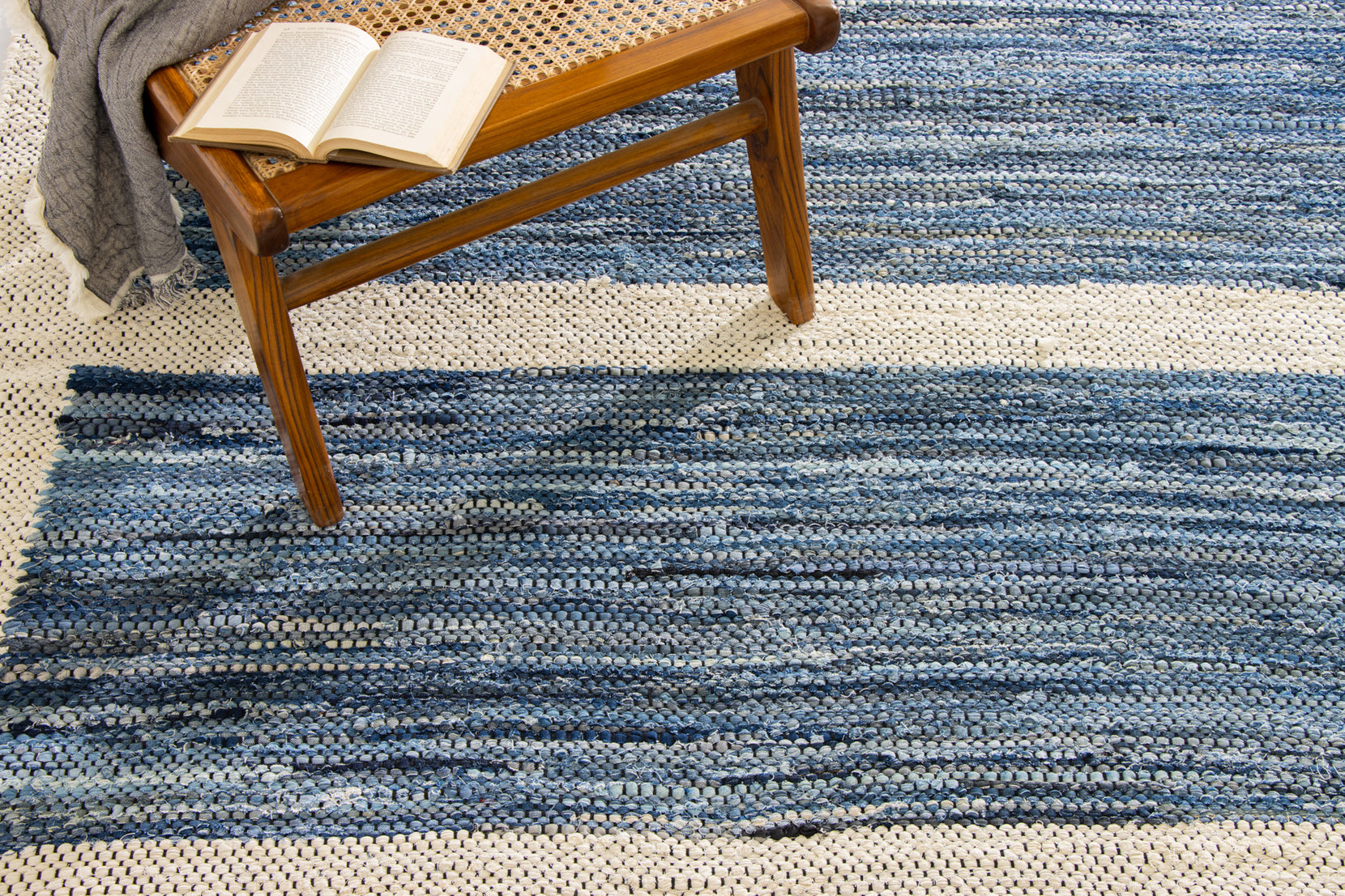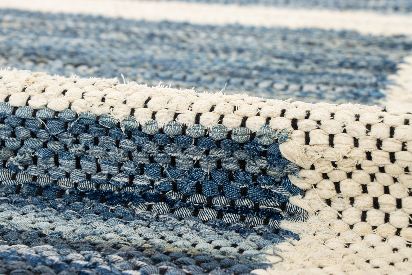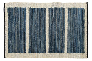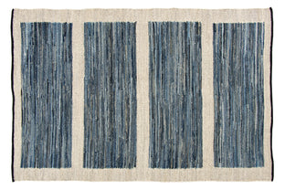Denim is a sturdy cotton fabric whose twill weave creates a subtle diagonal ribbing, which sets it apart from other strong woven cotton textiles. In this piece, the weft is made of upcycled denim remnants left over from fashion industry production houses, and it's handwoven onto a cotton warp. Cotton is a vegetable fiber widely used across rug traditions because of its strength and longevity-it gets softer and more lovely with every wash.