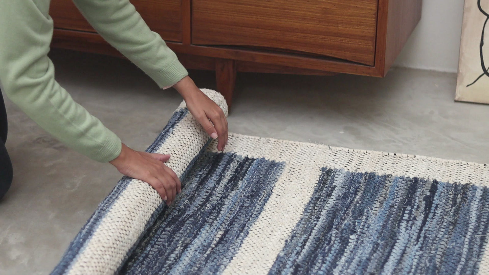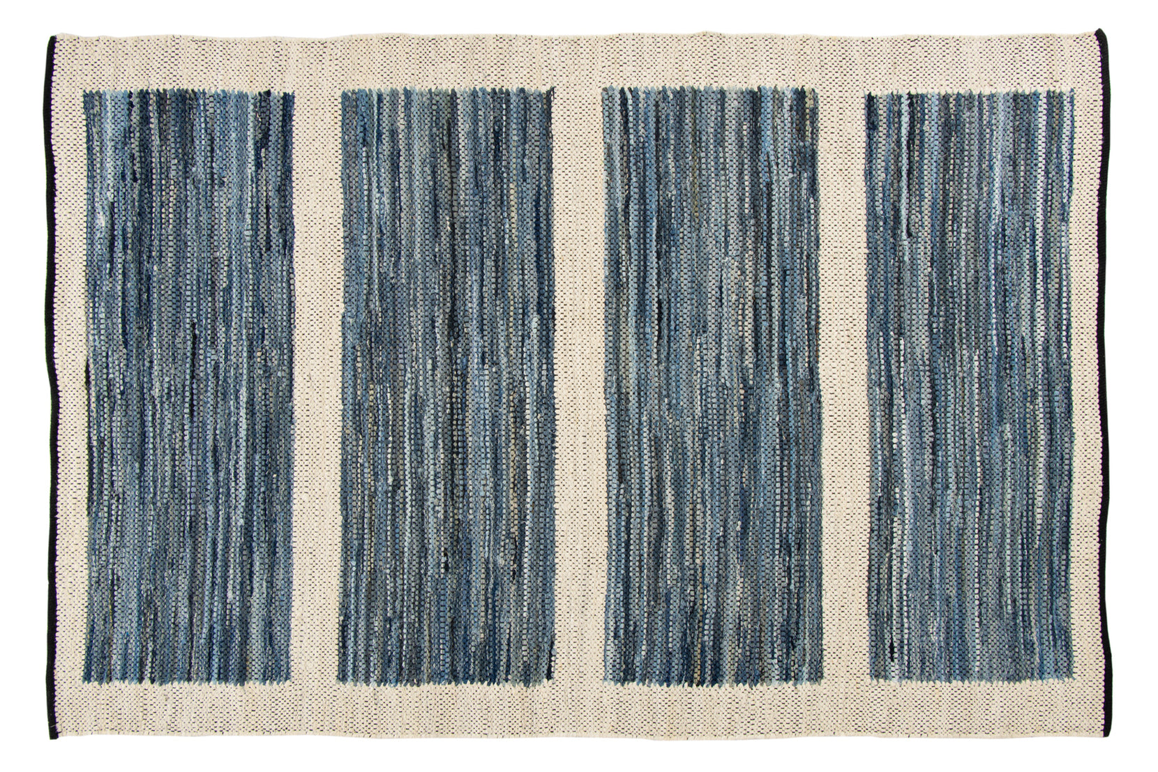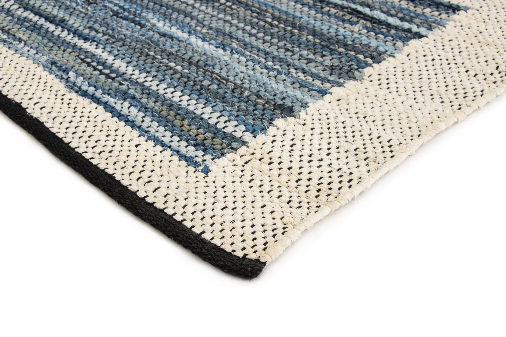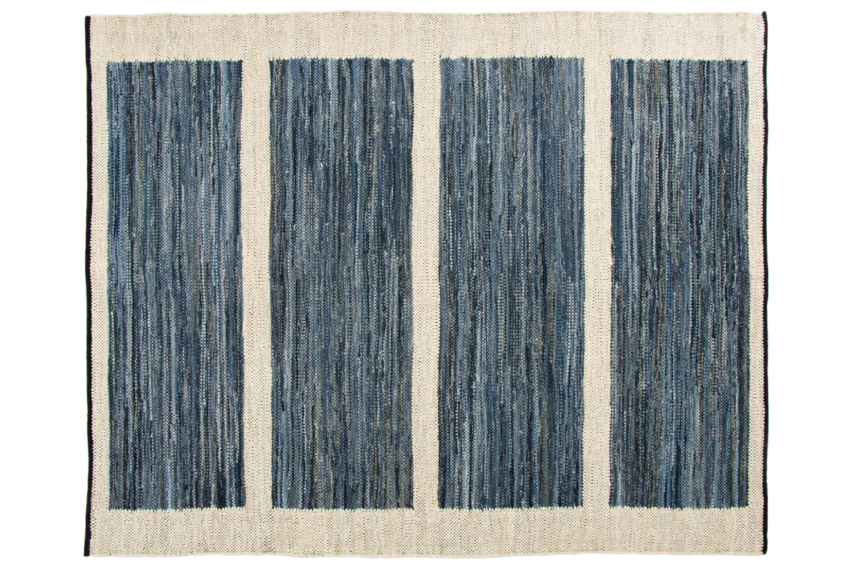 Denim is a sturdy cotton fabric whose twill weave creates a subtle diagonal ribbing, which sets it apart from other strong woven cotton textiles. In this piece, the weft is made of upcycled denim remnants left over from fashion industry production houses, and it's handwoven onto a cotton warp. Cotton is a vegetable fiber widely used across rug traditions because of its strength and longevity-it gets softer and more lovely with every wash.