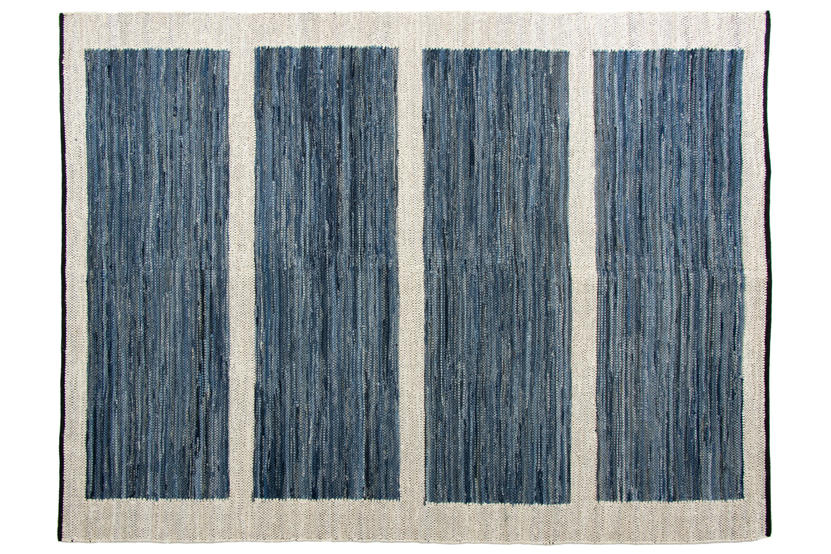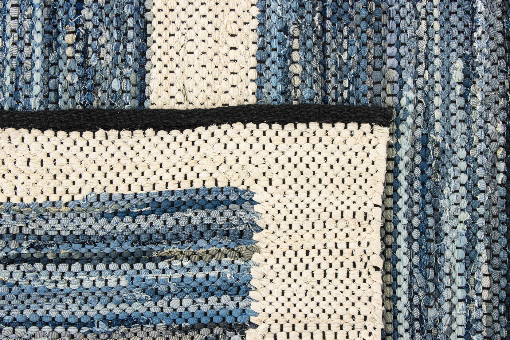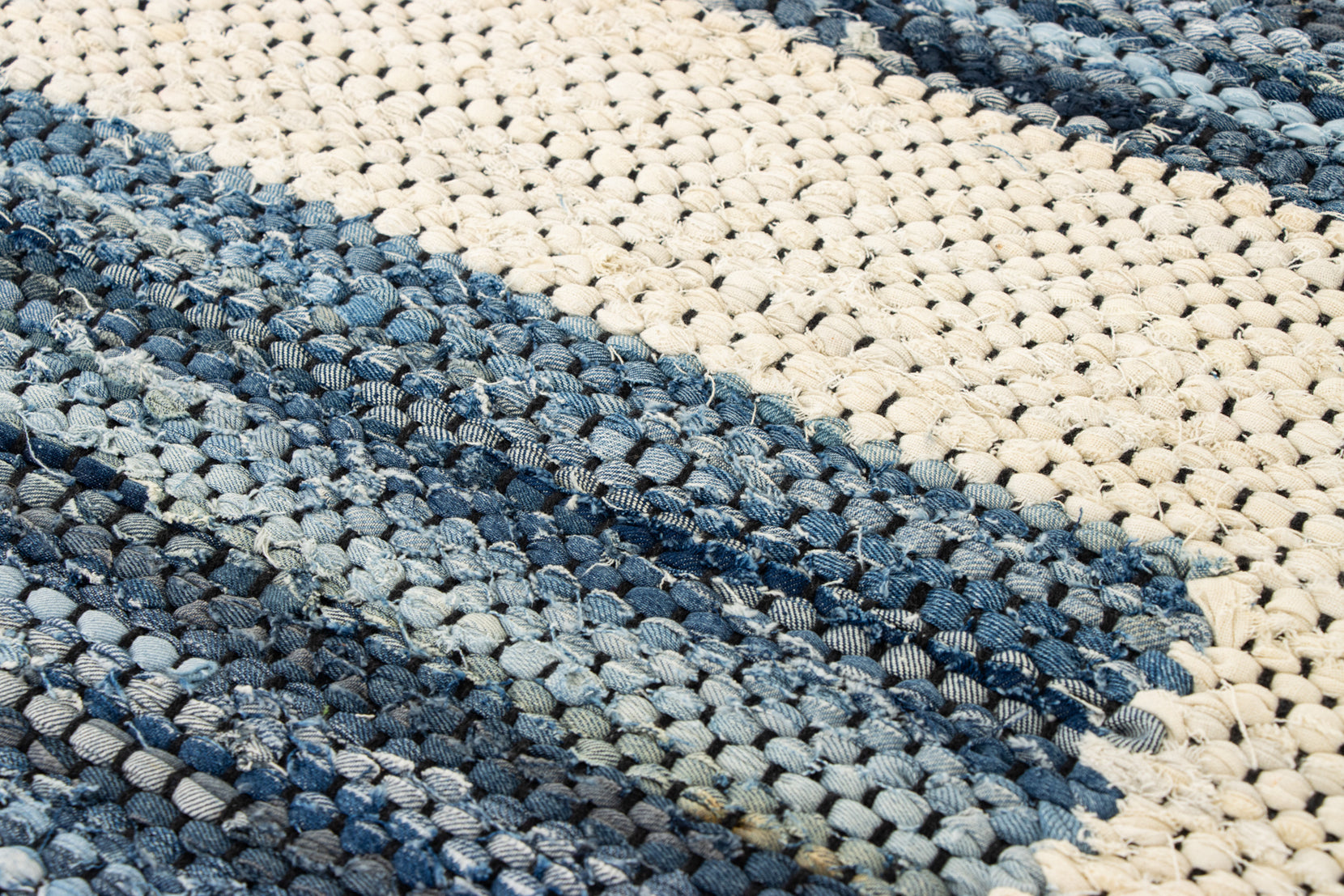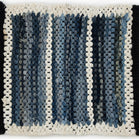 This collection was constructed with a rag rug technique, which is an age-old method of transforming textiles into something new. Topstitch has a creamy white field with medium-blue rectangles laddered throughout.