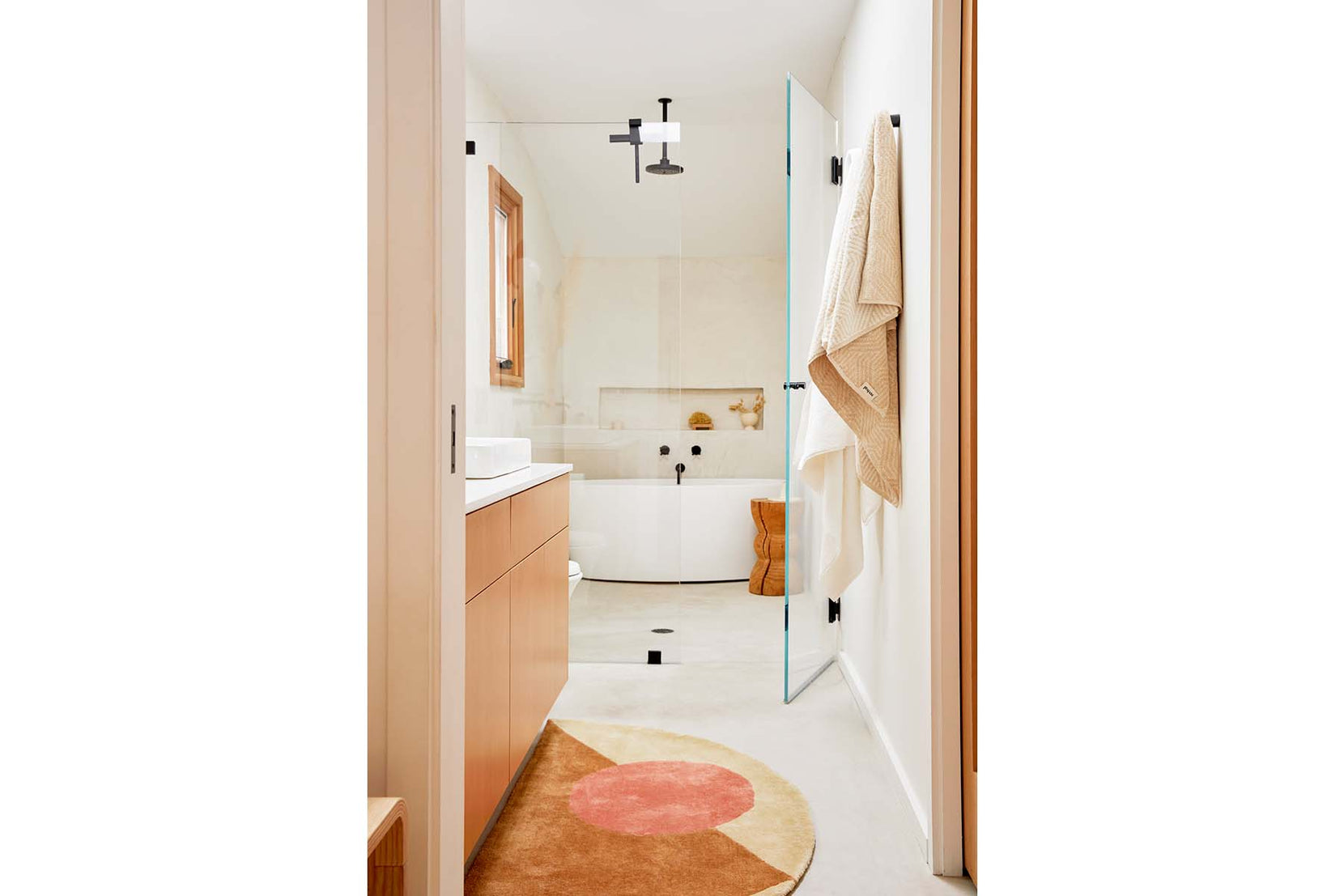 Color development was tricky as we originally started with just natural colors, but they were mucky. So we livened up the palette, ultimately creating designs which work well with our vintage pieces while introducing a playful geometry. Chamallow's shape makes it extremely versatile, charming, and easy to move. Because it's so light, kids can move it too. We think it works really well in the bathroom, and because it's cotton it dries quickly.