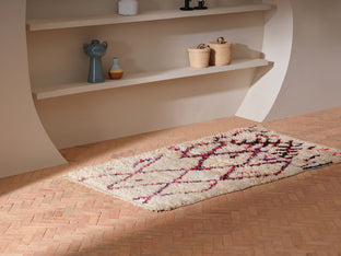 Azilal rugs typically have abstract, painterly designs, and are similar to rugs from Ourika. These pieces can be distinguished by their bright colors, facilitated by the use of cotton in addition to wool.