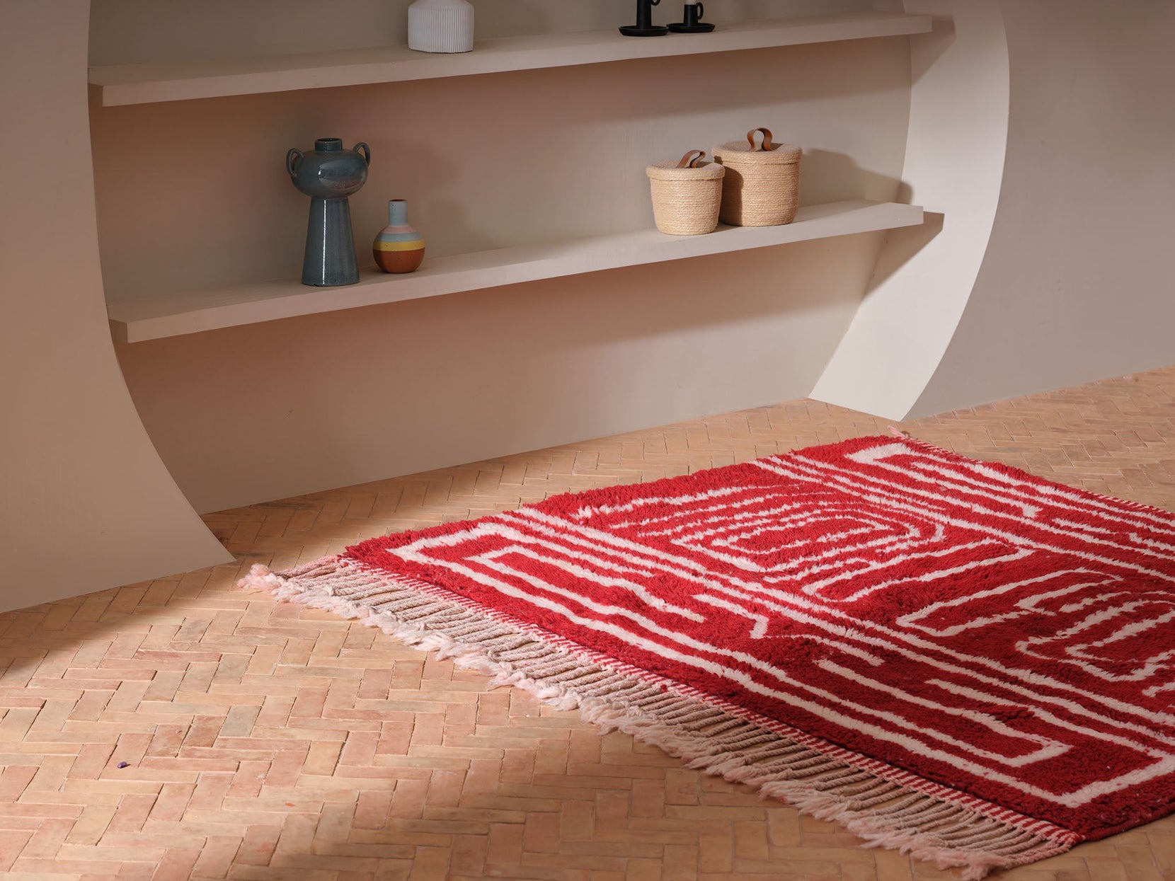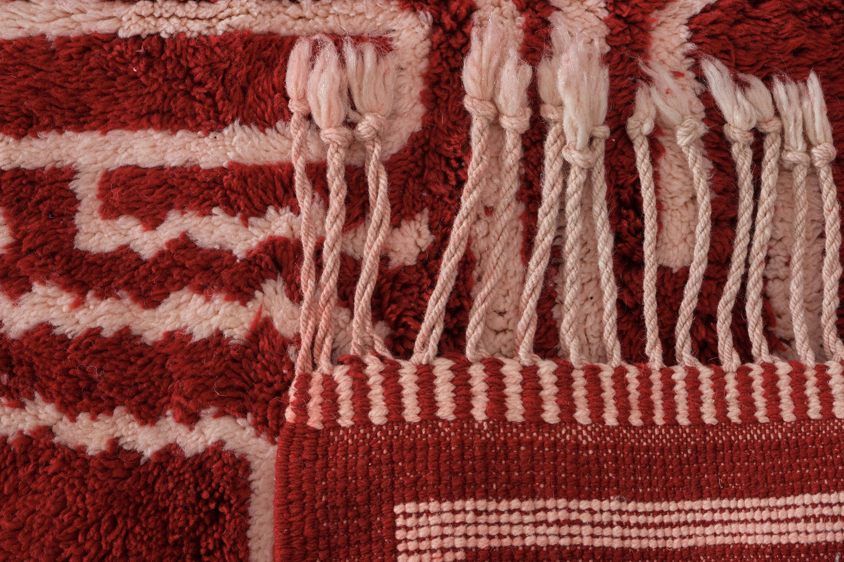 Beni M'rirt descendants live in the town of Aguelmouss, not far from Beni Ourain territory, whose influence is visible in their rugs. Originally intended for use on the floor, Beni M'rirt pieces often feature meandering geometric designs and use a tight double knot construction.