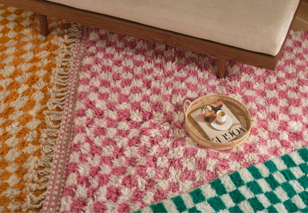 Moroccan wool is locally sourced and produces a thick, strong pile that feels soft and fluffy underfoot. A small amount of shedding is to be expected from this natural fiber, but it’s worth it: its high pile is beloved for its wild, tousled texture. You may find traces of dried hay, grass, or straw in your rug as grazing sheep often collect plant matter in their coats. Remove gently by hand or with tweezers. Please note that when wool gets damp, it will smell like a wet sheep. This is the scent of lanolin, which acts as a waxy barrier against dirt and moisture.