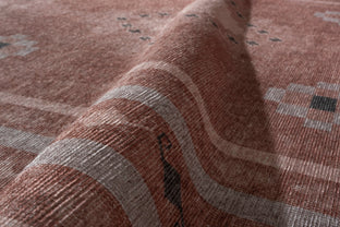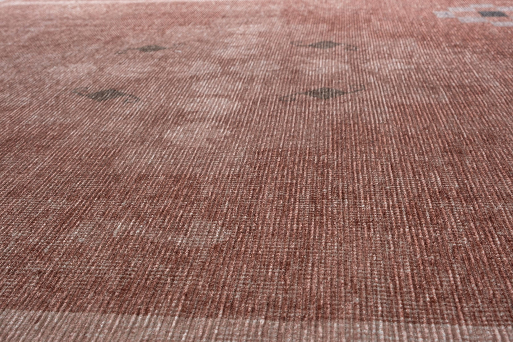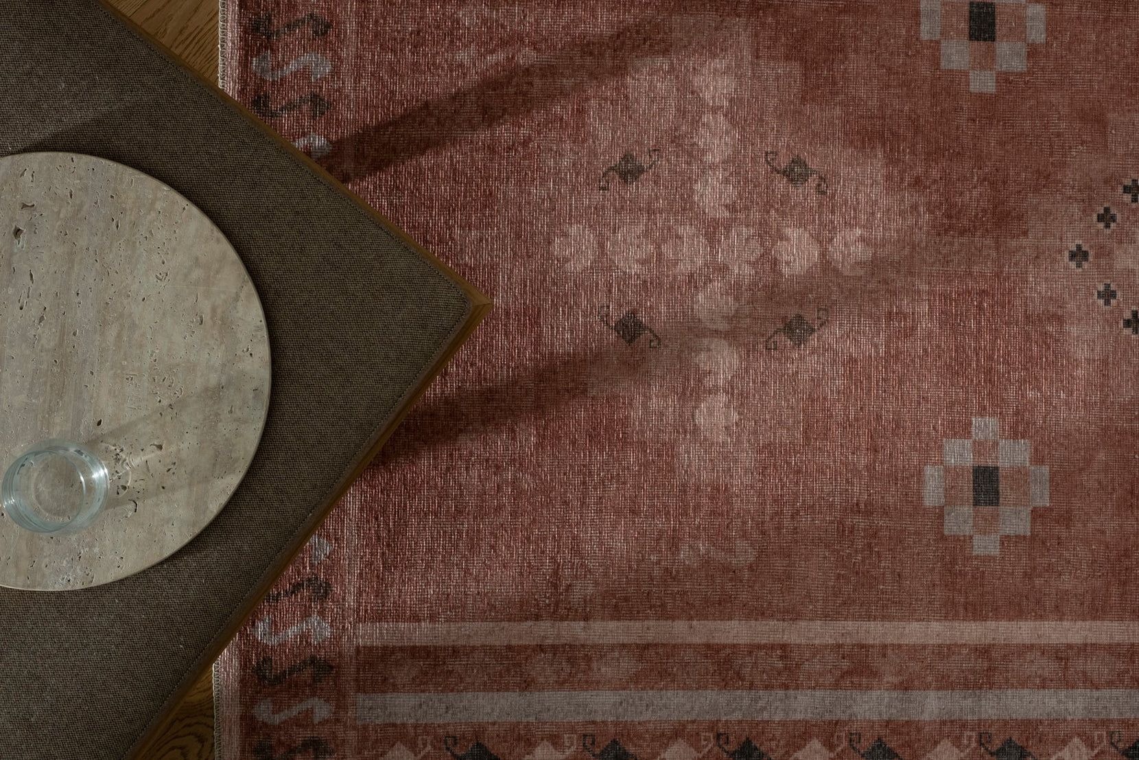 - Color palette: rust red, faded brick, tan, terracotta, charcoal, dusty rose pink, dove gray
