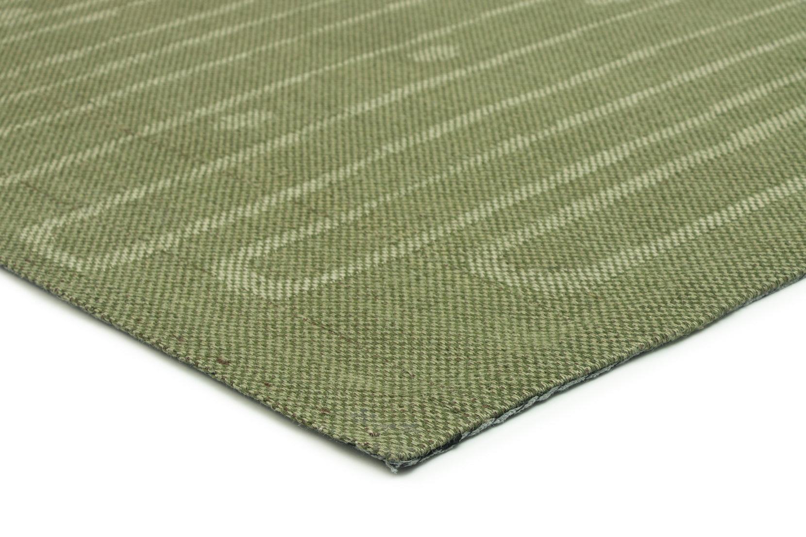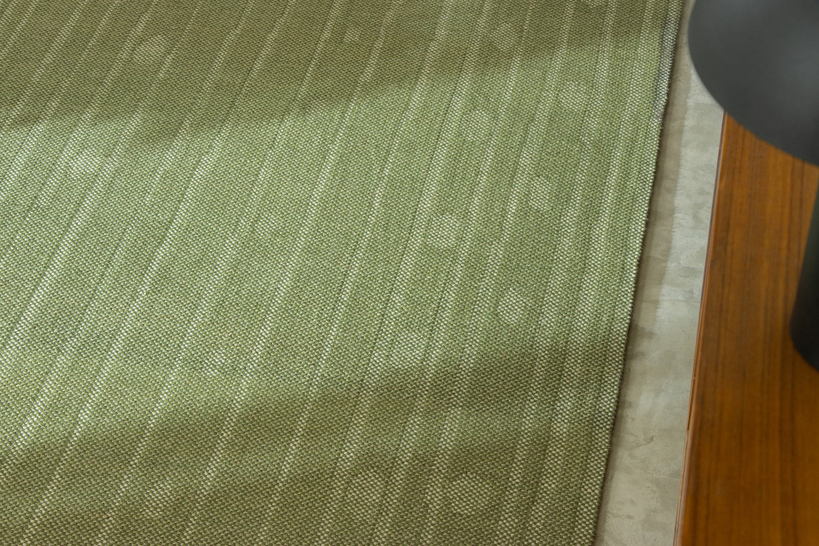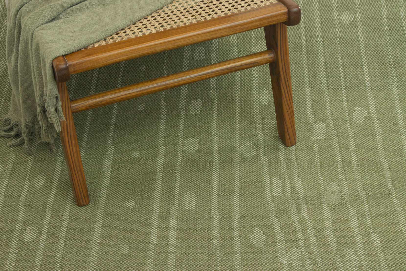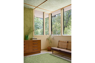 In this piece, jute, wool, and polyester are blended for texture. Jute is a natural fiber with a golden sheen, known for its tensile strength and versatility. Wool has a hydrophobic layer which repels dust and dirt, as well as lanolin, which provides its trademark luster and protects it from breaking or shedding. Polyester is extremely soft and durable, and beloved for its pleasing drape and ease in dying. Finally, a cotton backing adds stability and strength.