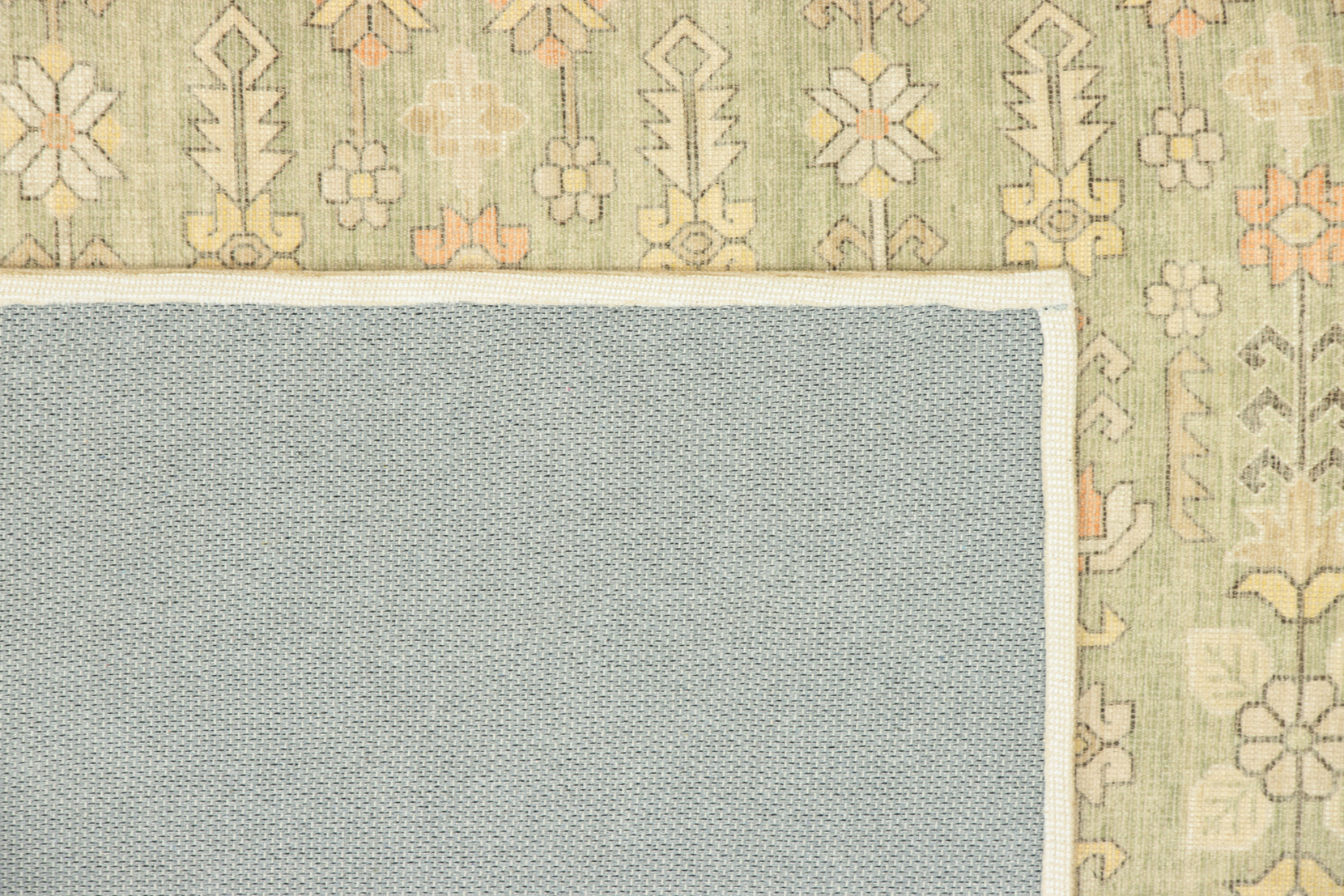 Our polyester is highly durable, mildew-resistant, and machine-washable. In this piece, it's combined with cotton for extra durability. Cotton, a vegetable fiber, is widely used across rug traditions because of its sturdiness and longevity. Finally, a recycled cotton backing makes it both strong and supple.