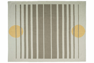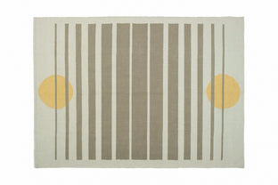 Cotton dhurries are classic Indian flatwoven rugs, designed to be lightweight and portable, cold in summer, warm in winter. Stripes are a standard dhurrie design, and ours are no exception. Leaping features a balanced circle at either end, like egg yolk suns, overlaid by stripes of varying width.